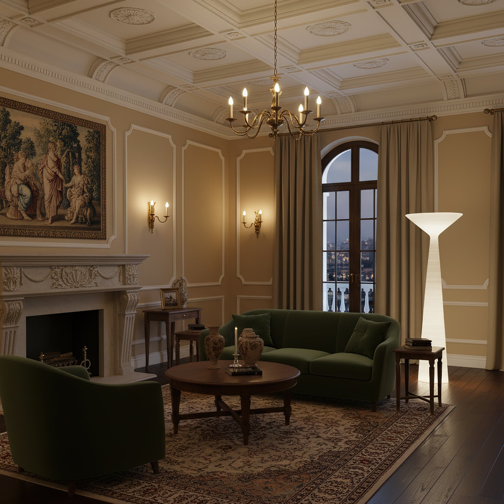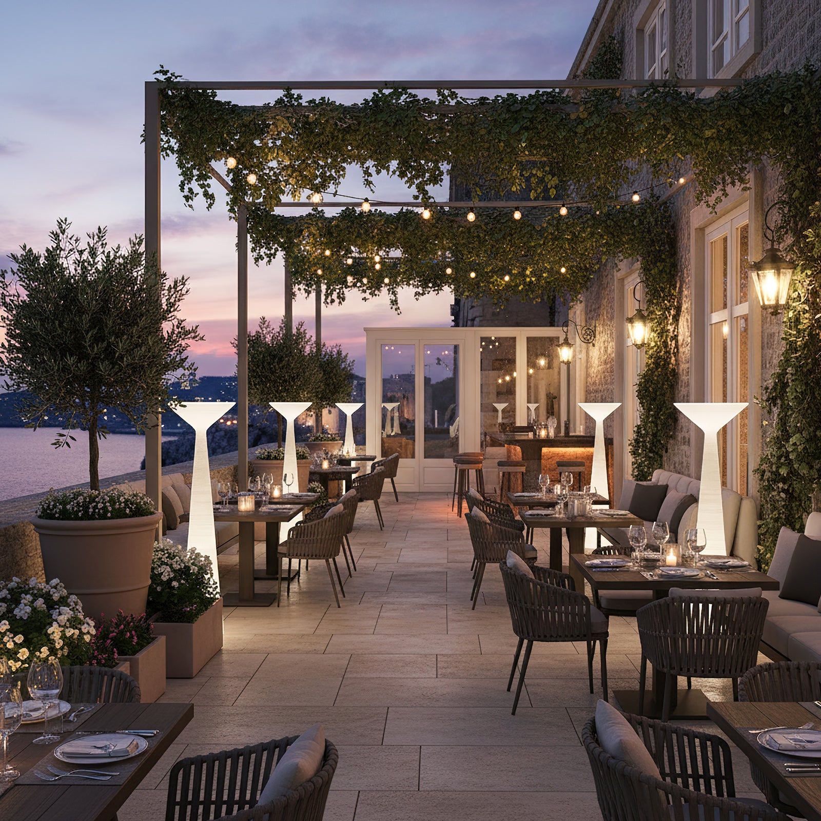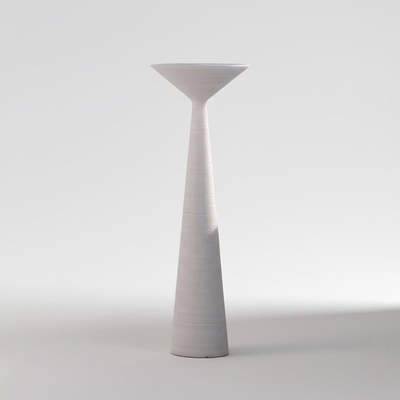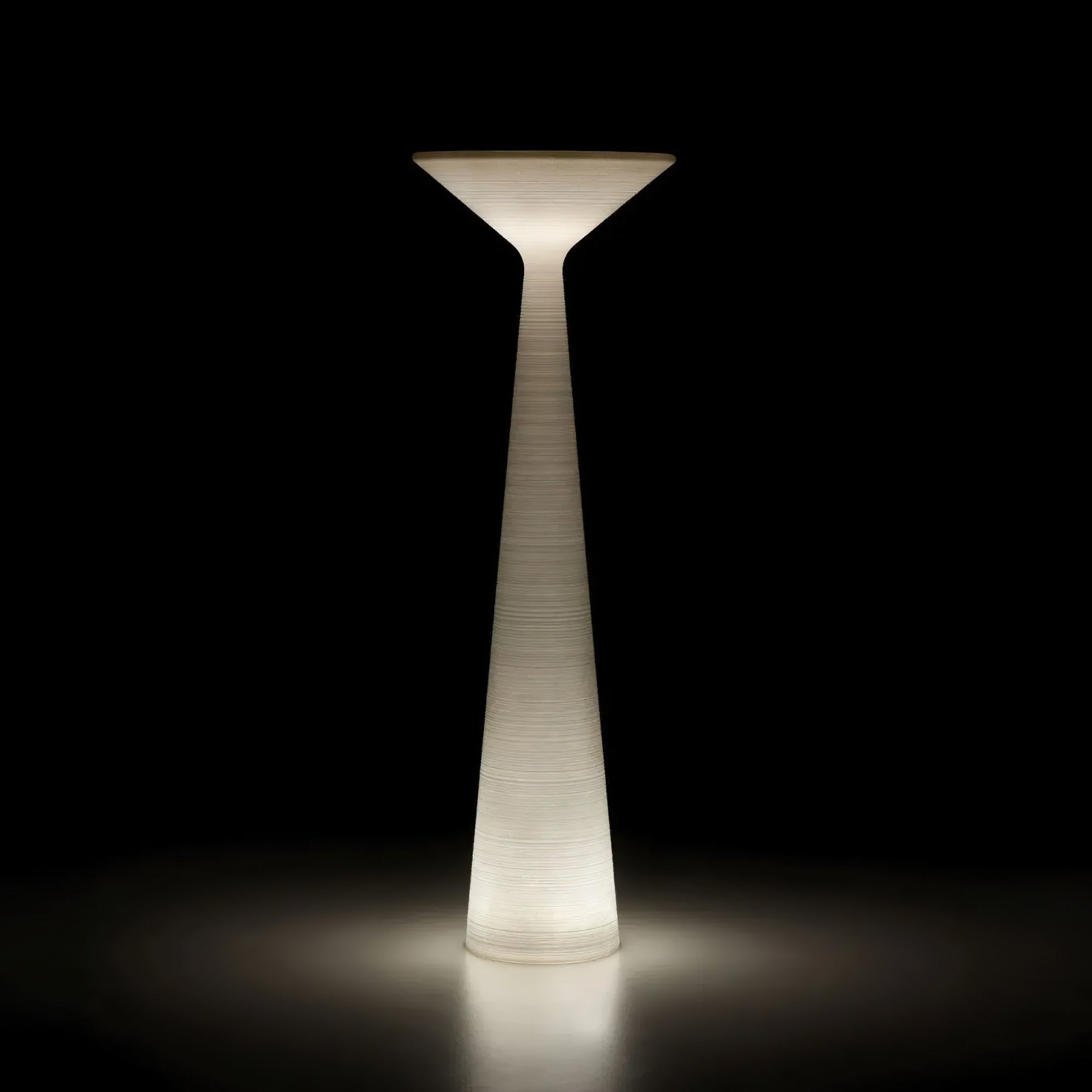 The Tebe floor lamp features a refined silhouette and emits light that envelops its entire form, evoking the appearance of a Greek column. Its timeless geometric design is reinterpreted with a modern sensibility, enhanced by a textured surface that gives it a tactile quality, resembling a carefully carved stone column.