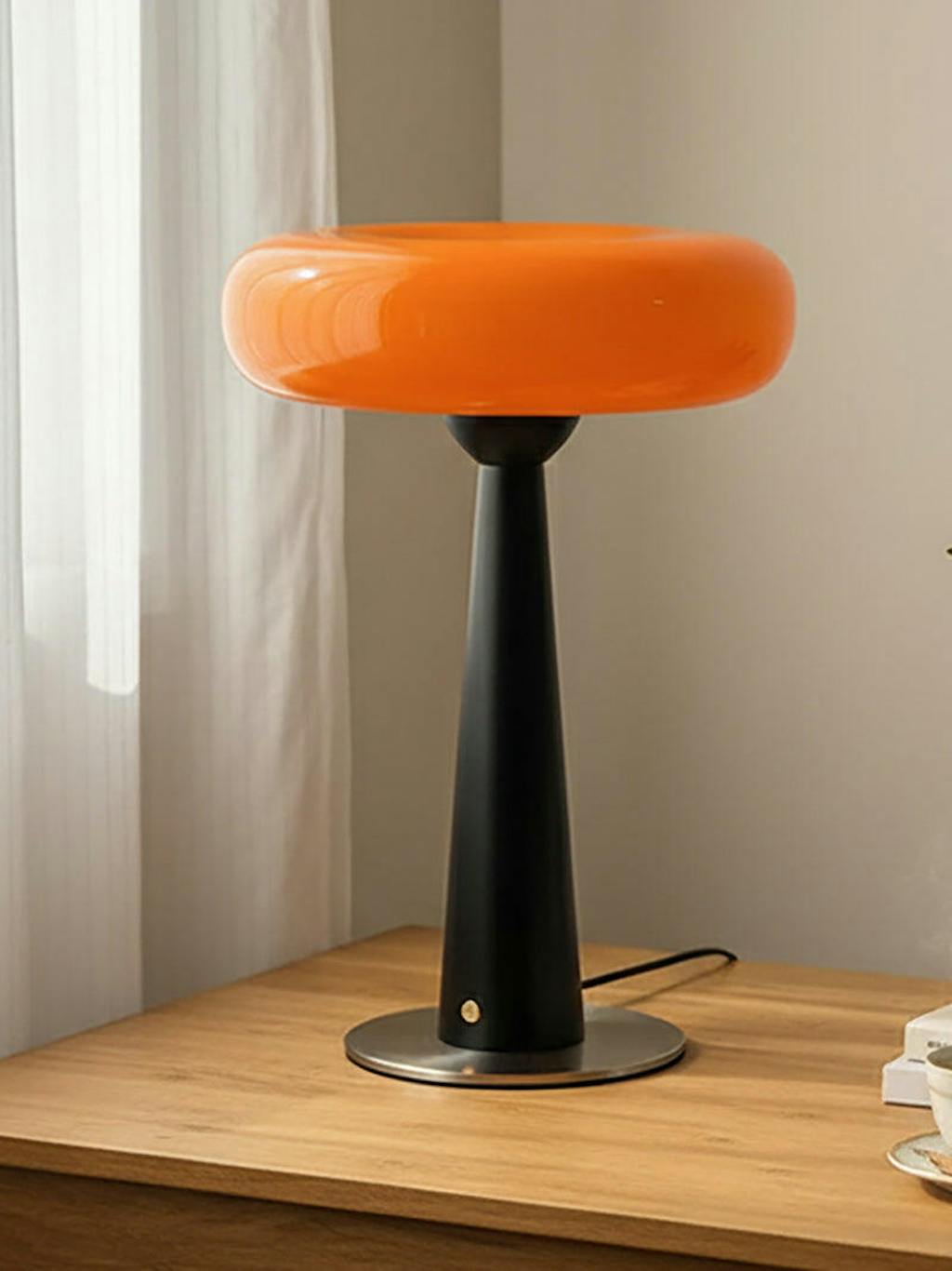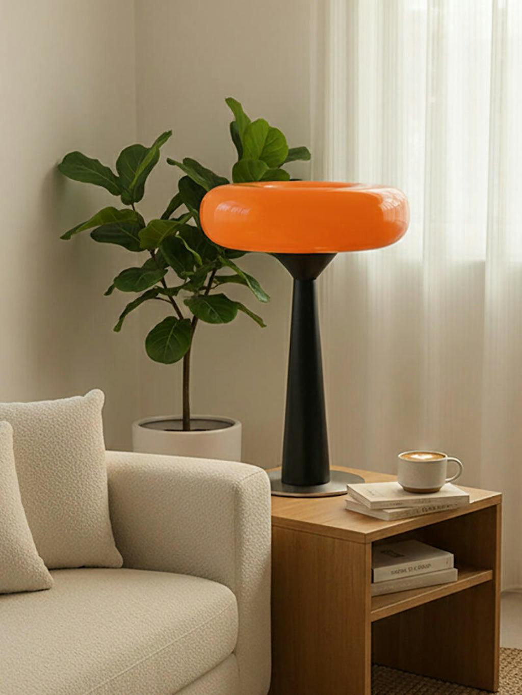 The Donut Table Lamp, with its bold color and sculptural form, perfectly captures the aesthetic of mid-20th-century design. The striking orange glass shade, shaped like a donut, features a central recess that not only serves as a focal point but also cleverly directs light, creating a soft and atmospheric atmosphere. Whether used as focal lighting or a decorative element, it adds a playful and sophisticated touch of color to any interior.