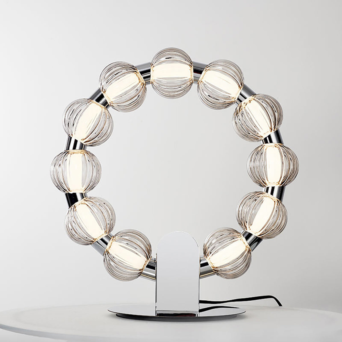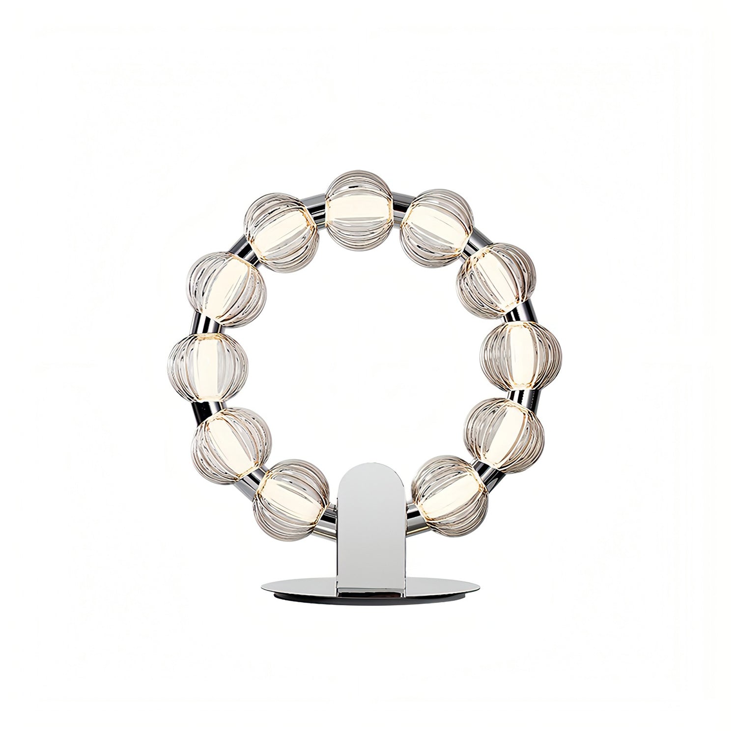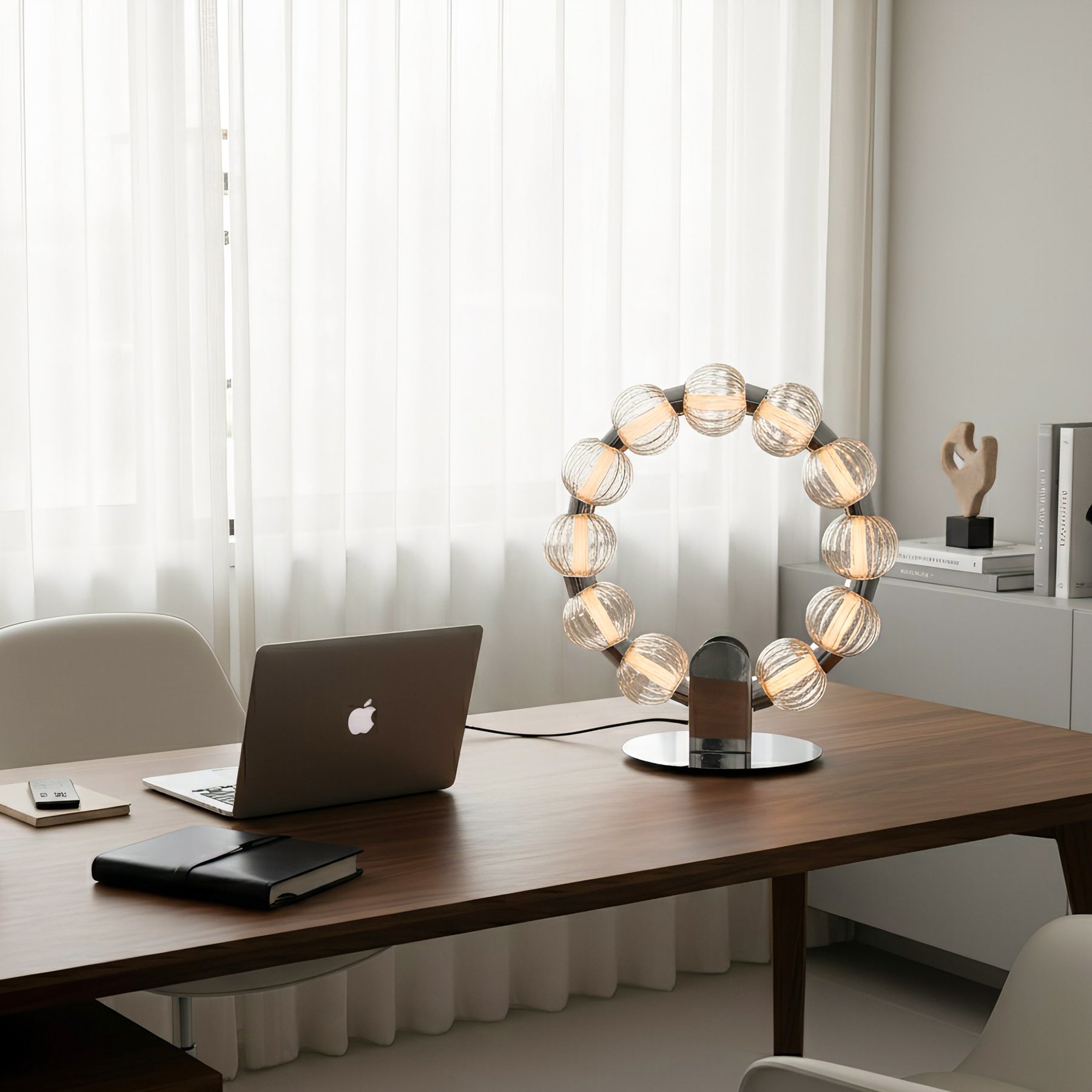 The Amulet Table Lamp merges traditional African joss imagery with advanced lighting technology to evoke a timeless sense of domestic ambiance dating back to prehistoric times. Its handcrafted glass beads adorn a chain base crafted from contemporary acrylic and LED components, ensuring a soulful illumination that enhances any modern interior.