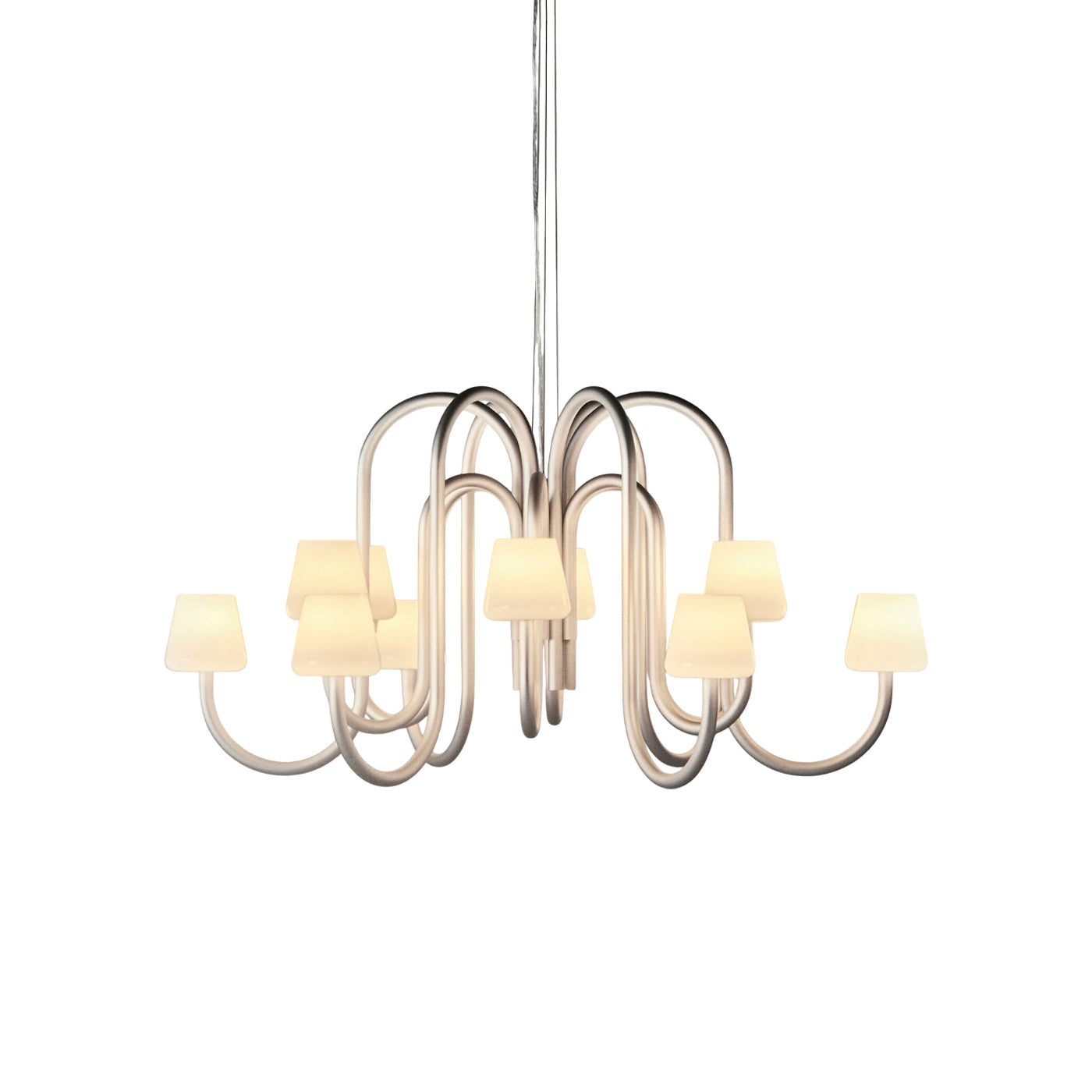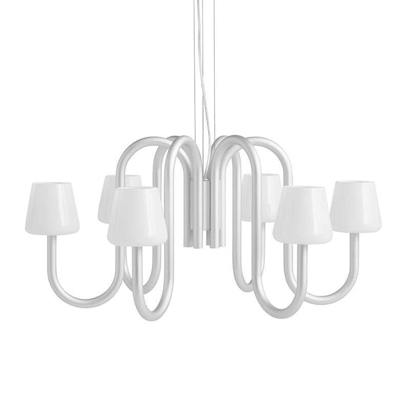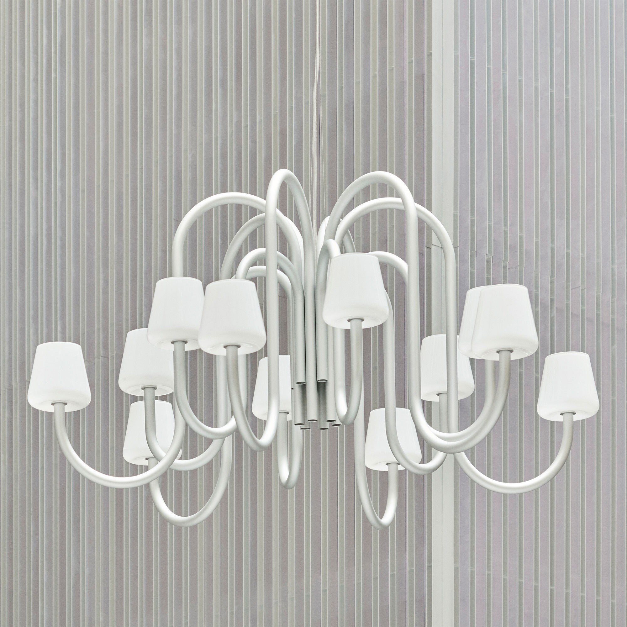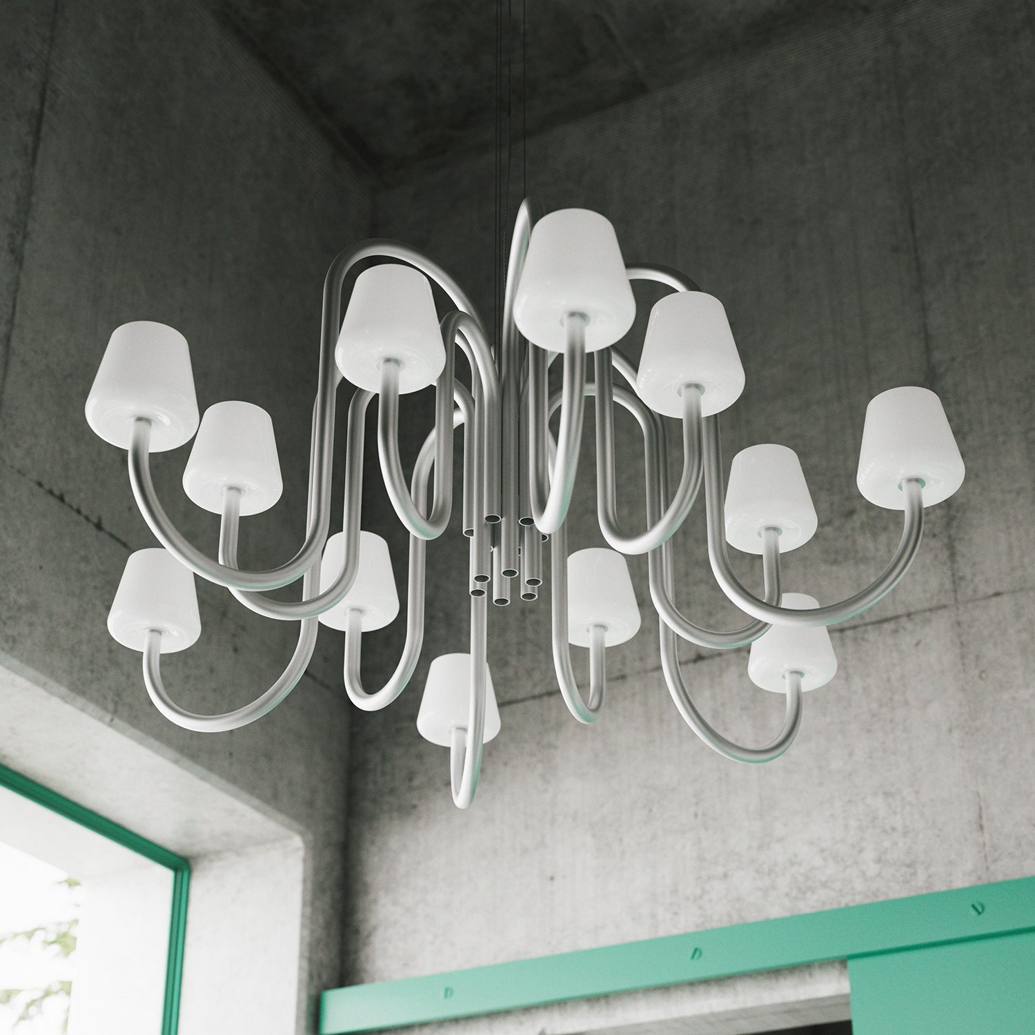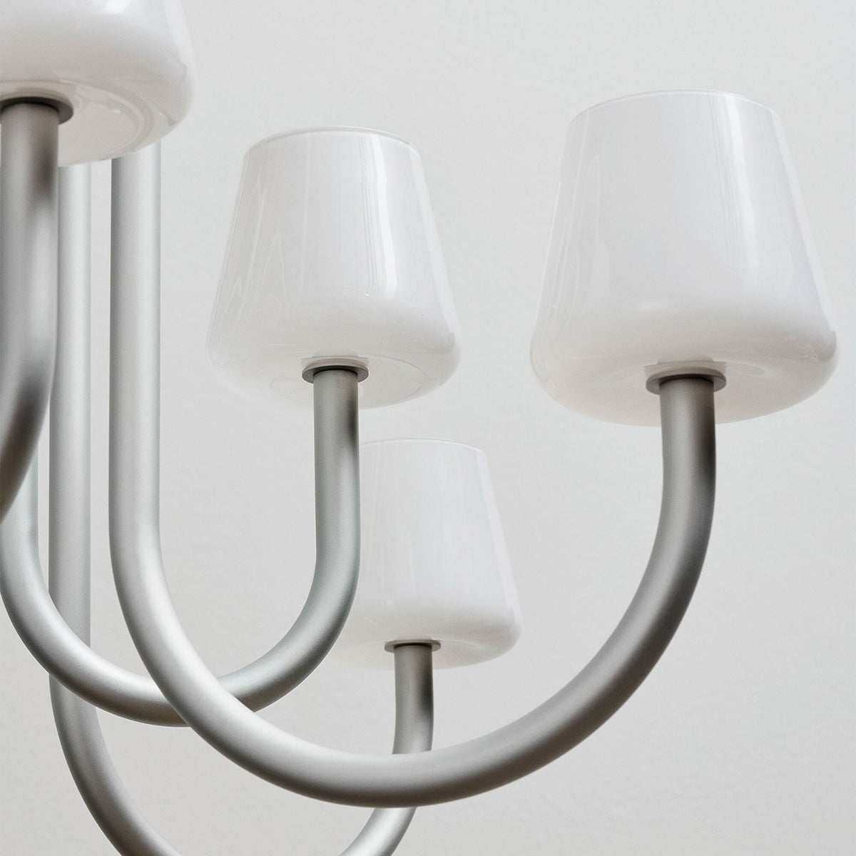 The Apollo Chandelier features a distinctive blend of industrial and modern elements. It showcases several mouth-blown opal glass shades arranged on gracefully curved tubular arms, highlighting the contrast between the artisanal, organic forms of the shades and the sleek brass framework. This chandelier serves as a striking focal point, perfectly suited for diverse settings in both residential and commercial environments.