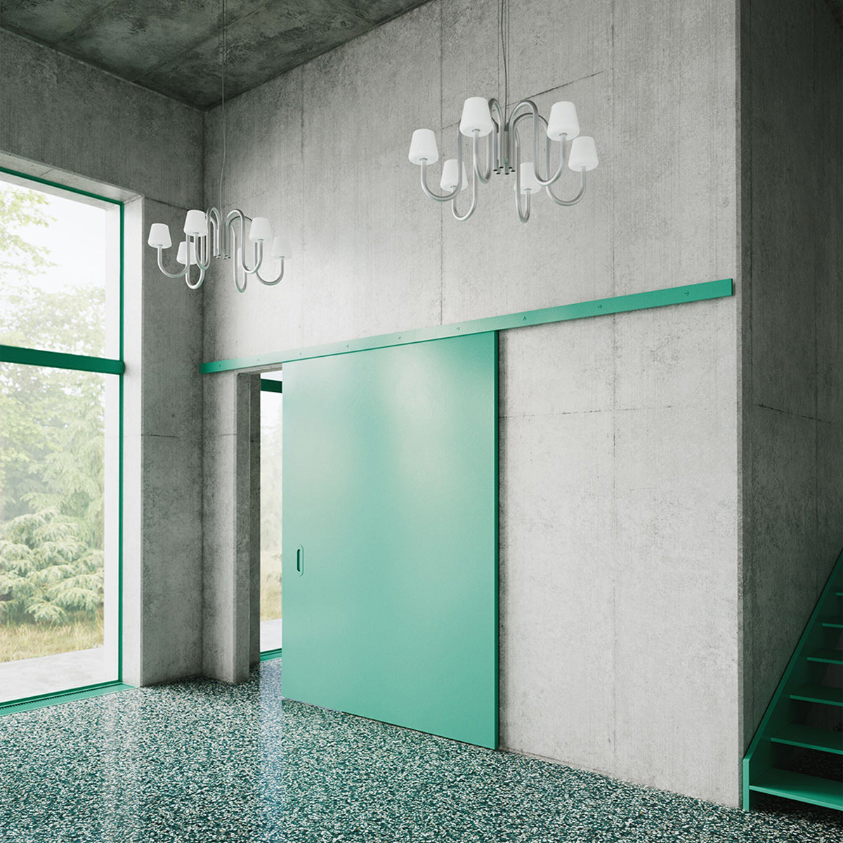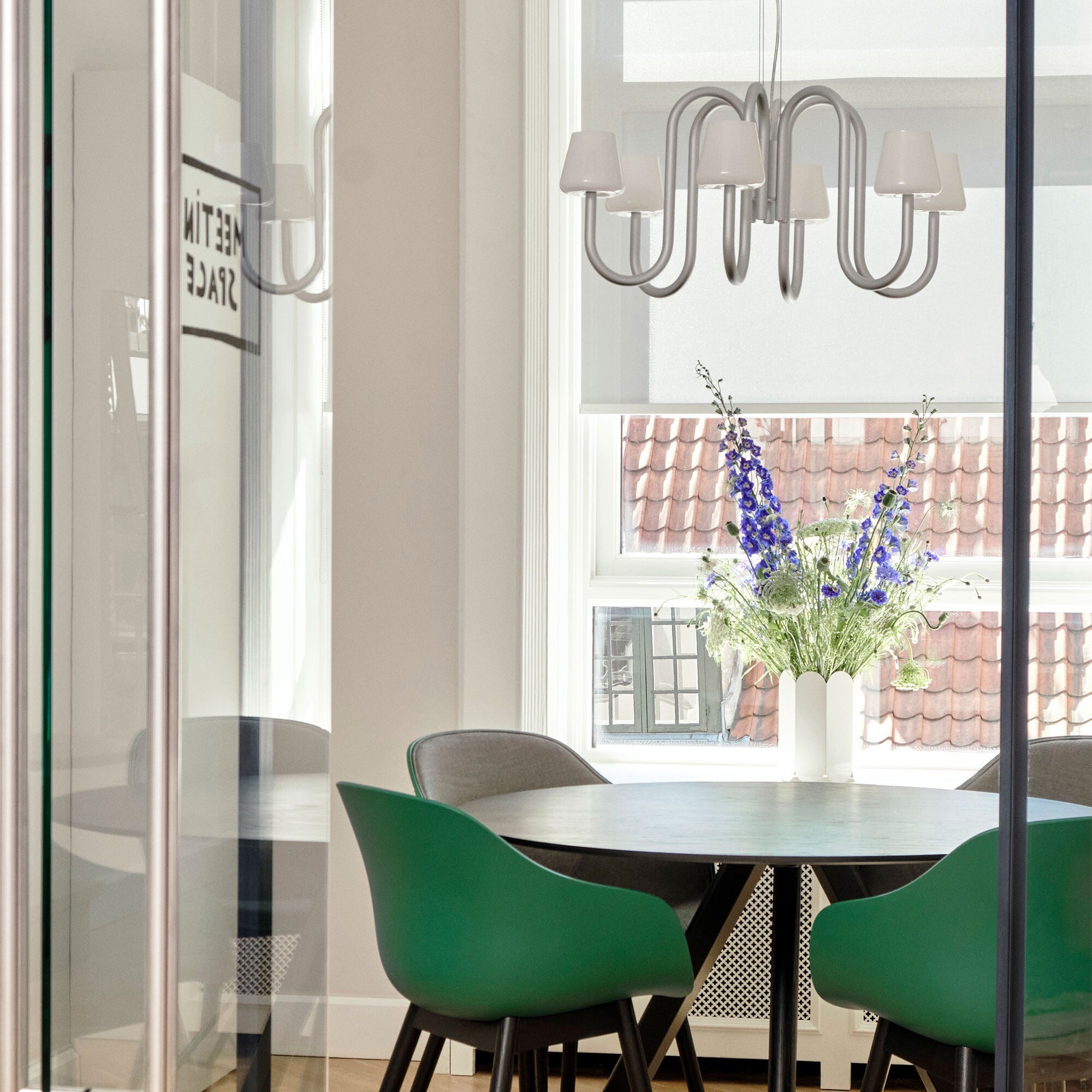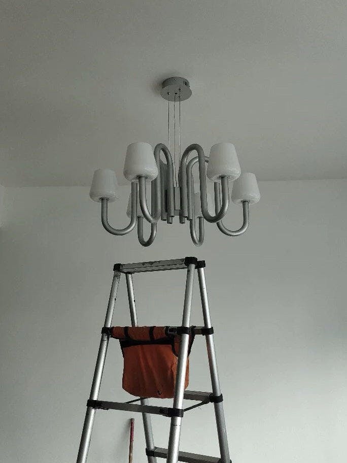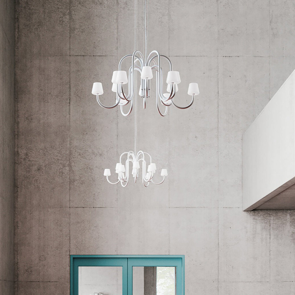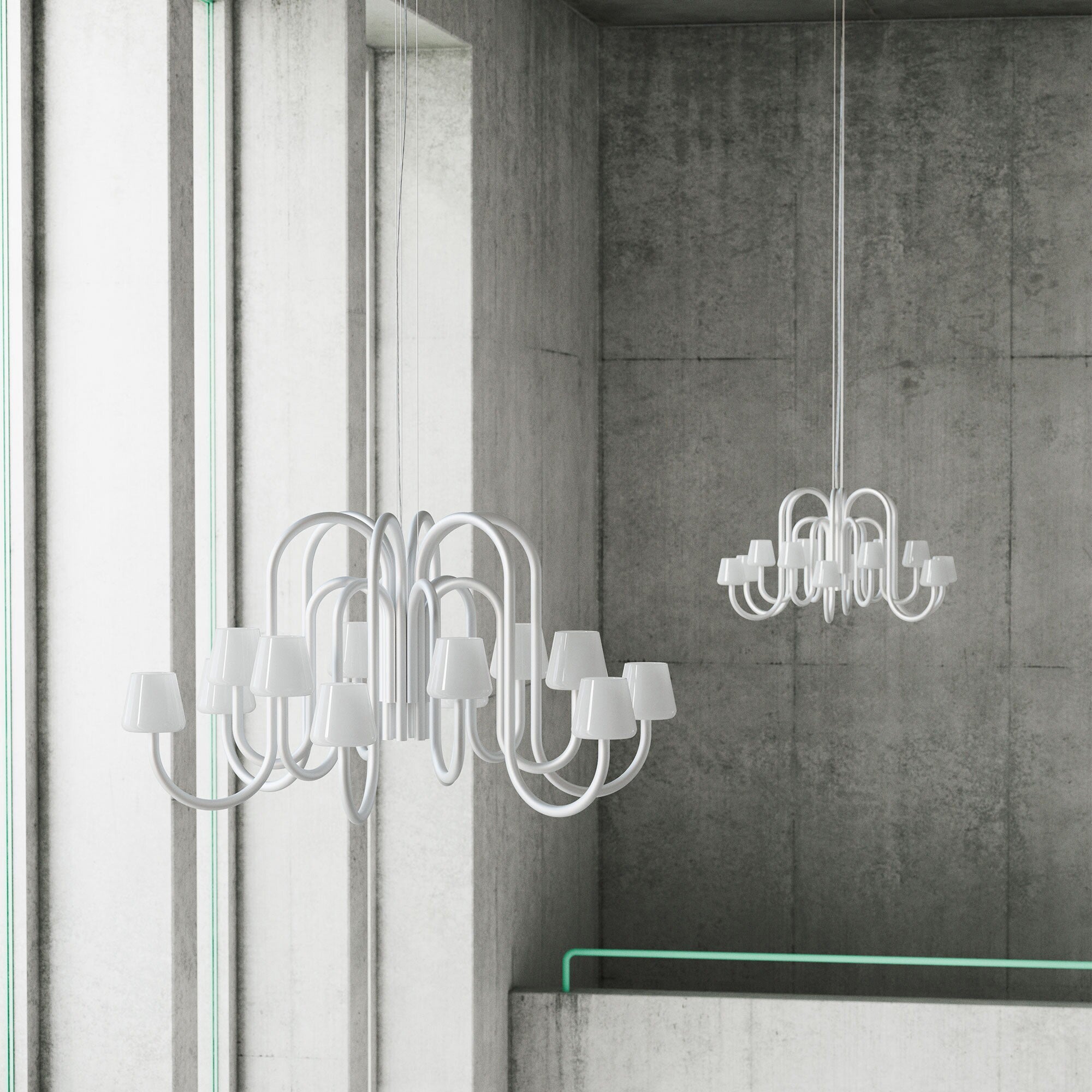 The Apollo Chandelier features a distinctive blend of industrial and modern elements. It showcases several mouth-blown opal glass shades arranged on gracefully curved tubular arms, highlighting the contrast between the artisanal, organic forms of the shades and the sleek brass framework. This chandelier serves as a striking focal point, perfectly suited for diverse settings in both residential and commercial environments.