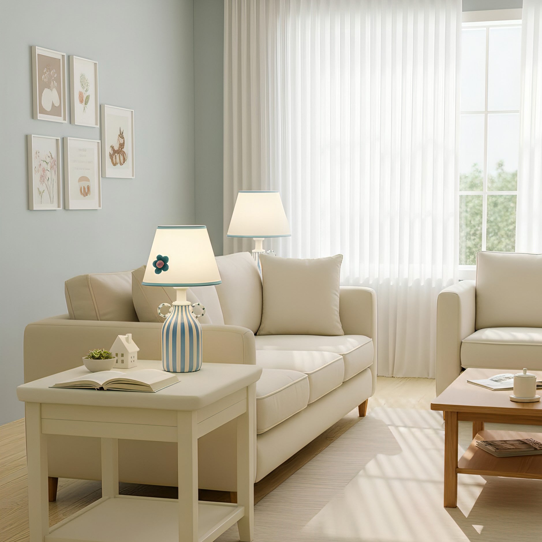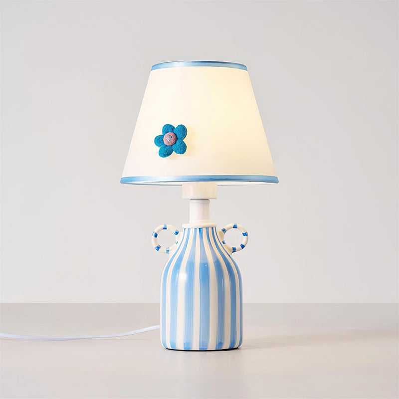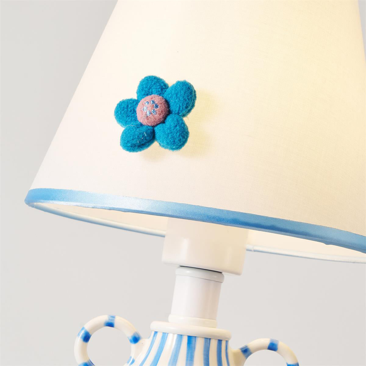 The Blumelo Table Lamp evokes the essence of a serene coastal summer. Its ceramic base is adorned with meticulously hand-painted blue and white stripes. Central to its design is the handcrafted blue felt flower on the lampshade, delivering a distinctive artistic detail and a warm, inviting character.