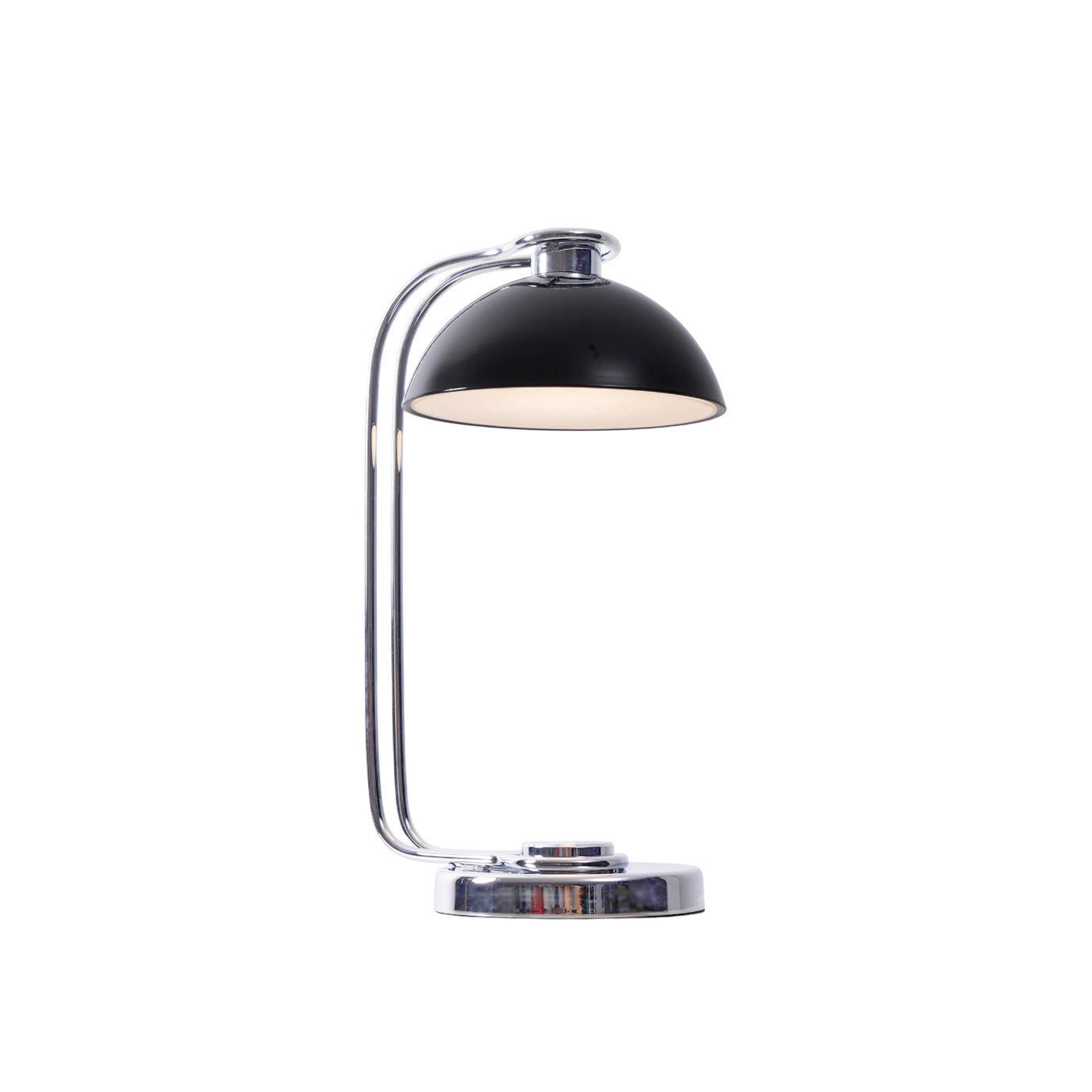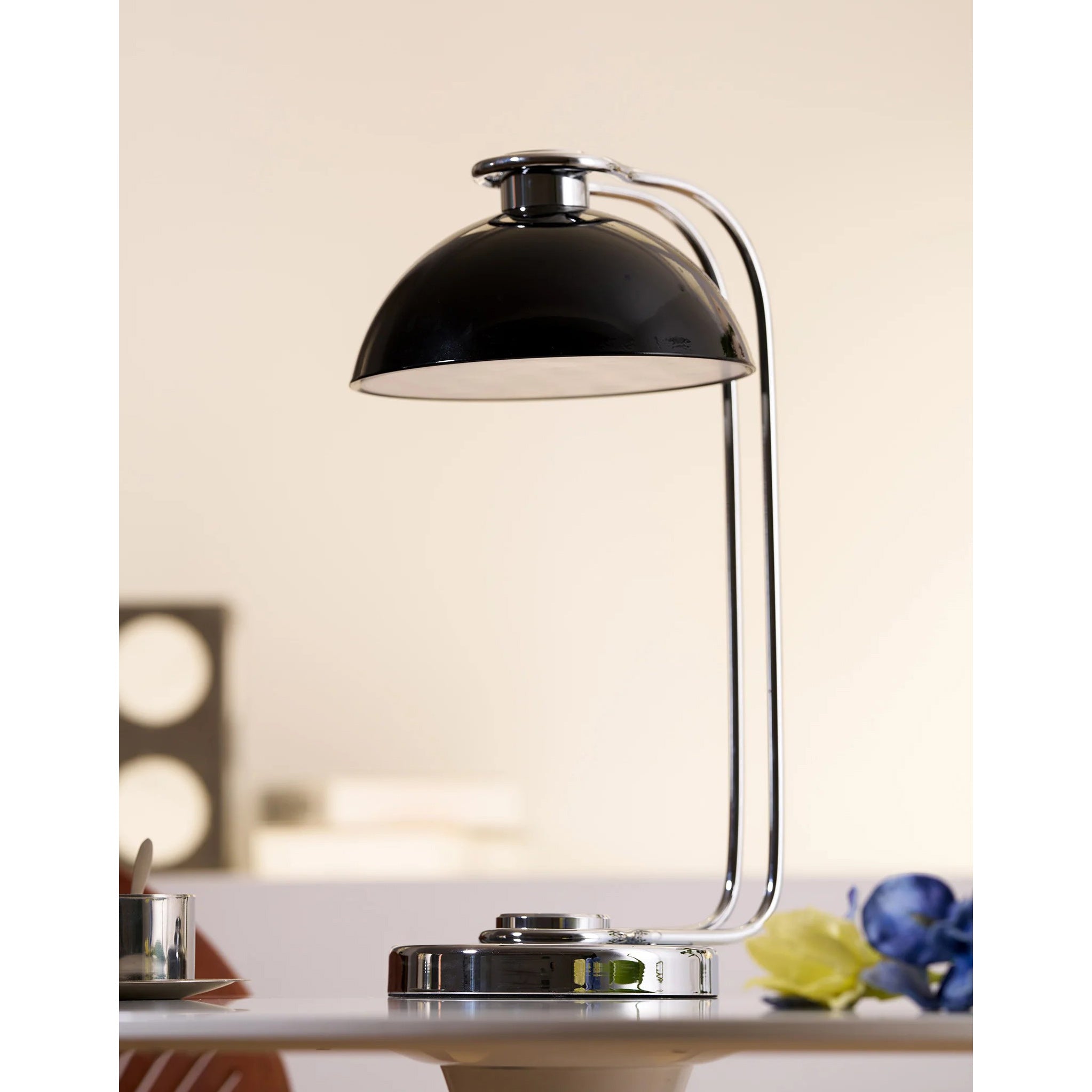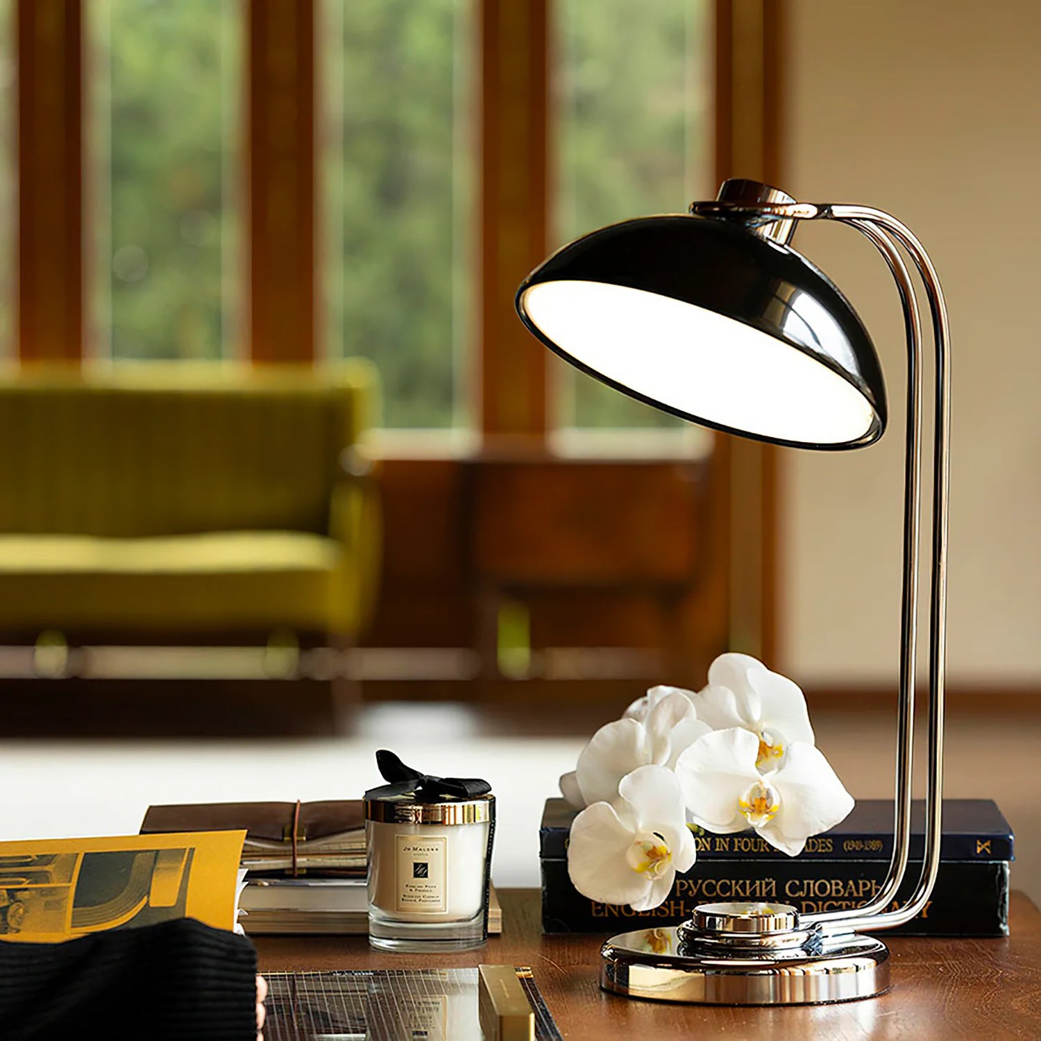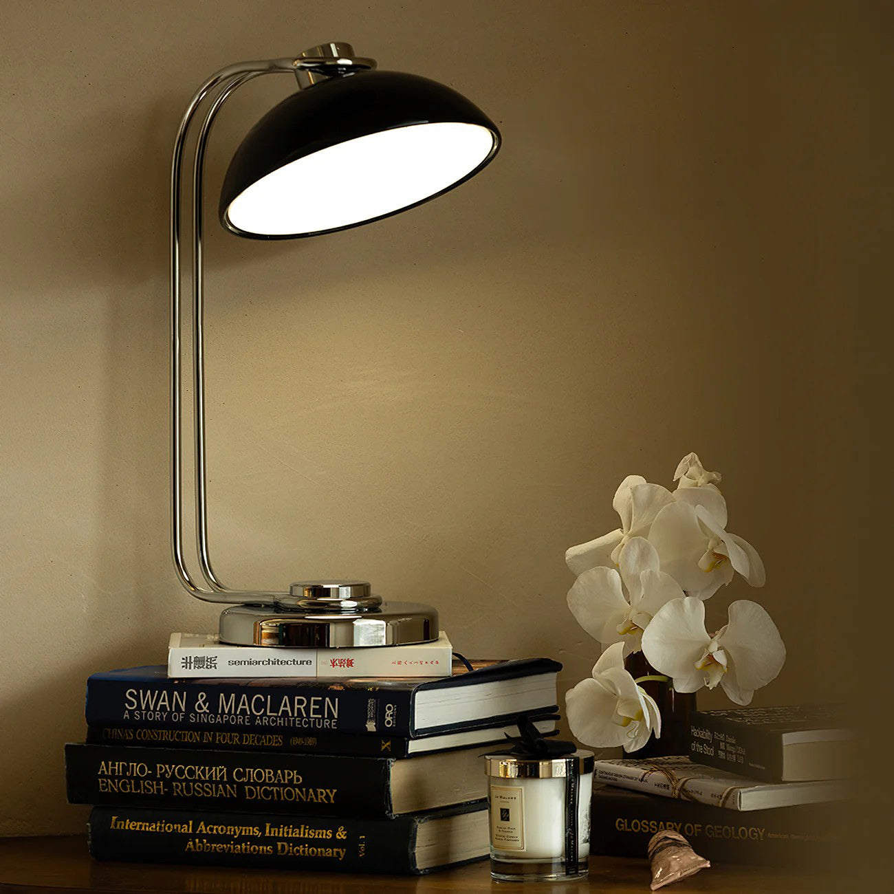 The Domex Table Lamp combines vintage appeal with contemporary elegance. Its glossy black dome shade paired with a chrome-plated curved arm and base delivers a striking, refined look ideal for any desk or reading area.