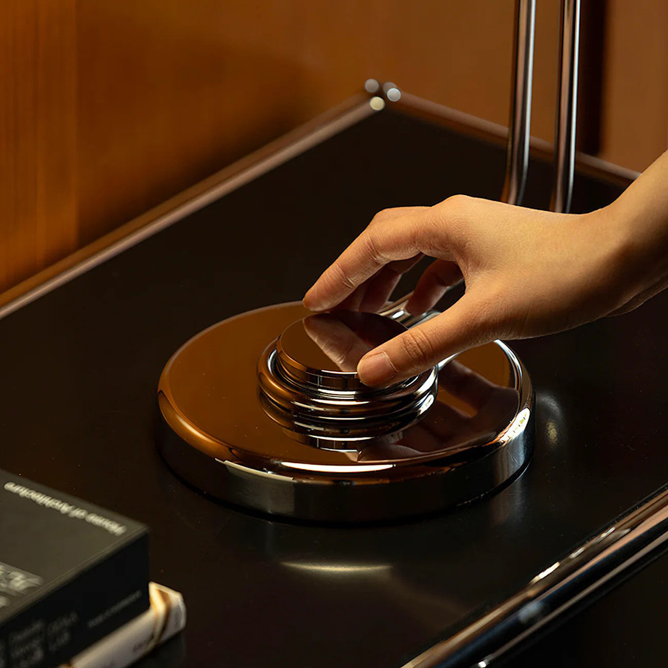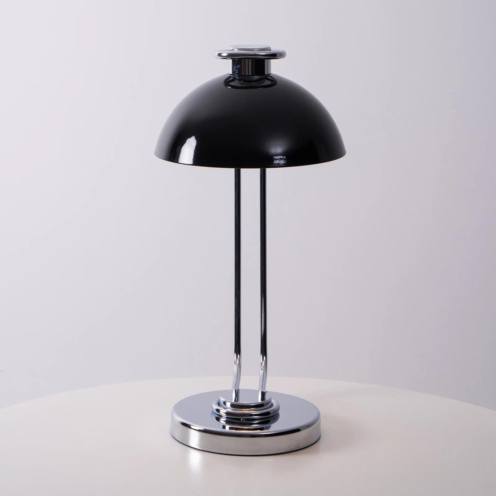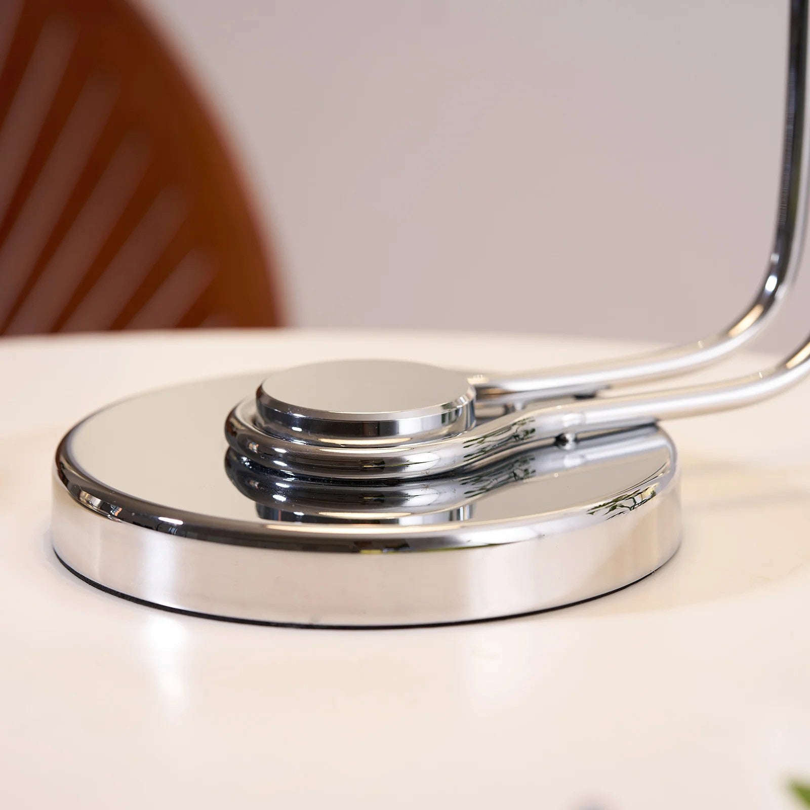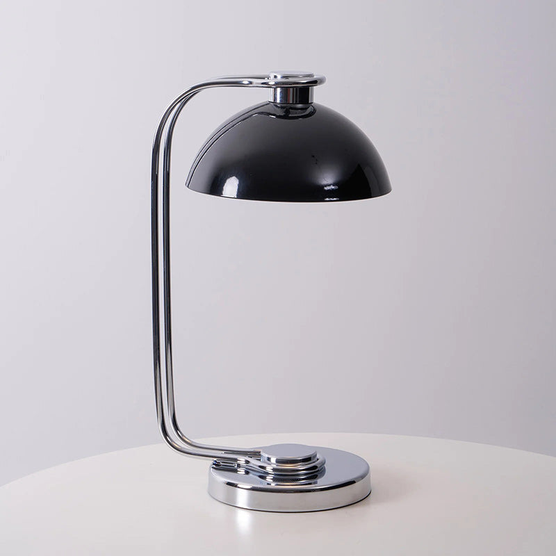 The Domex Table Lamp combines vintage appeal with contemporary elegance. Its glossy black dome shade paired with a chrome-plated curved arm and base delivers a striking, refined look ideal for any desk or reading area.