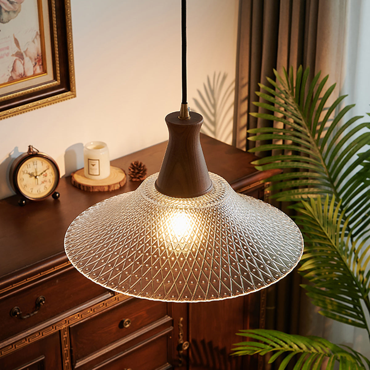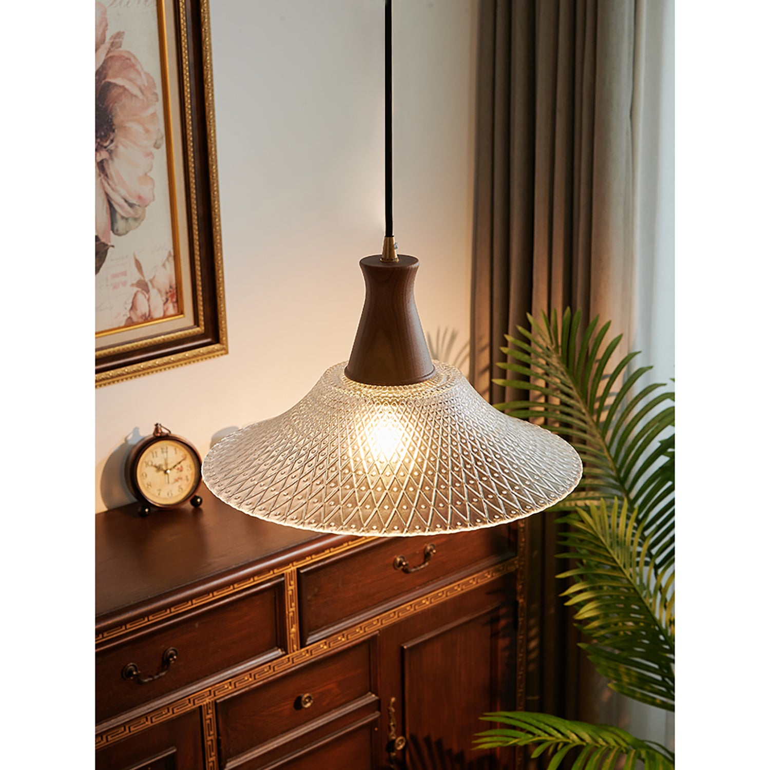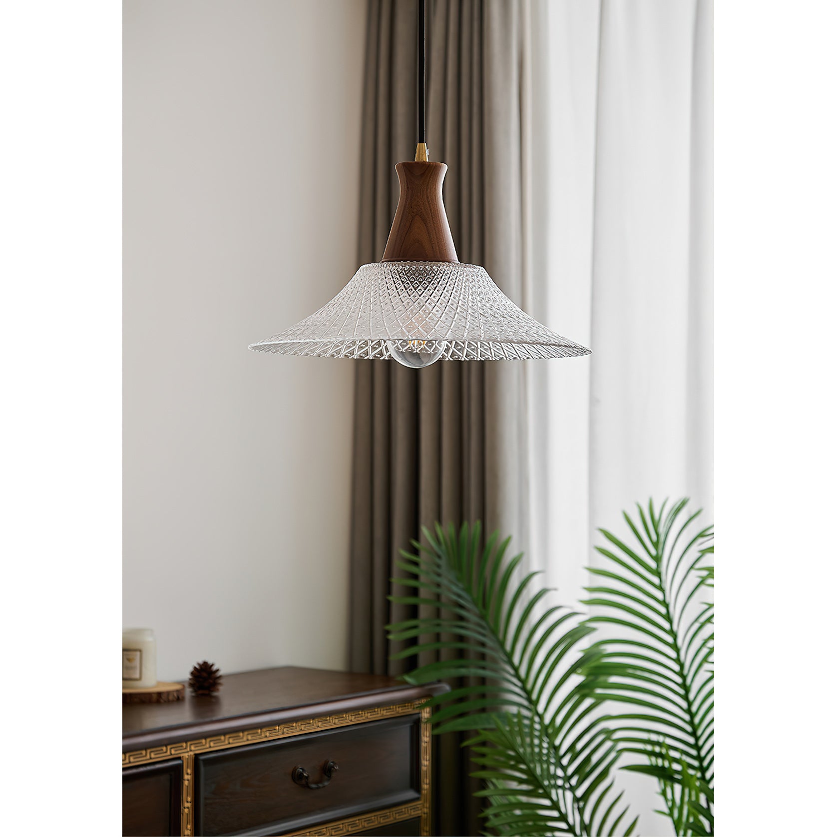 The Eiken Glass Pendant Lamp features a textured glass design paired with a vintage-style solid wood finish, merging artisanal warmth with contemporary decor. It enhances any room by harmonizing nostalgic elements and natural tones, creating an inviting and cohesive ambiance.