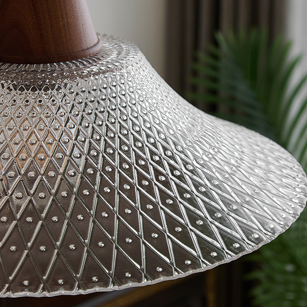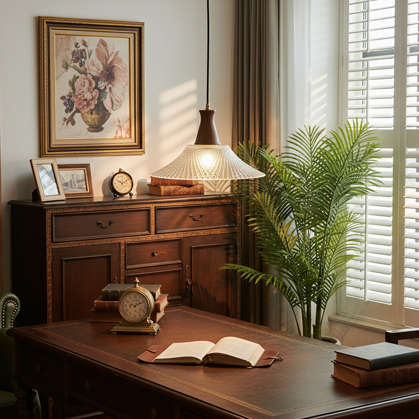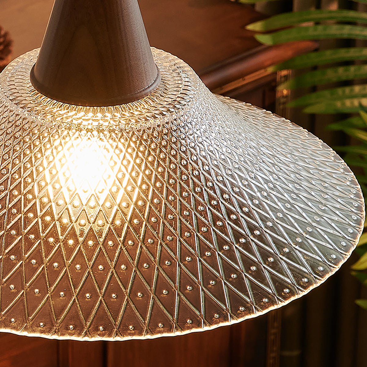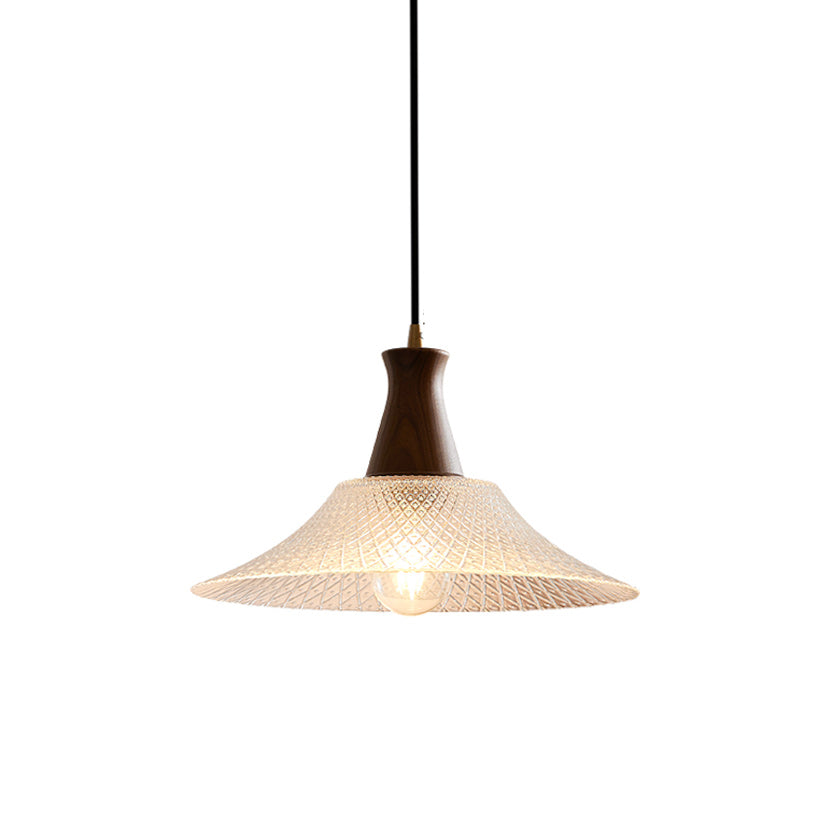 The Eiken Glass Pendant Lamp features a textured glass design paired with a vintage-style solid wood finish, merging artisanal warmth with contemporary decor. It enhances any room by harmonizing nostalgic elements and natural tones, creating an inviting and cohesive ambiance.