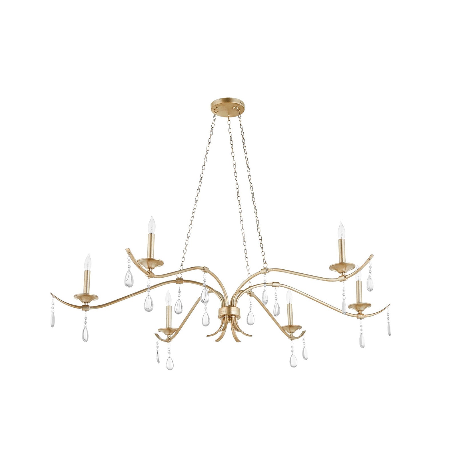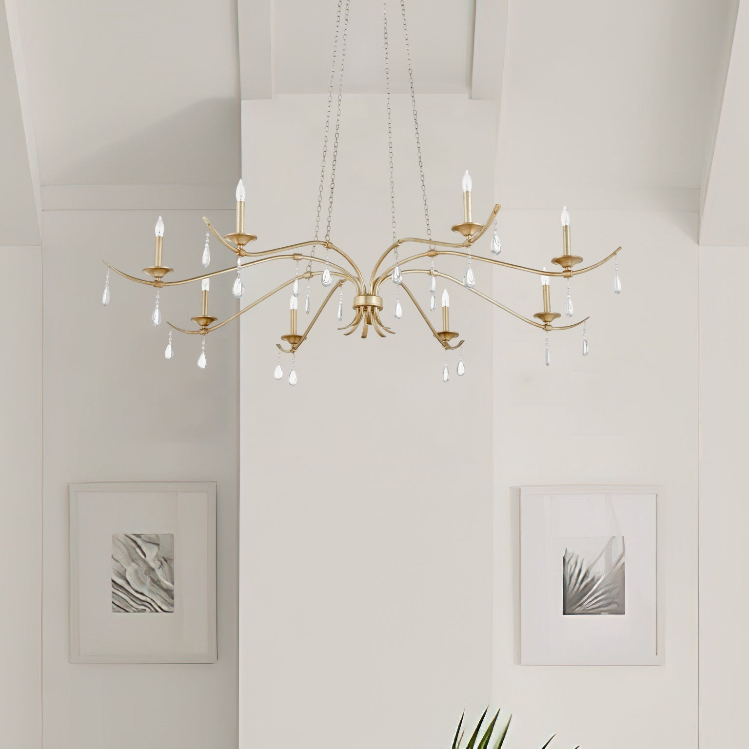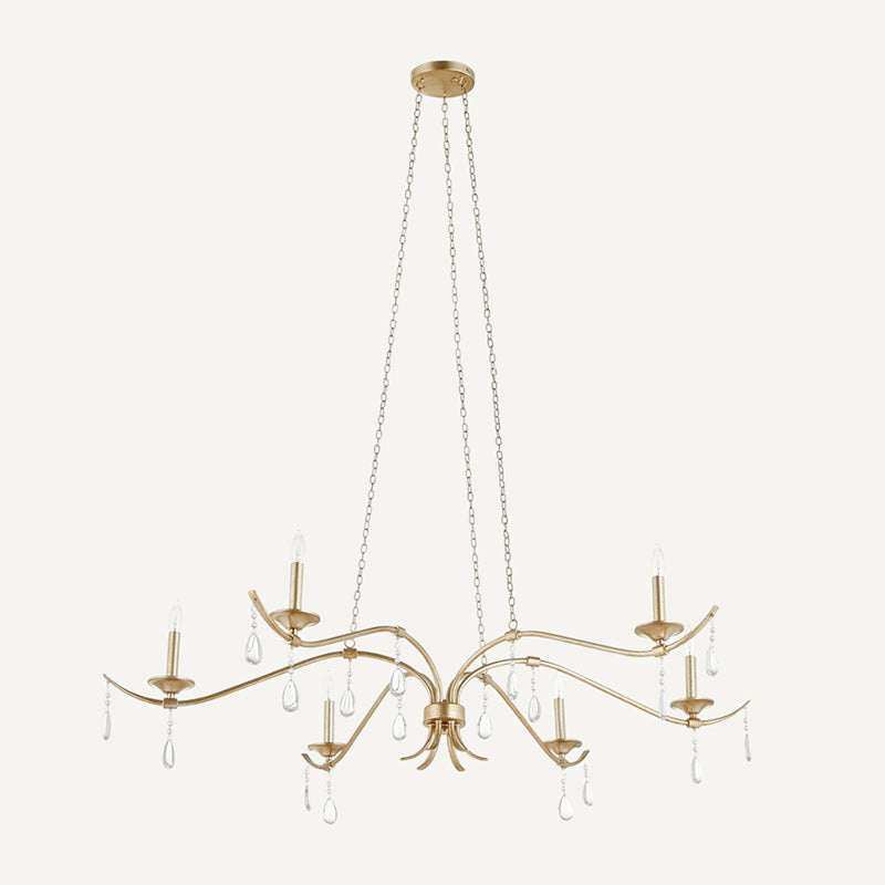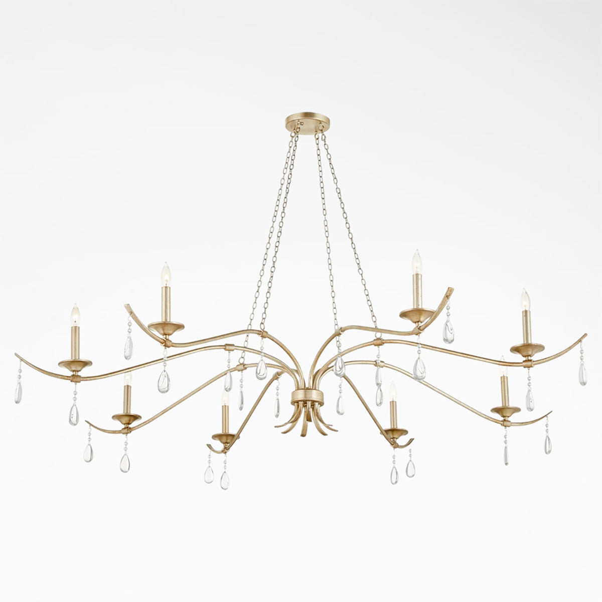 The Lorelei Leaf Crystal Chandelier embodies a refined and simplistic aesthetic that delivers restrained opulence. Designed with elongated, sweeping curves, this chandelier is available in brass finishes, aligning with transitional design styles. Its elegant presence is enhanced by hanging crystals and a combination of sturdy and delicate chains, offering a sophisticated focal point for interior spaces.