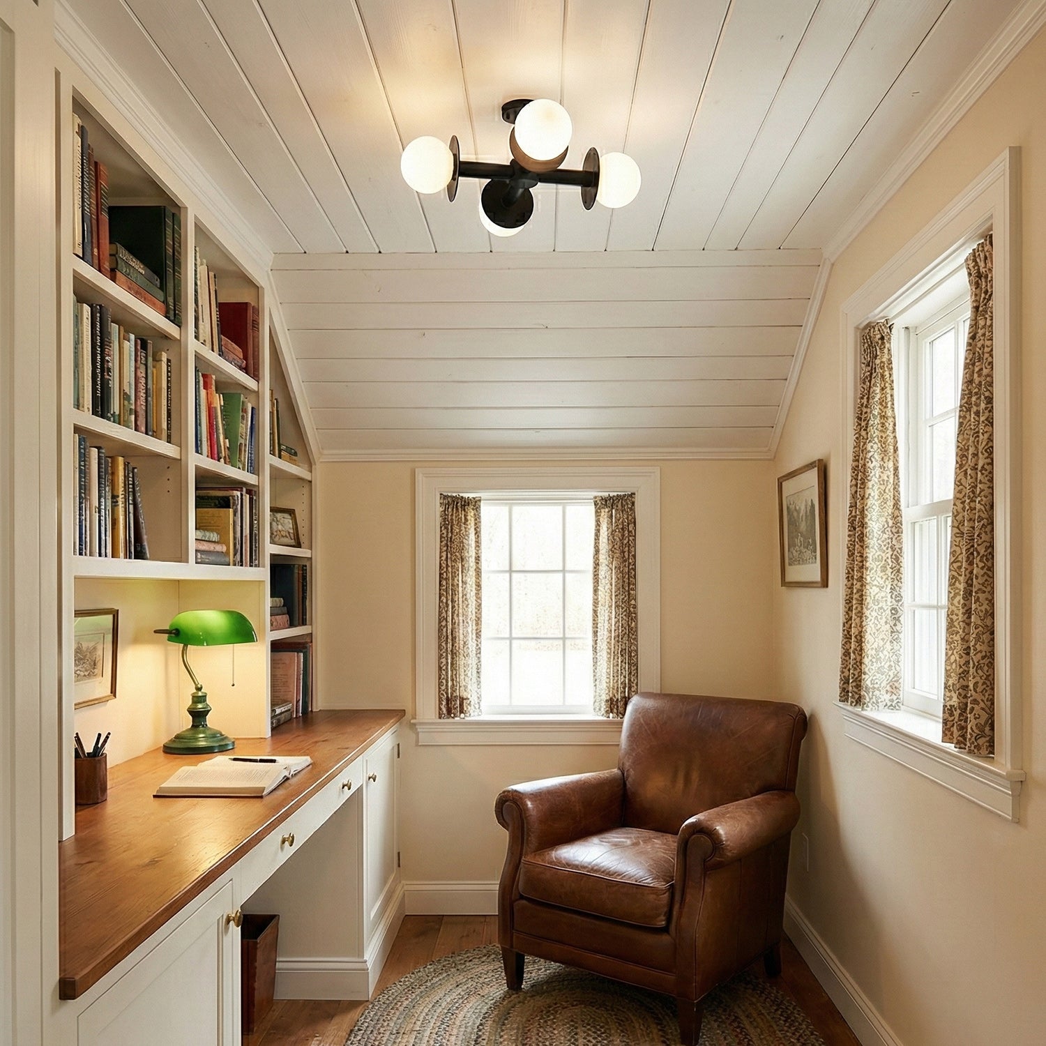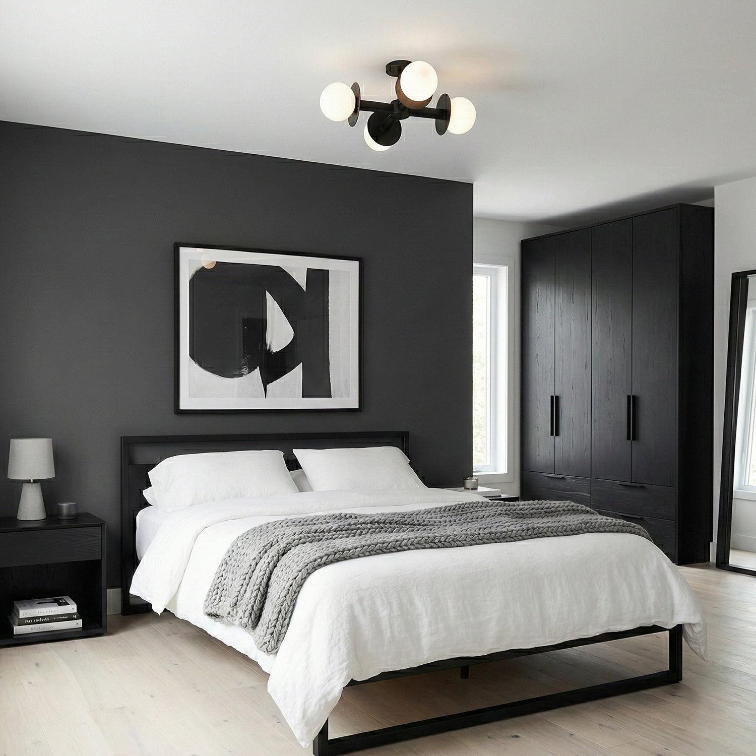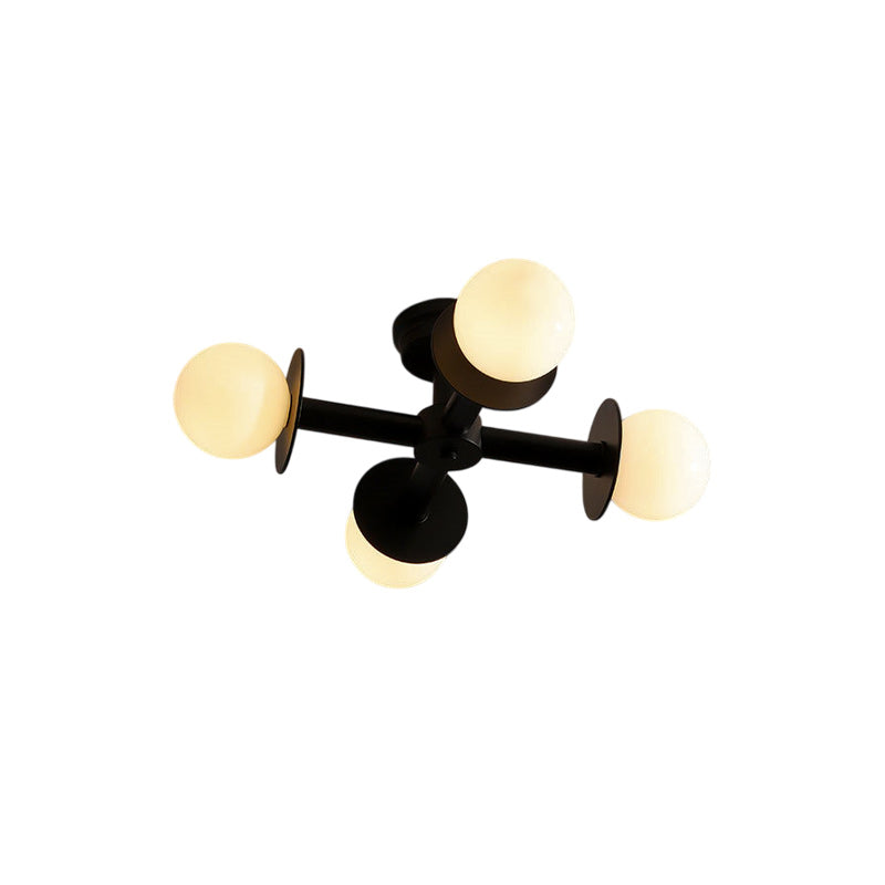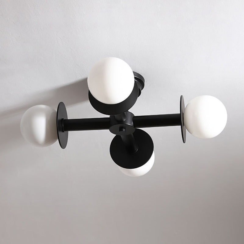 The Allegra Ceiling Lamp brings contemporary geometry to residential spaces with its distinctive intersecting-bar framework and four-point fixture design. Crafted from iron with a refined finish, this fixture delivers a striking linear aesthetic suited to hallways and dining environments. Each endpoint features a glass orb shade that diffuses warm, dimmable illumination throughout the room.