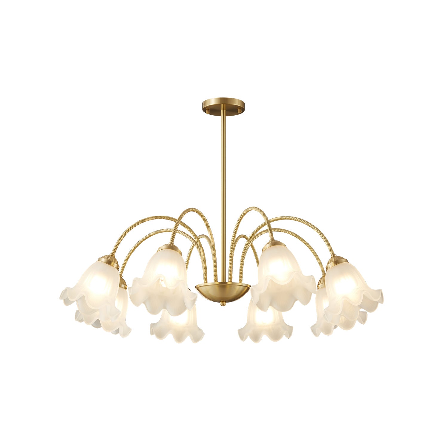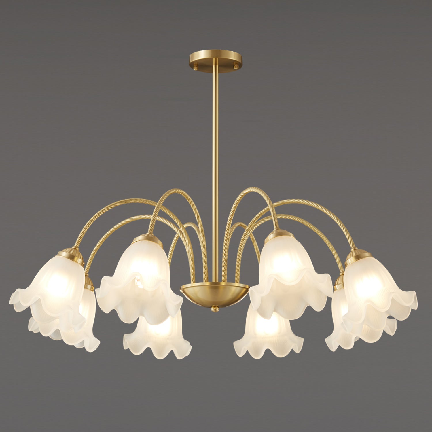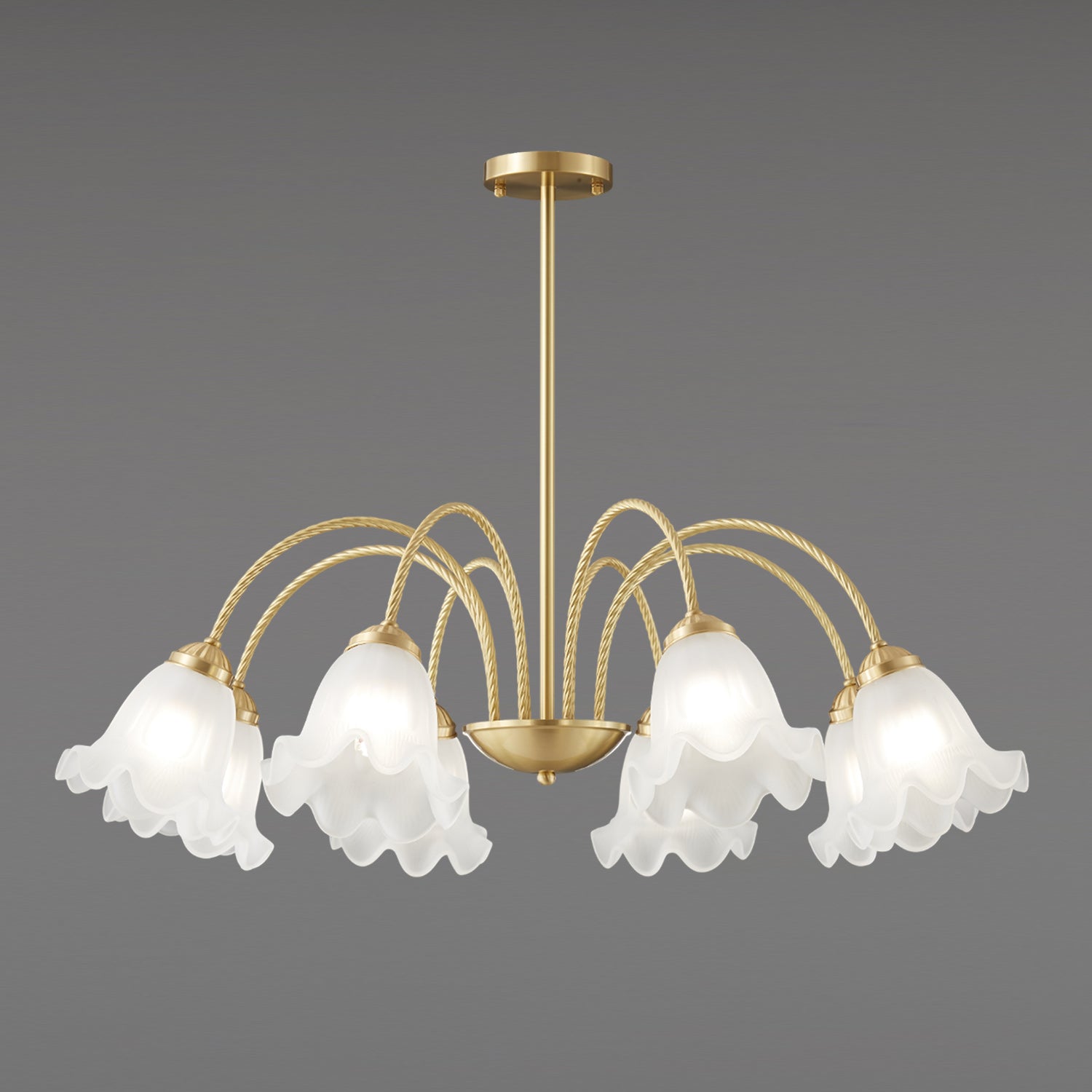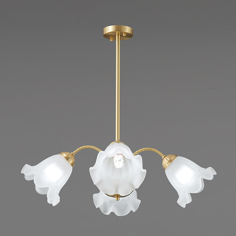 Bring a touch of timeless romance to your home with this stunning French Lily Chandelier. Featuring elegantly twisted brass arms and delicate, lily-flower glass shades with gently ruffled edges, this fixture casts a warm, softly diffused glow. Available in versatile 4-light, 6-light, and 8-light configurations, it acts as a graceful centerpiece perfect for illuminating classic dining rooms, elegant bedrooms, or vintage-inspired living spaces.