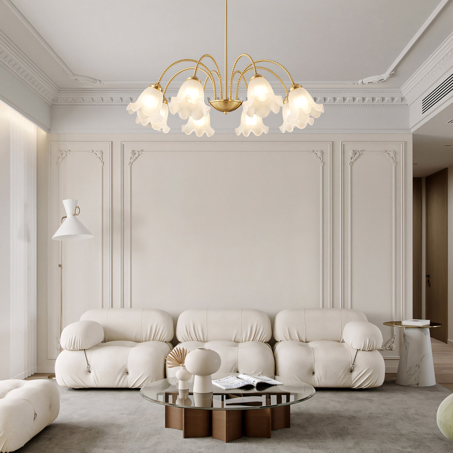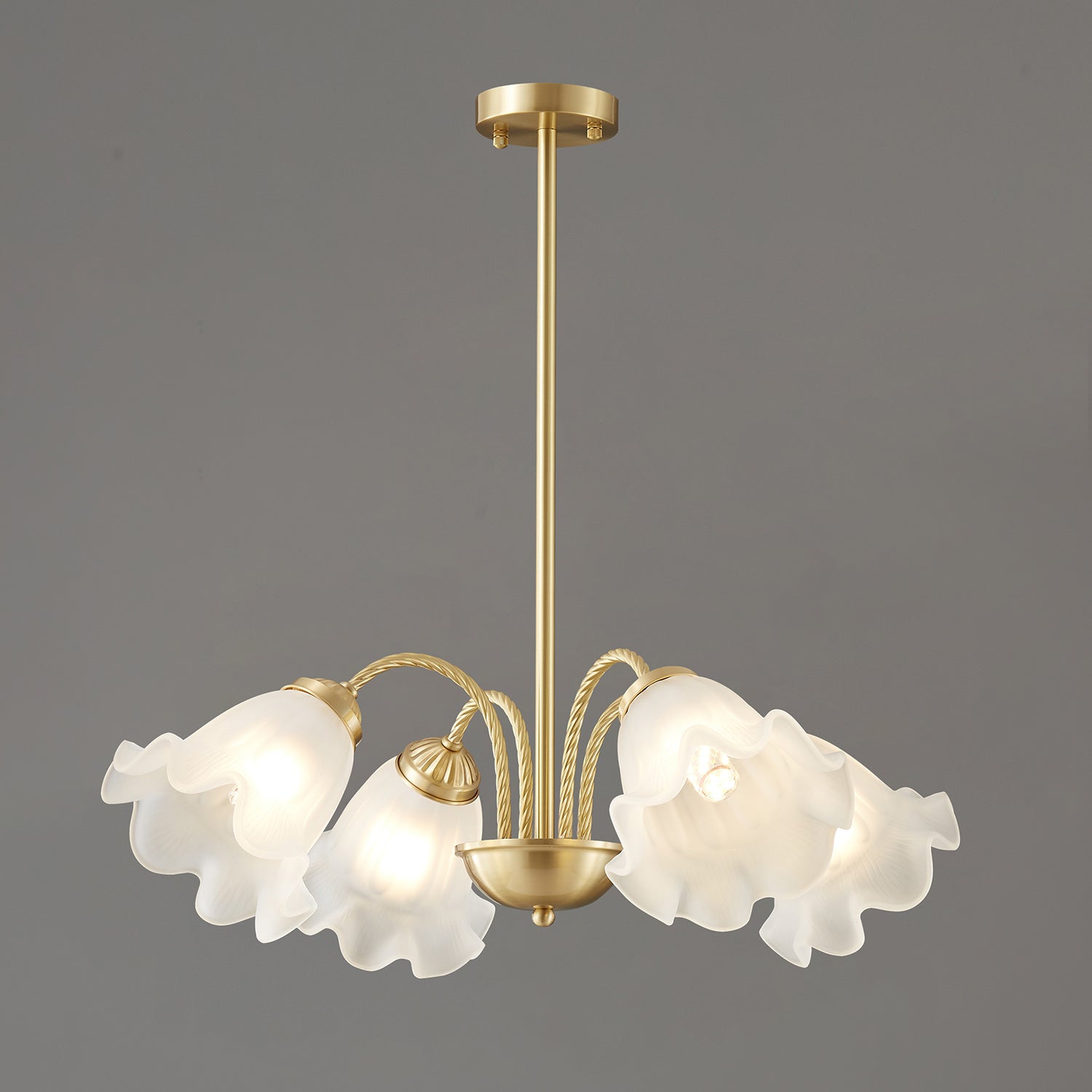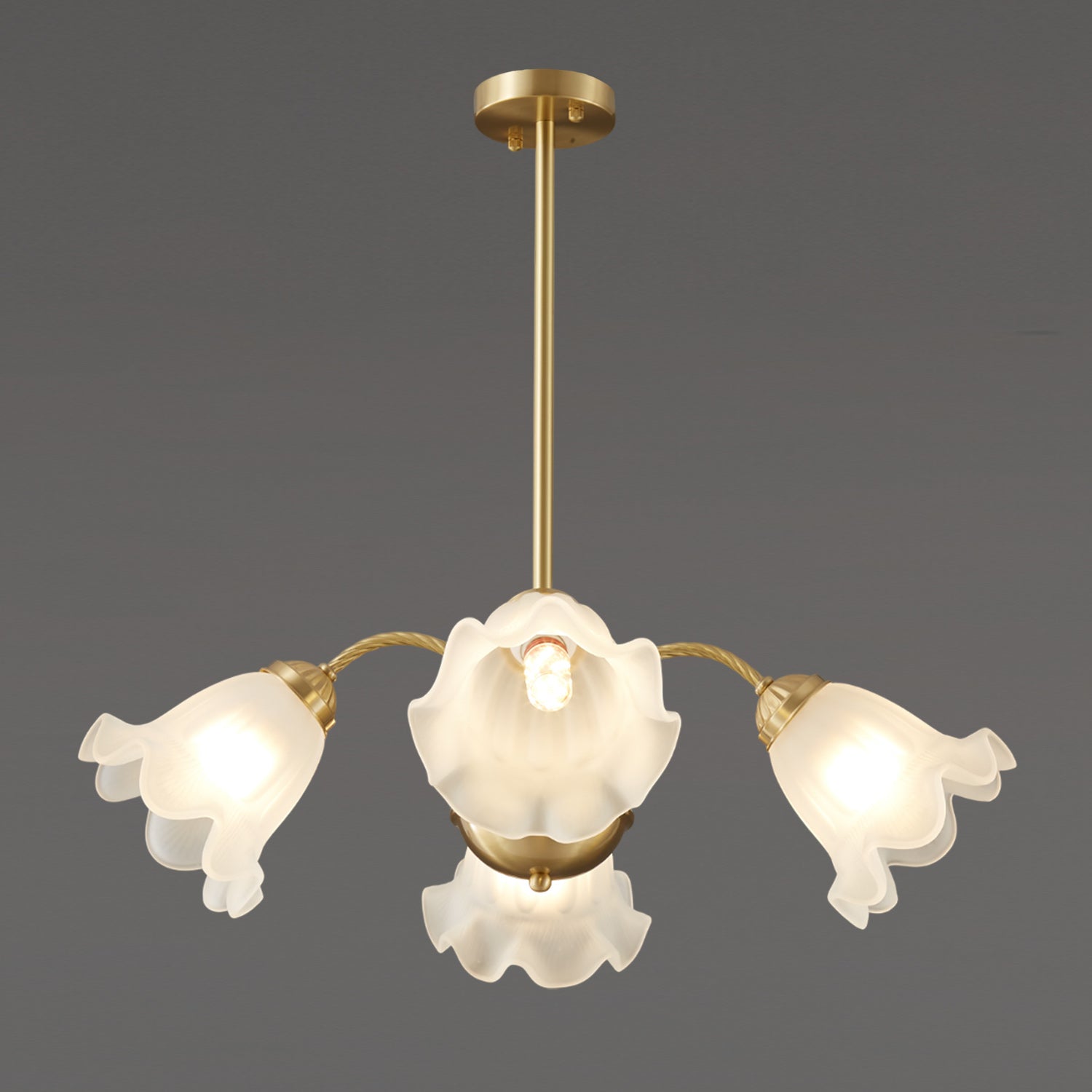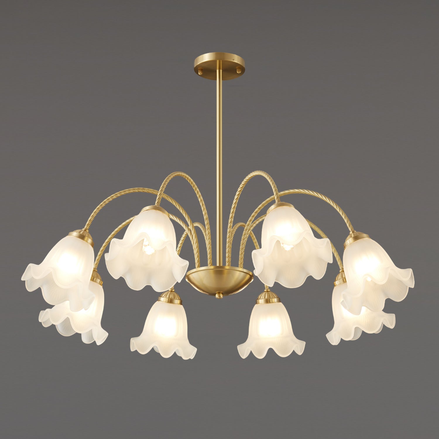 Bring a touch of timeless romance to your home with this stunning French Lily Chandelier. Featuring elegantly twisted brass arms and delicate, lily-flower glass shades with gently ruffled edges, this fixture casts a warm, softly diffused glow. Available in versatile 4-light, 6-light, and 8-light configurations, it acts as a graceful centerpiece perfect for illuminating classic dining rooms, elegant bedrooms, or vintage-inspired living spaces.