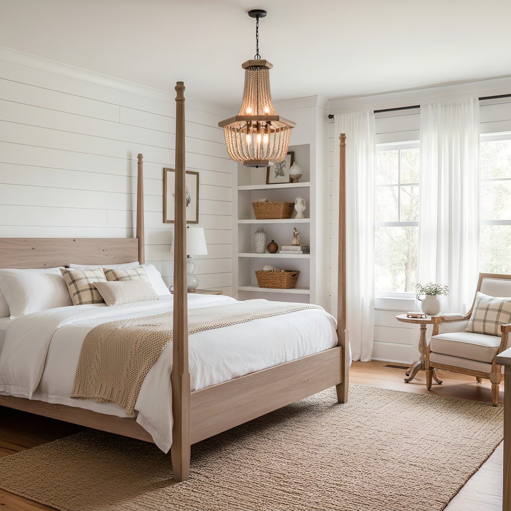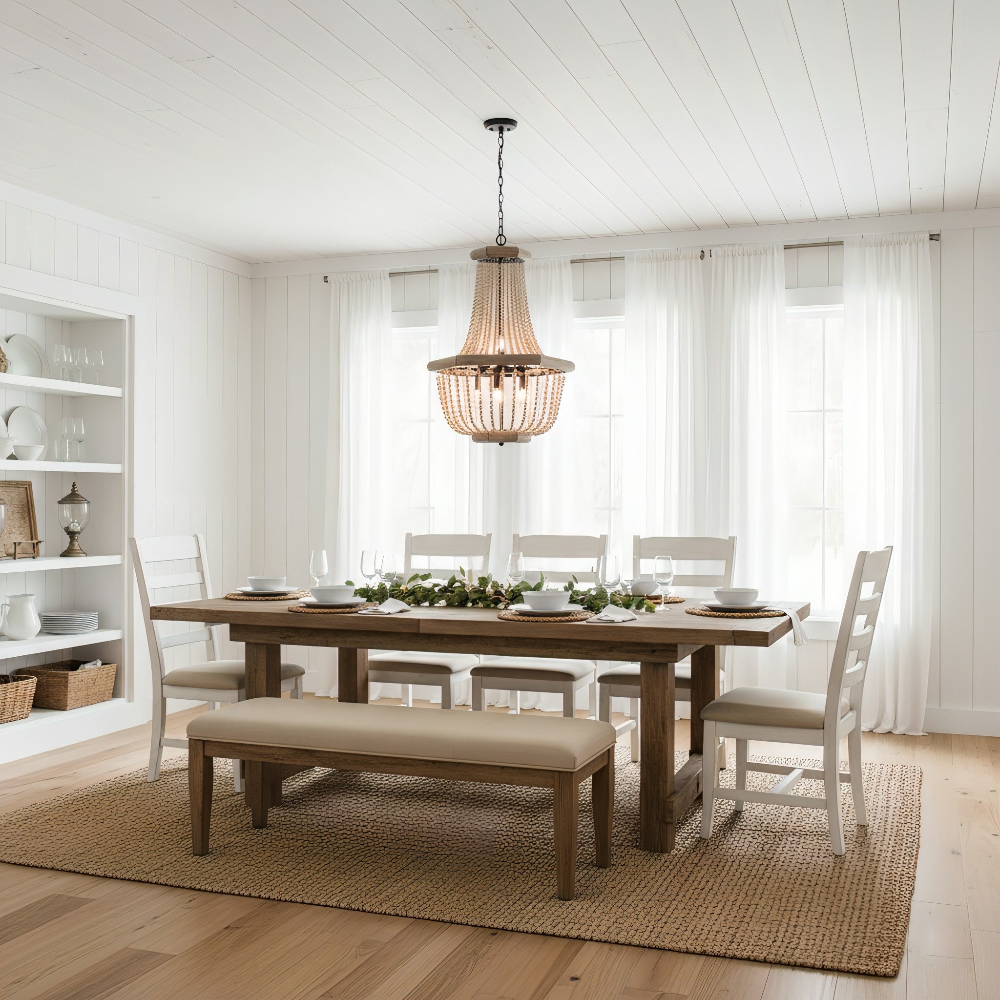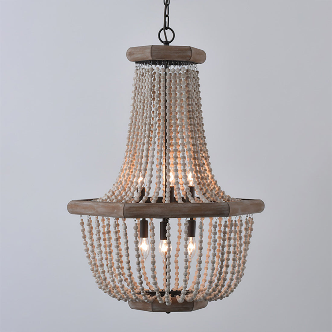Chandeliers have a fussy reputation, but this laid-back design helps give them a new image. It showcases strands of weathered wooden beads, streaming down from a rustic wooden top, tapering out to a square wooden frame, then back in again to a small square base and finial.