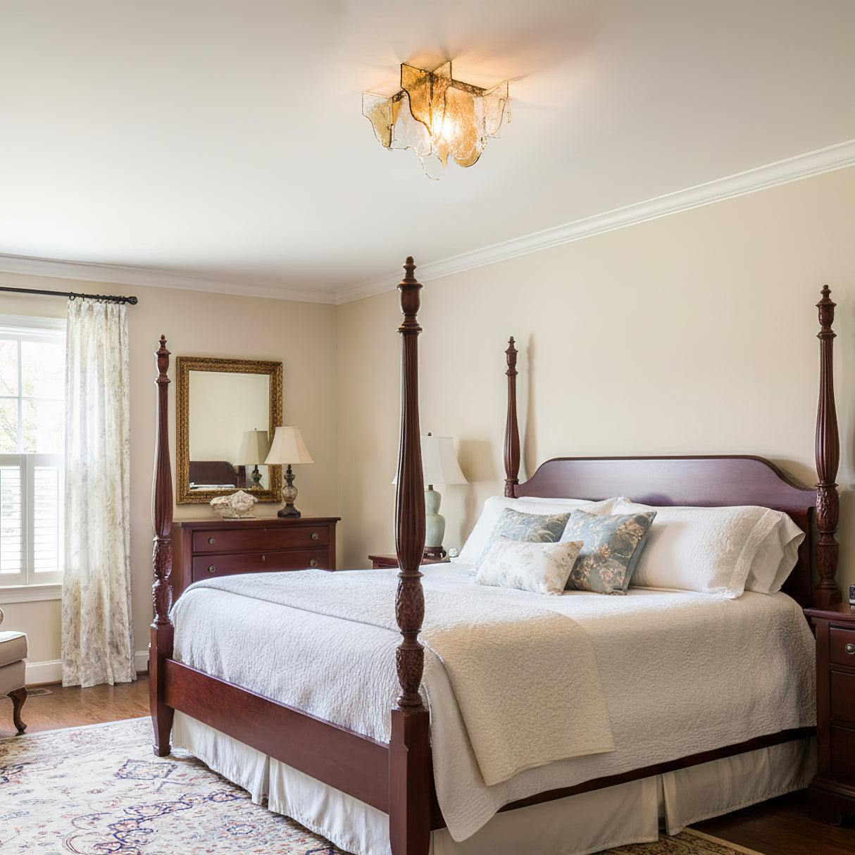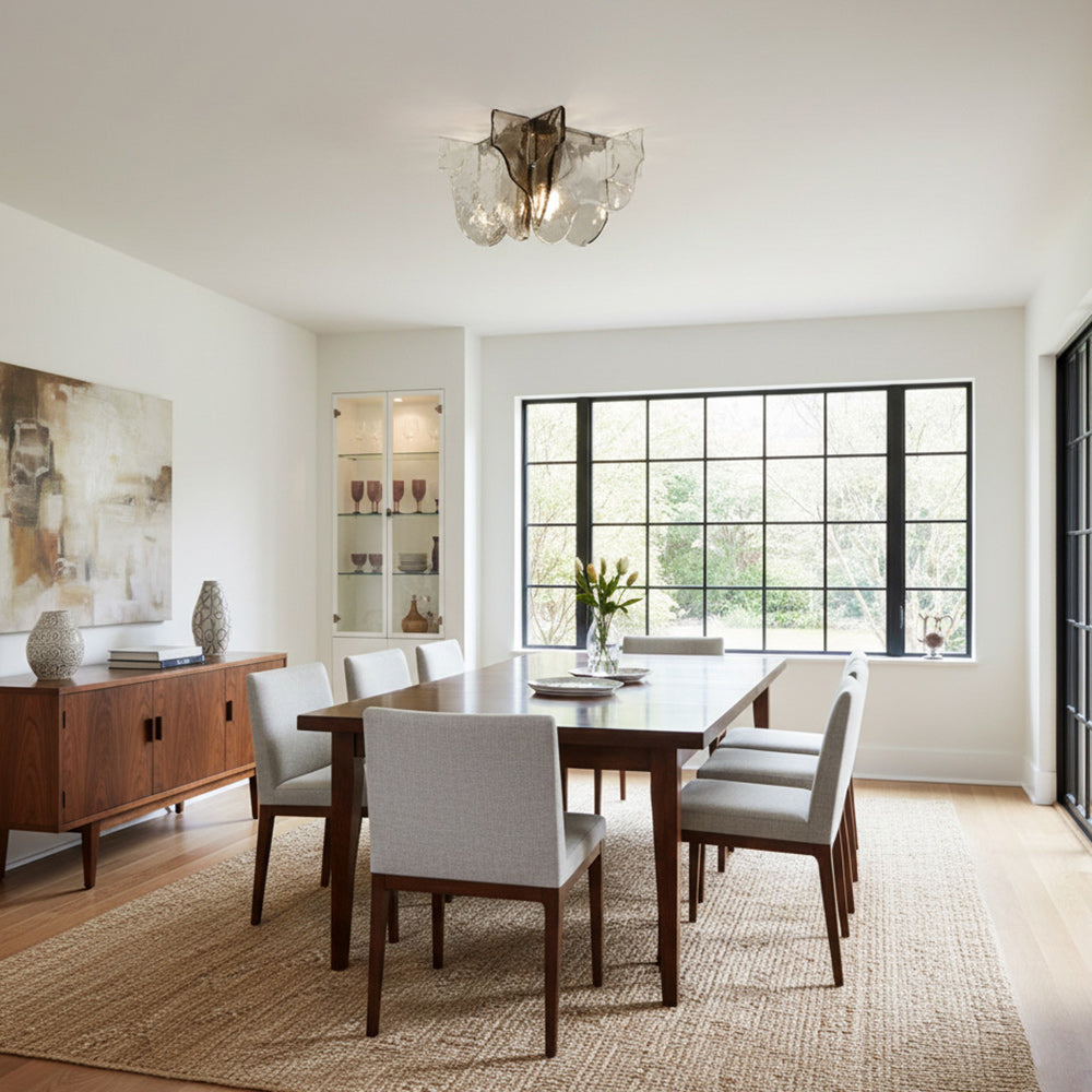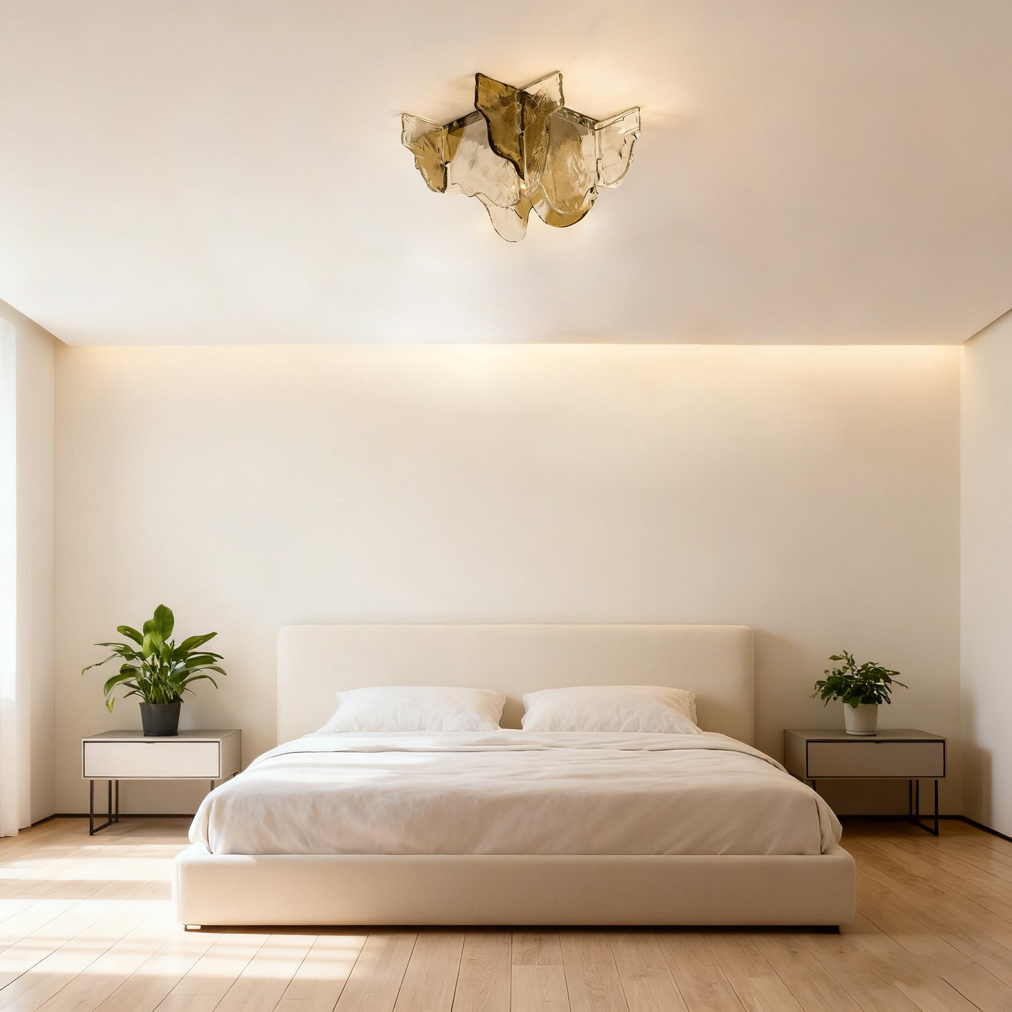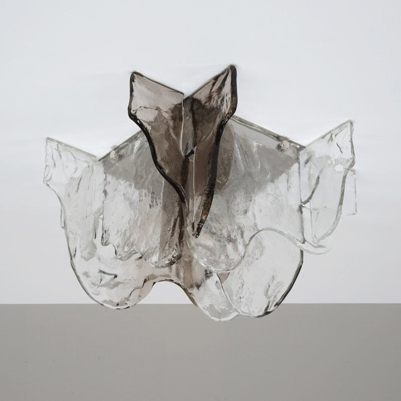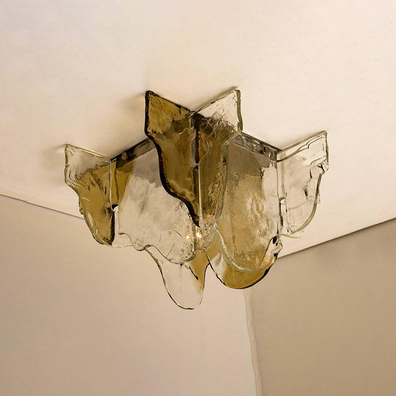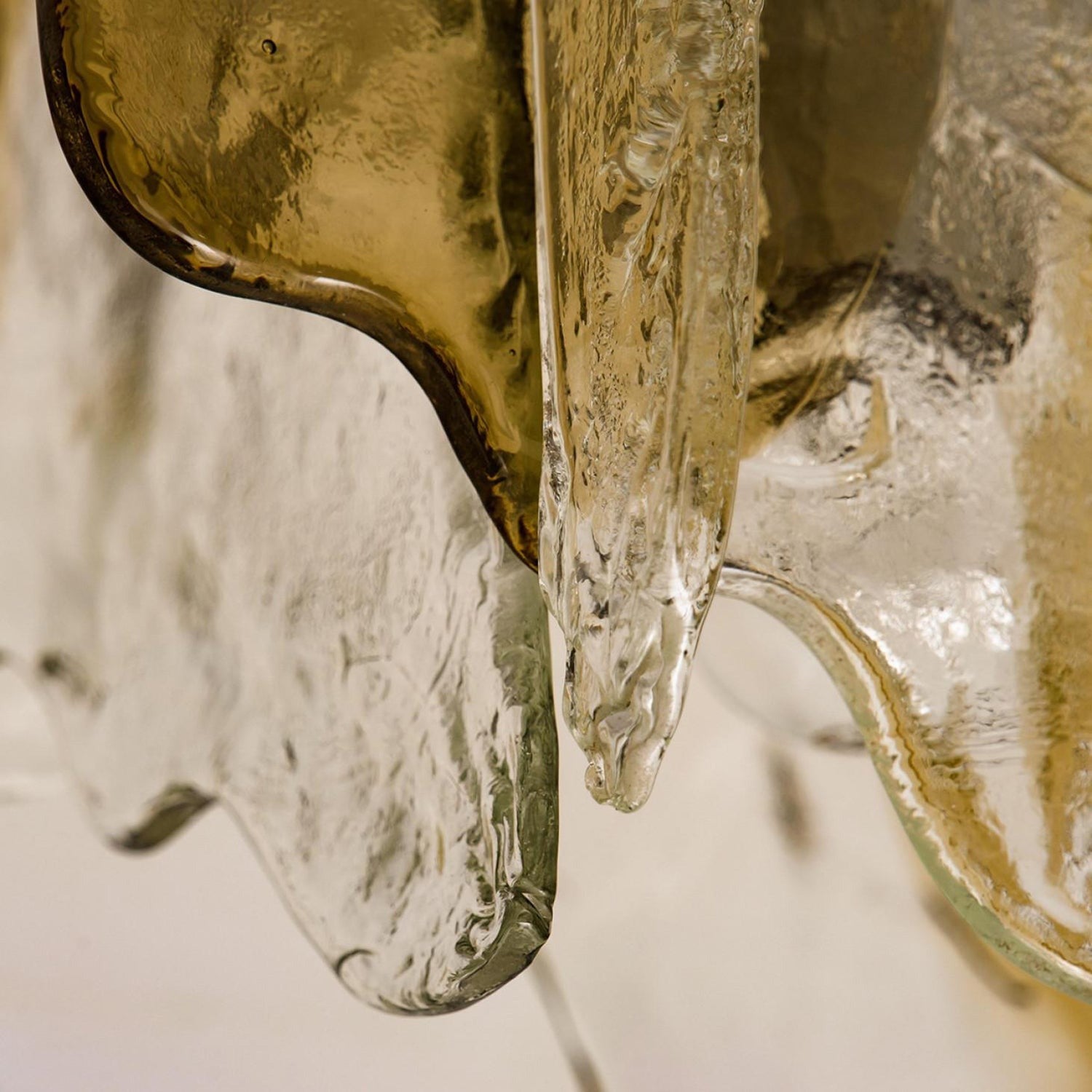 The Carlo Nason Ceiling Lamp features hand-blown transparent gradient glass with natural bubbles and textures. When lit, it produces a warm, layered glow that mimics the light and shadows on the Murano sea at sunset.