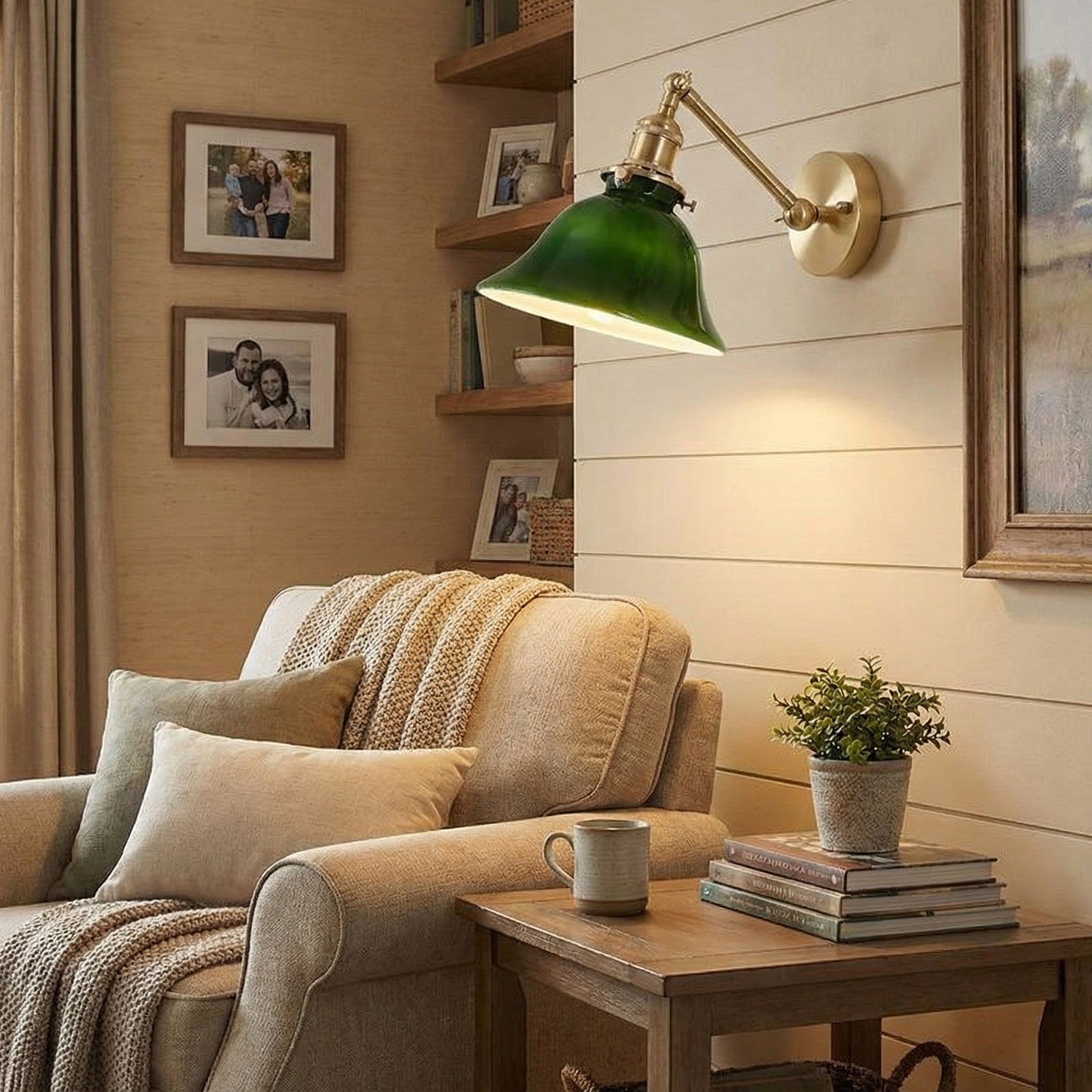 - Metal arm and canopy in an Antique Brass finish. Glass shade in a White/Green finish.