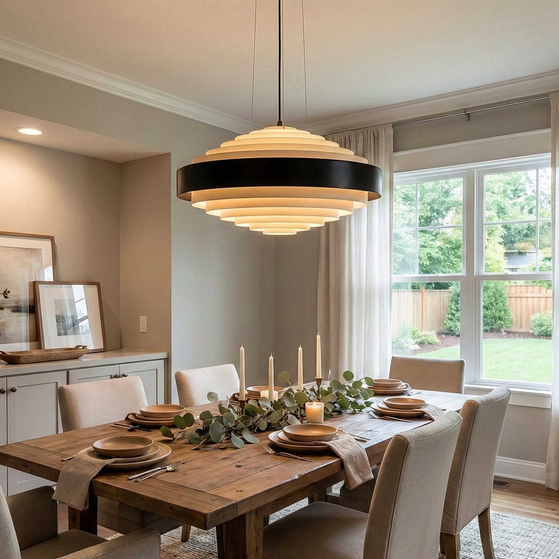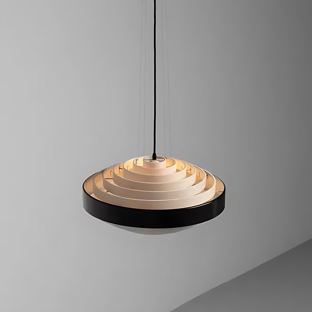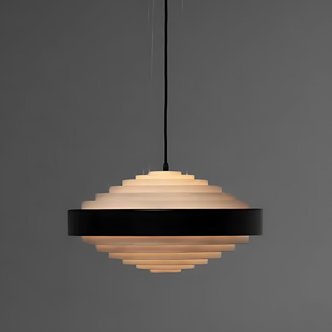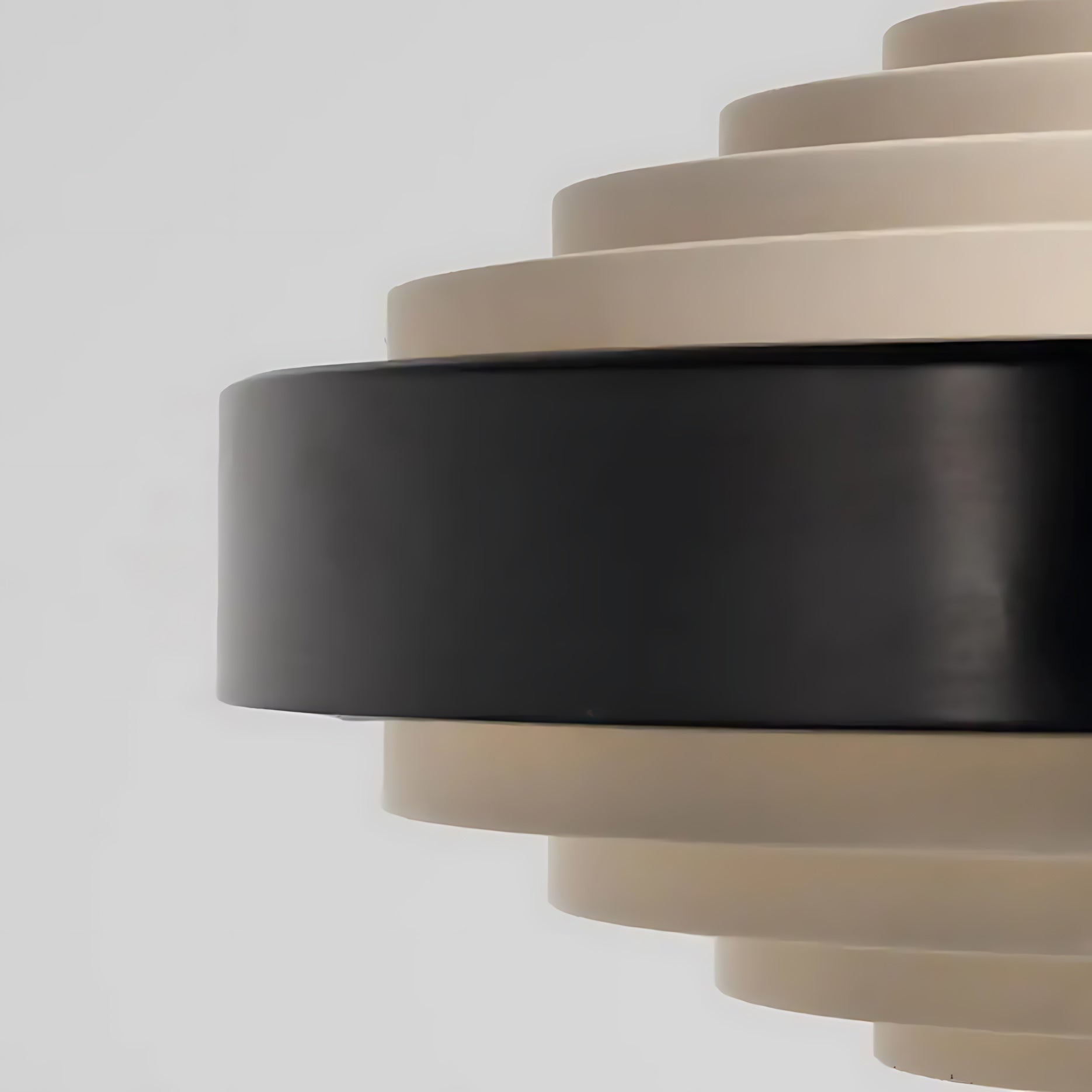 The Wessel multi-layered chandelier is a highly sculptural lighting fixture that cleverly combines the robustness of iron with the softness of acrylic. A large black ring forms the visual center, while gradually shrinking white discs are arranged above and below, creating a striking sense of layering and color contrast. When illuminated, light shines through the gaps between the stacked discs, casting a soft and rhythmic interplay of light and shadow, adding an artistic touch to the space.