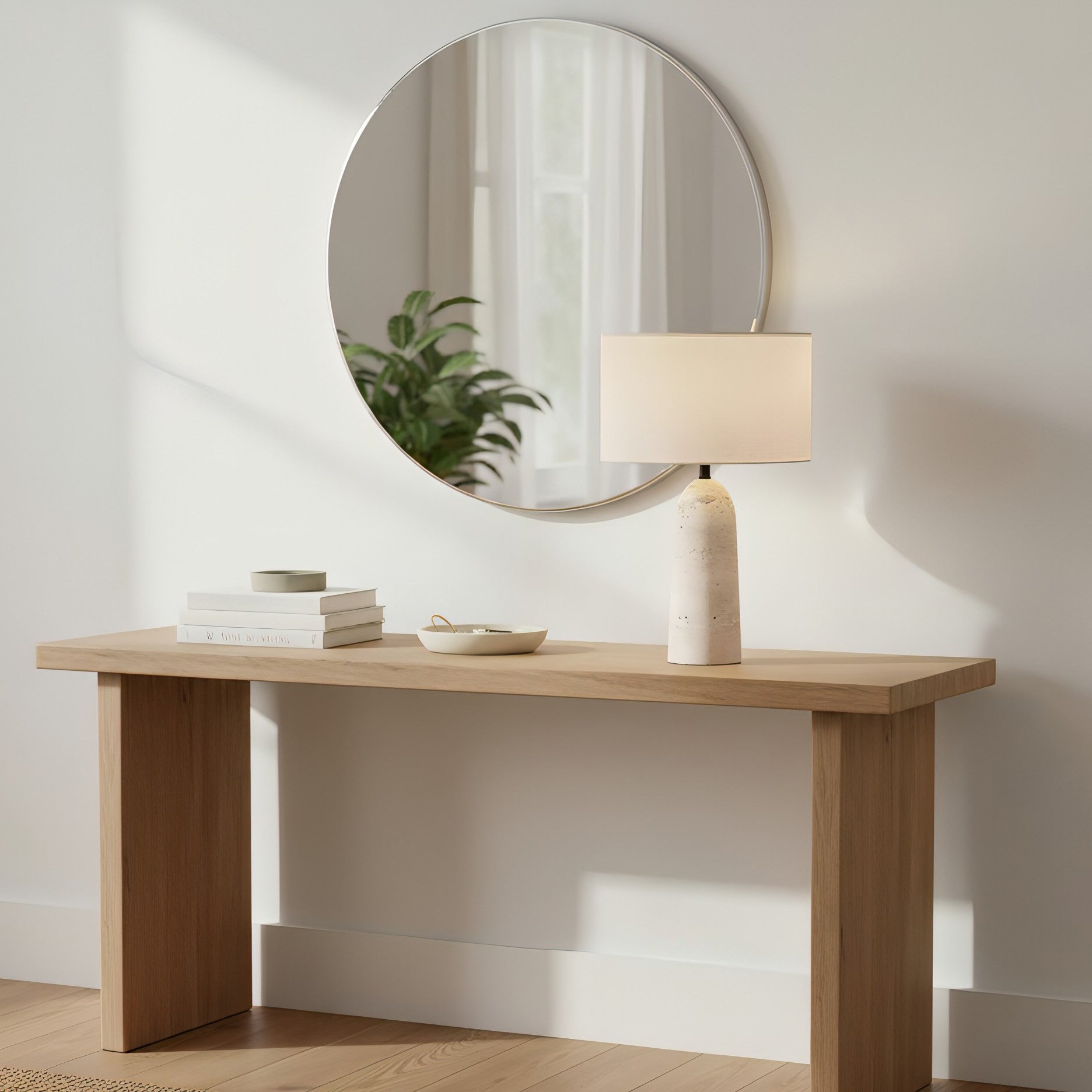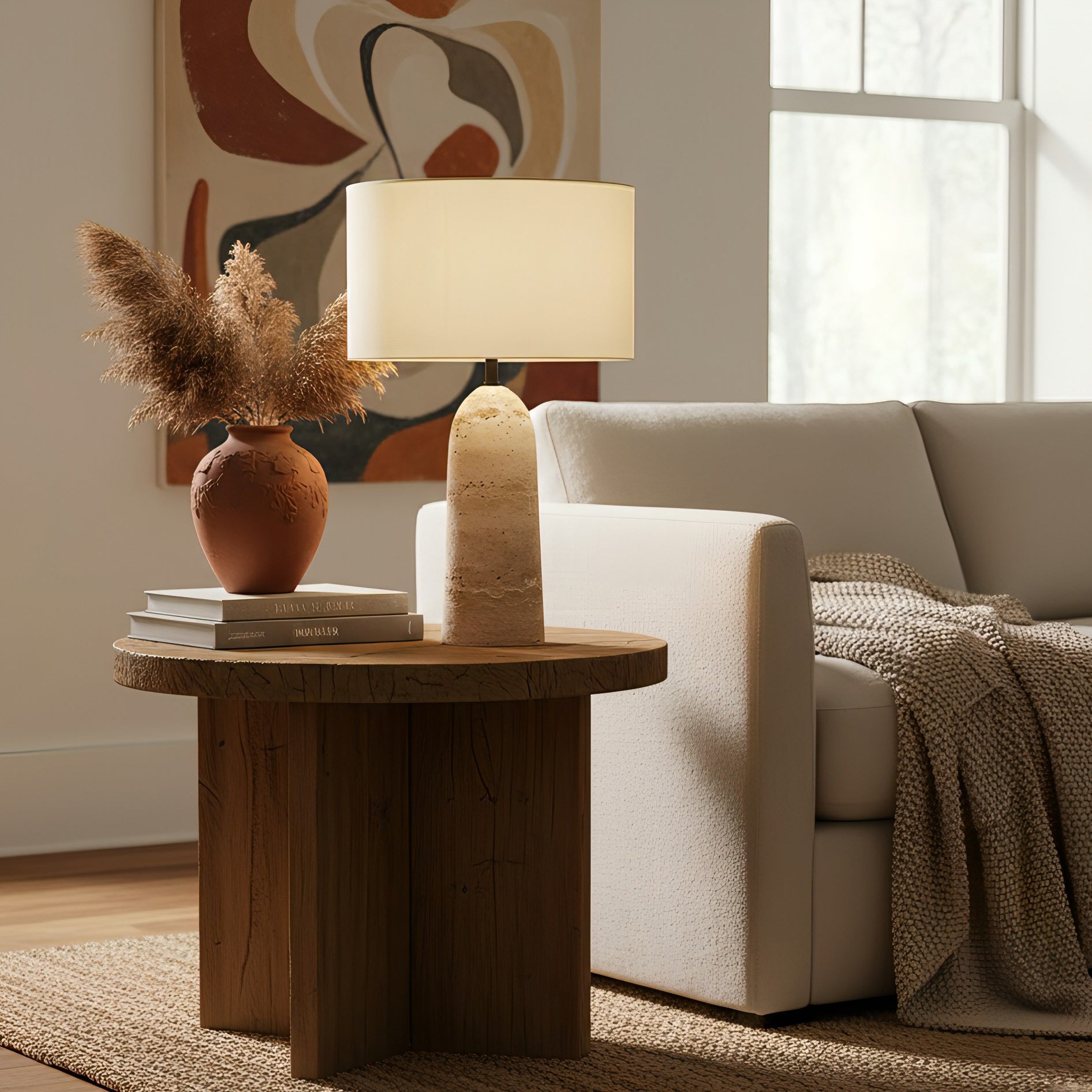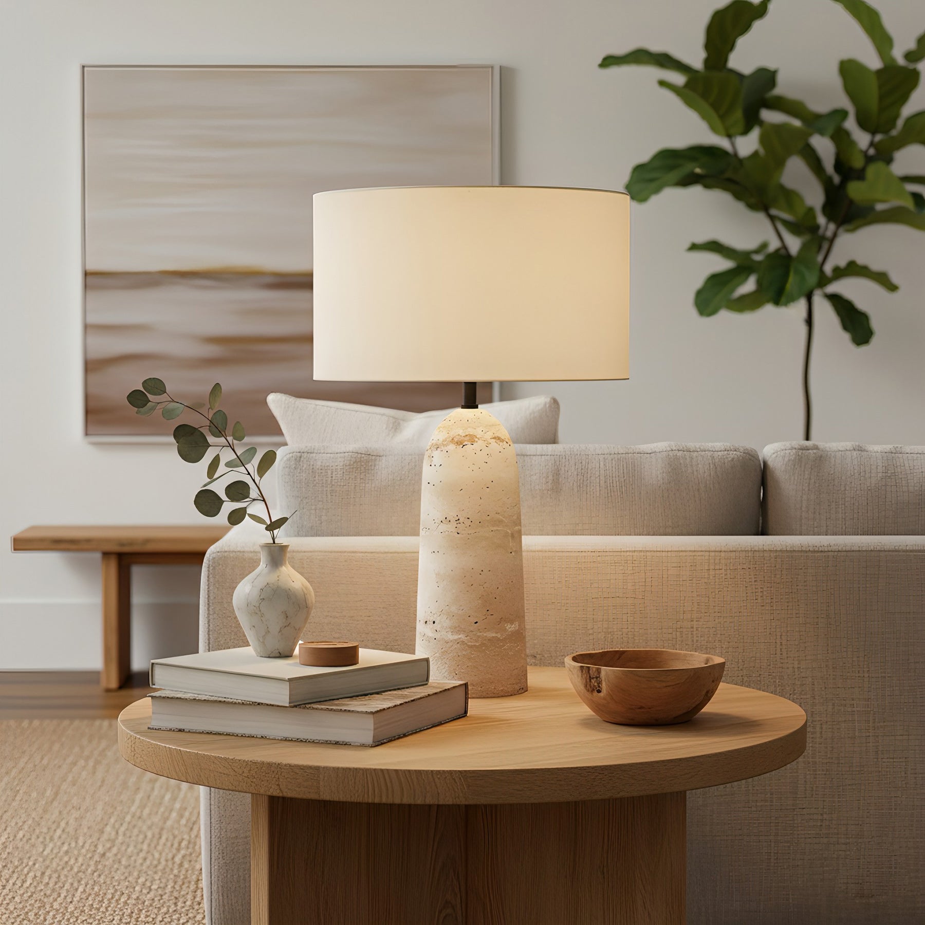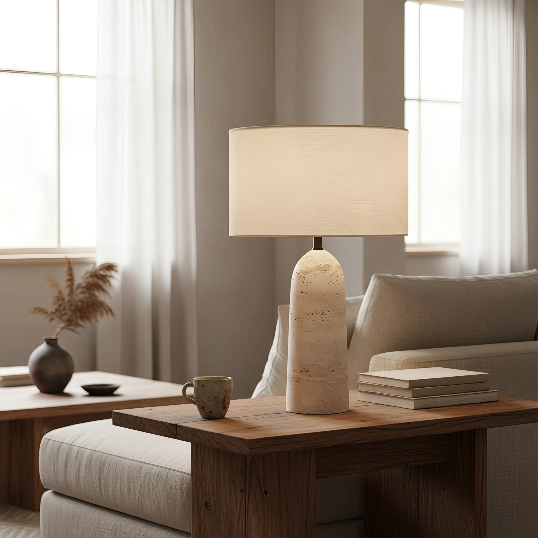 The Aloa Decor Table Lamp features a natural travertine base paired with a beige linen fabric shade, delivering gentle illumination while enhancing elegance and warmth. The travertine’s organic patterns contrast with its smoothly polished surface, forming a distinctive silhouette that stands out without additional decoration.