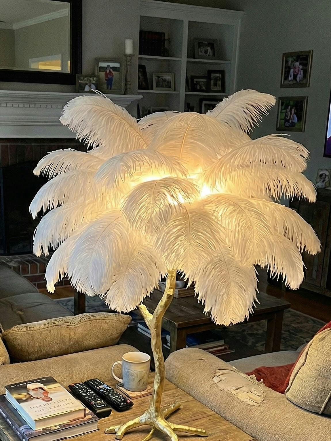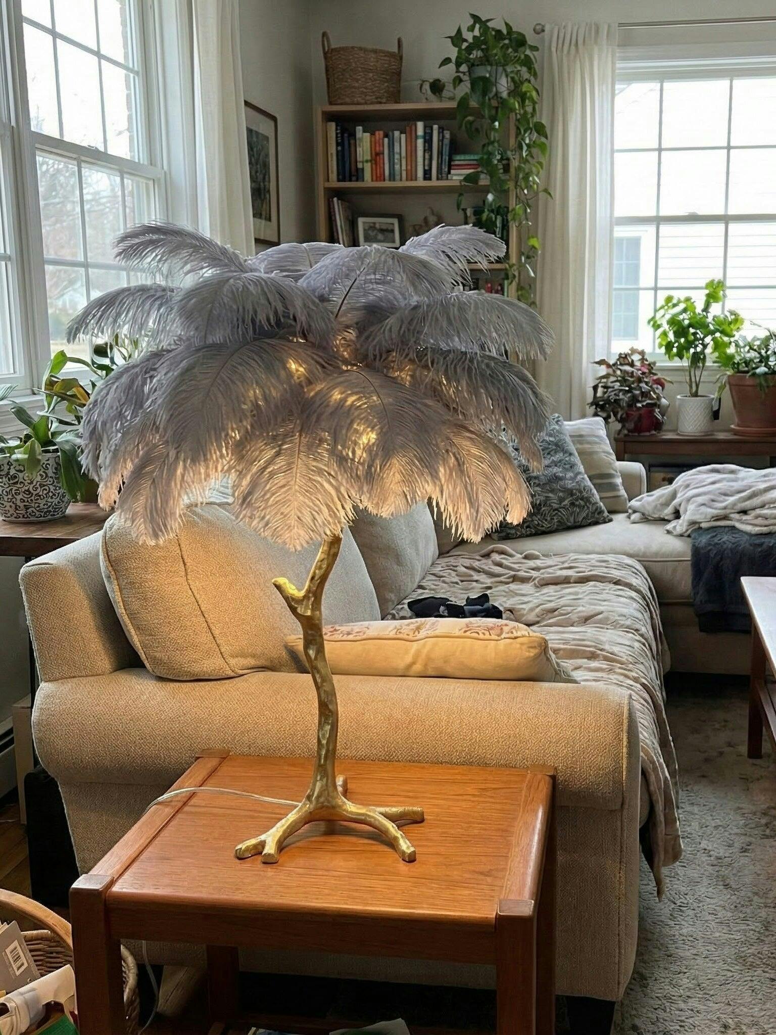 Dekorieren Sie Ihr Zimmer und vervollständigen Sie es mit einer tropisch inspirierten Tischlampe aus Straußenfedern in Baumform. Der Körper ist meisterhaft geformt, um eine Palme zu imitieren, und oben mit blattähnlichen Straußenfedern verziert, um tropische Motive in Ihrem Raum zu schaffen. Dank der Lücken zwischen den Federn wird das Licht gut gefiltert, sodass es sanft und warm leuchtet und eine gemütliche Atmosphäre schafft.