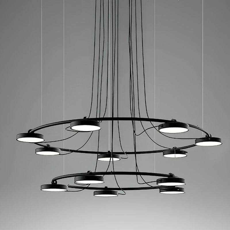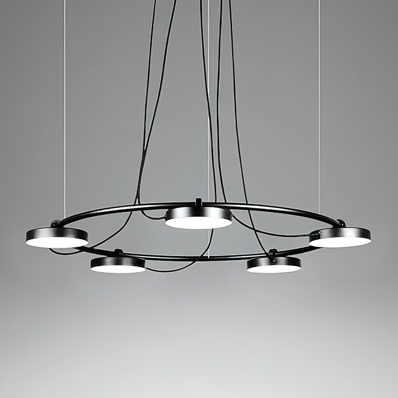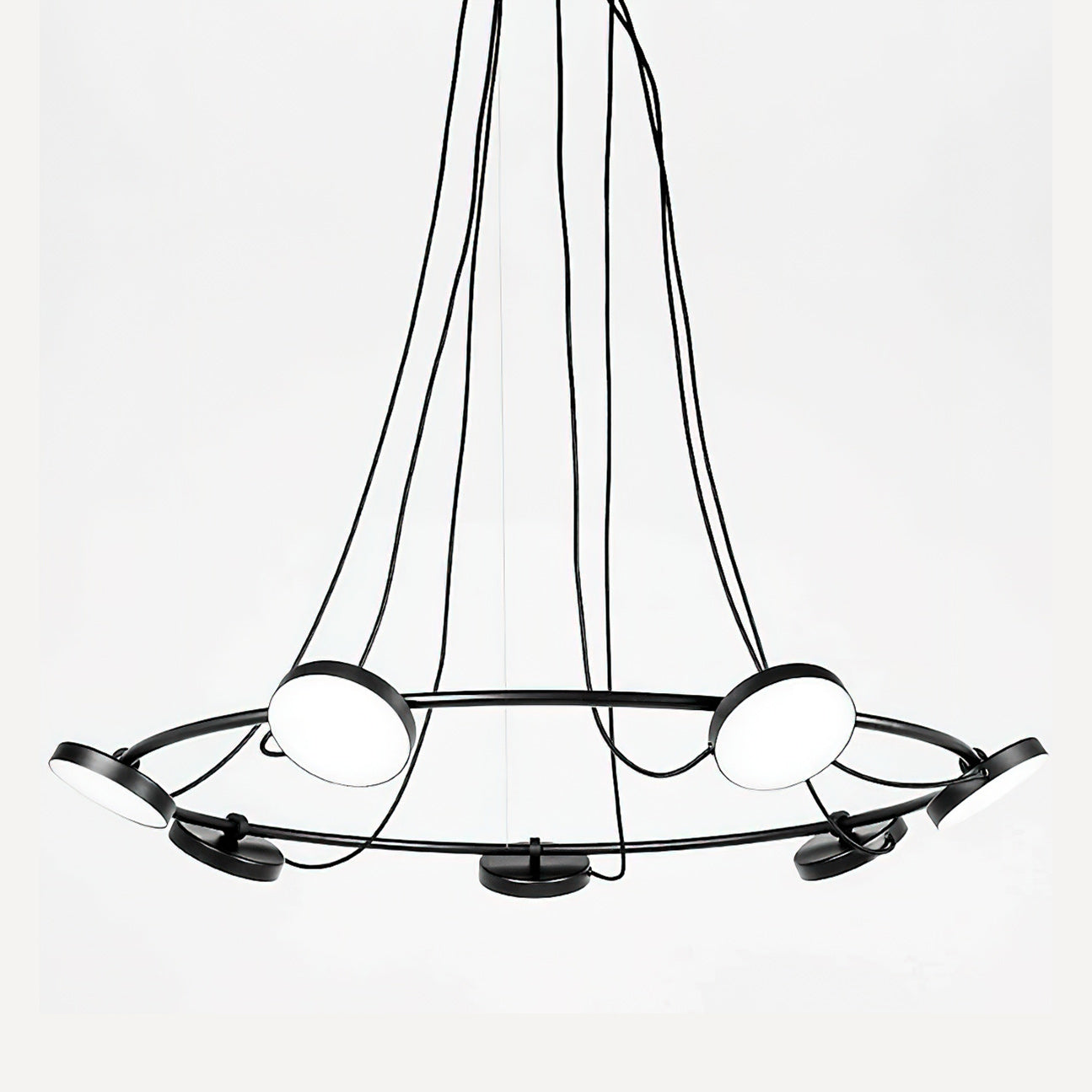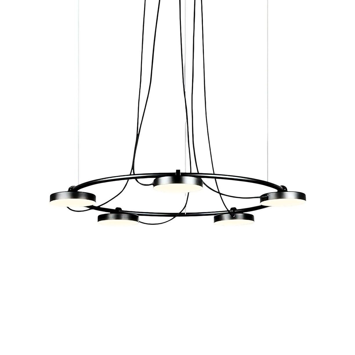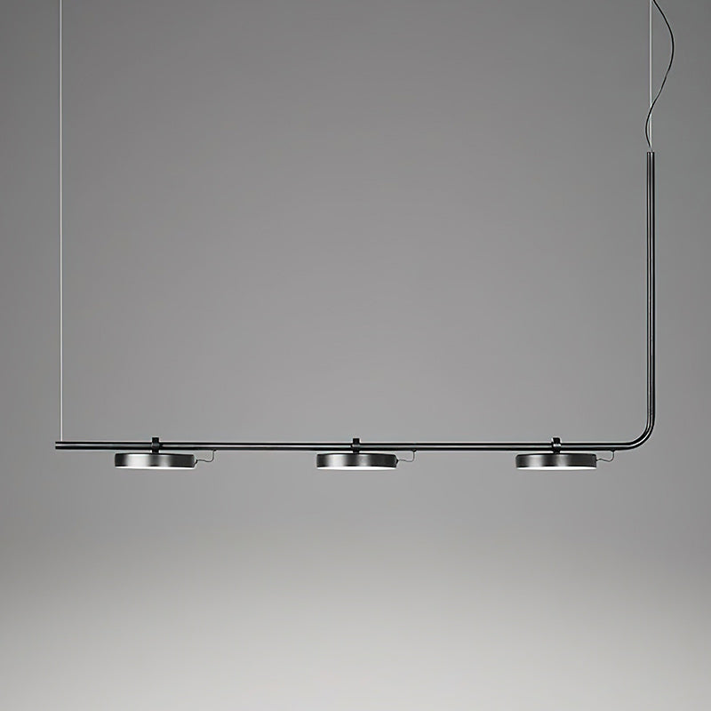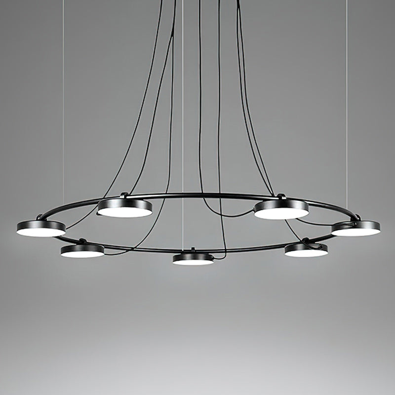 The Aro LED Chandelier is a minimalistic and bold design that can be manipulated to best illuminate the environment around it. Conceived to provide light to a wide range of spaces, this piece has a simple, recognizable form that supports a set of circular heads with acrylic diffusers that can be rotated up to 106°, allowing this piece to adjust to its surroundings.