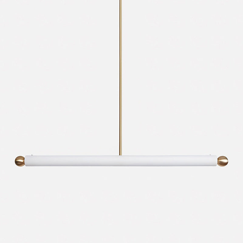 The Tulbe LED Pendant Light casts a dazzling beam of light across the space, elegantly hovering above a counter, table, or lobby. Matte acrylic and two metal spheres interplay subtly, creating a luminous and rhythmic fixture.