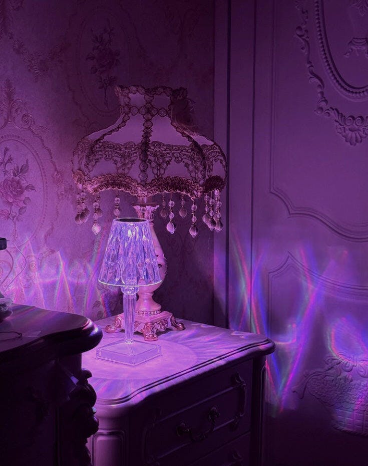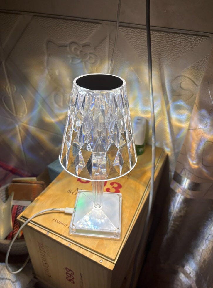 • Lamp body is acrylic, color is Clear.The light shines on the diamond pattern of the lampshade, shining brightly and casting gorgeous light and shadows at night.