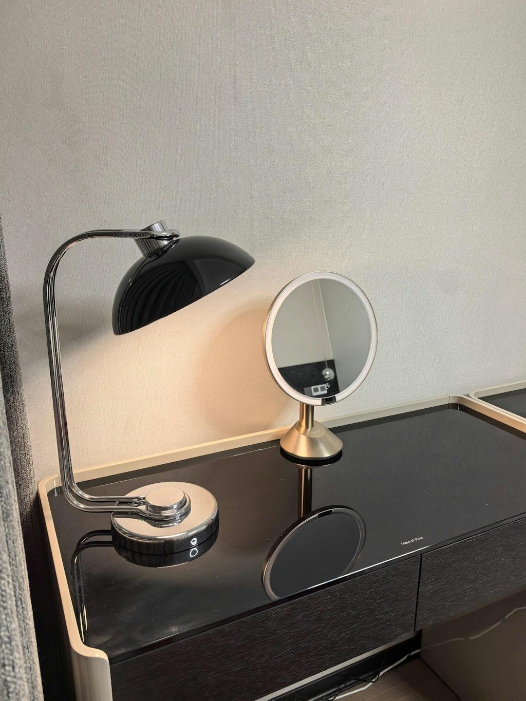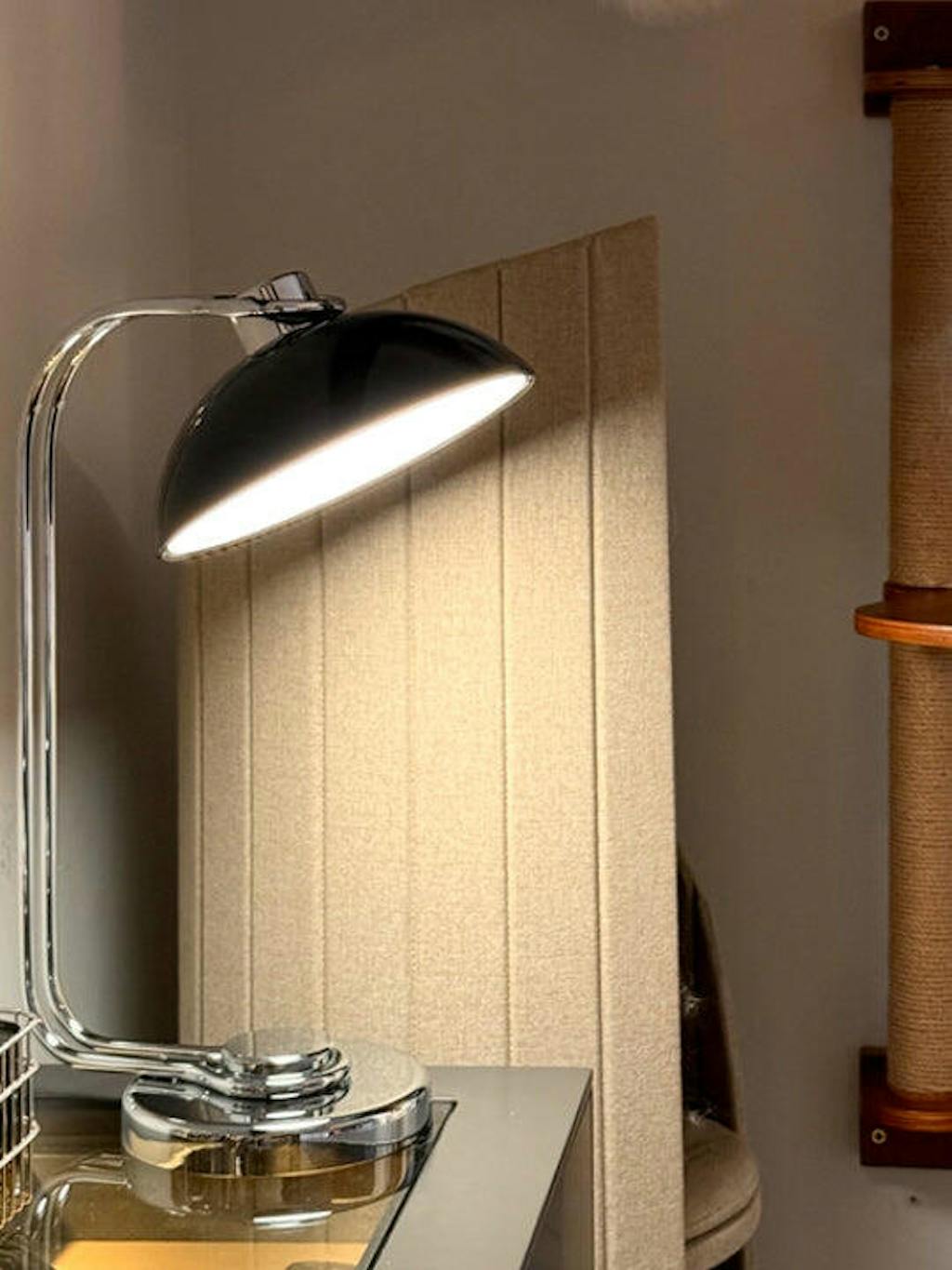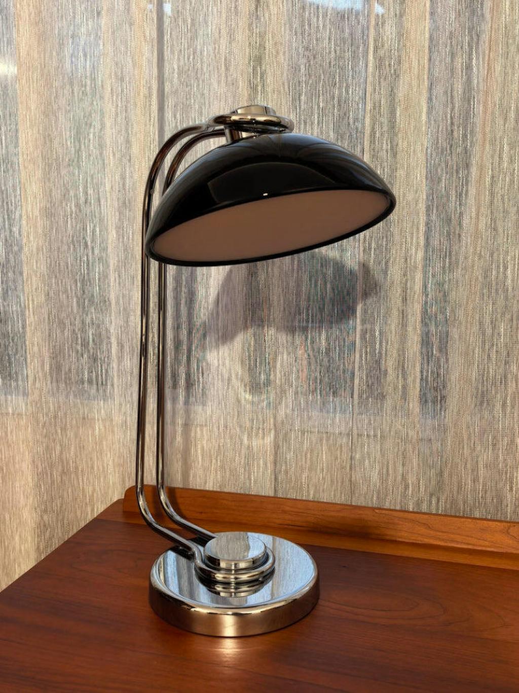 The Domex Table Lamp combines vintage appeal with contemporary elegance. Its glossy black dome shade paired with a chrome-plated curved arm and base delivers a striking, refined look ideal for any desk or reading area.