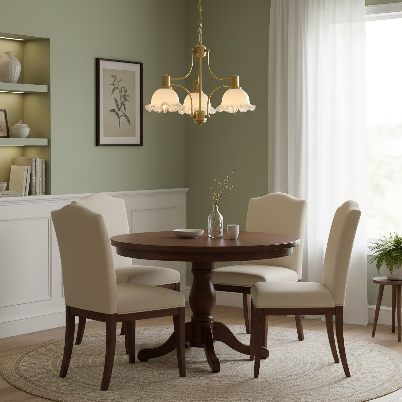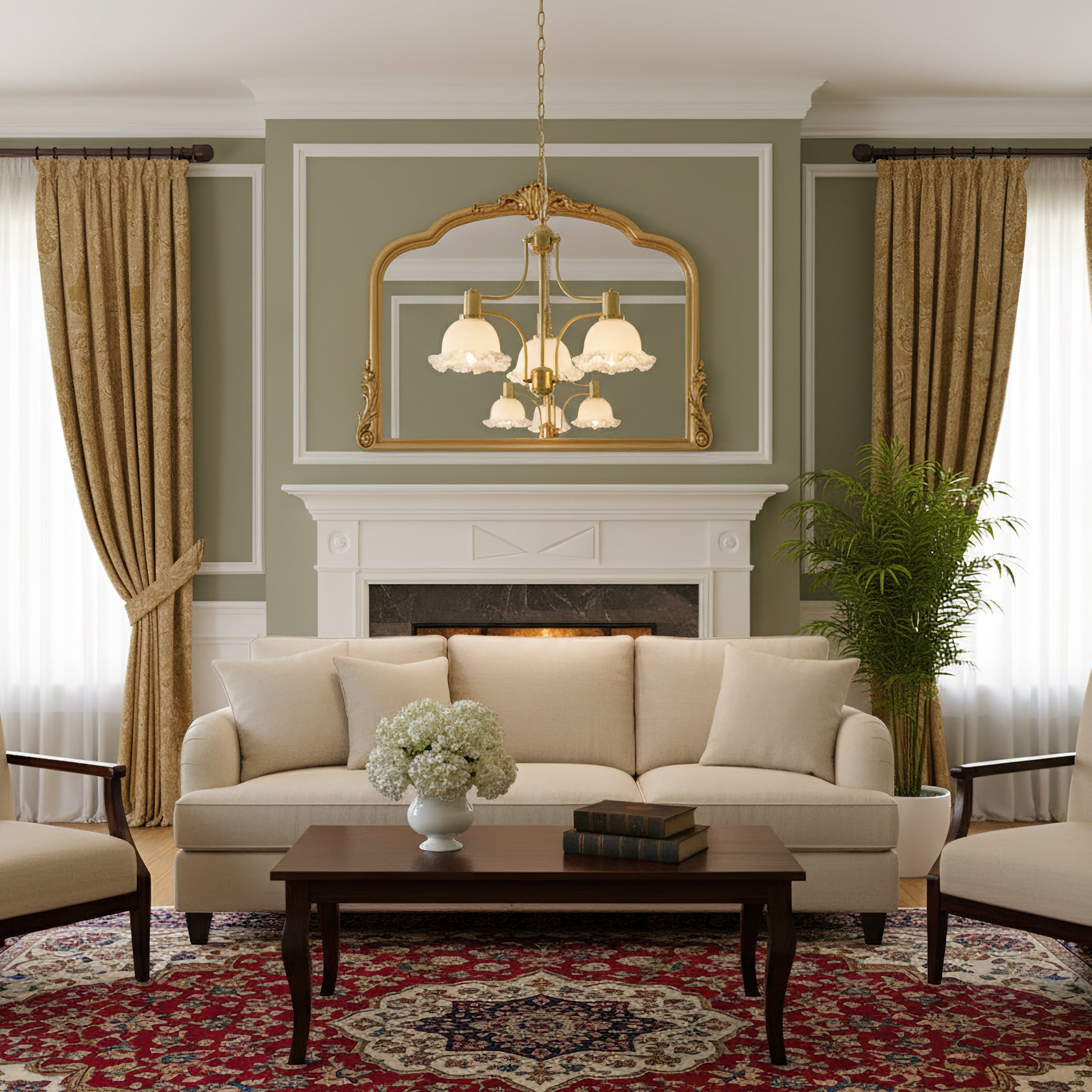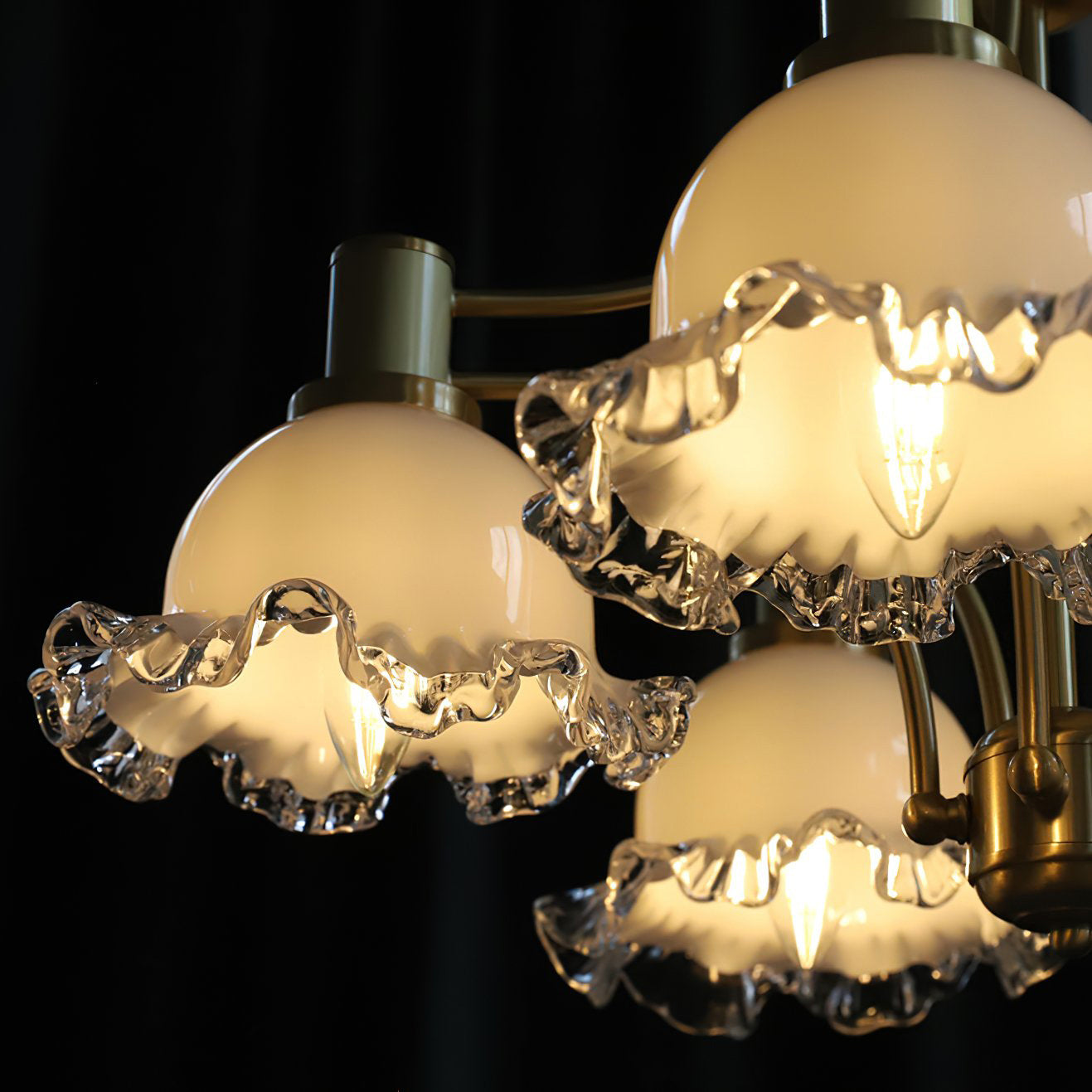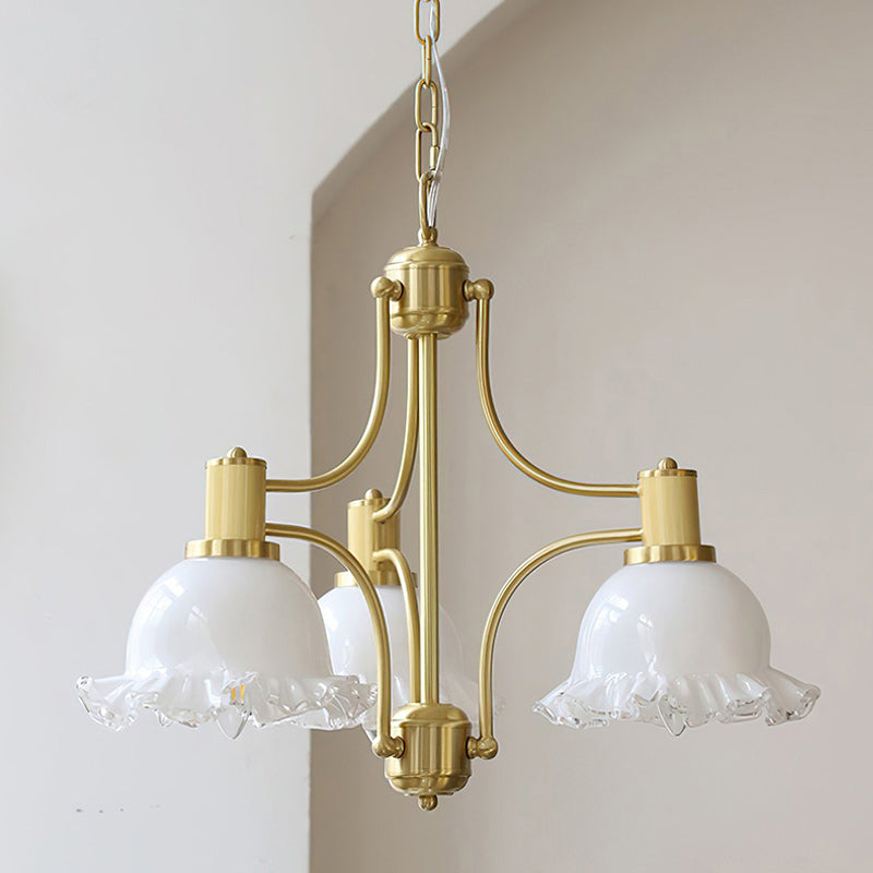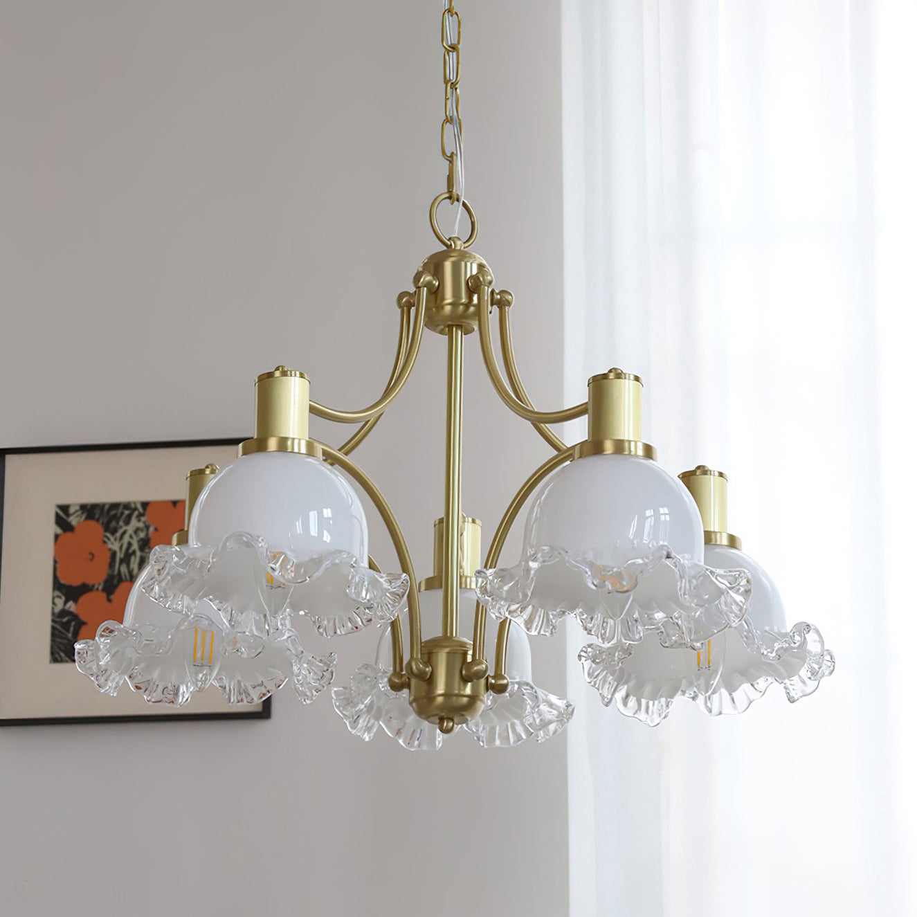 This French Floral Chandelier blends the gentle warmth of brass, the softness of glass, and the dynamic energy of florals. Light filtering through the glass casts a hazy floral silhouette, elevating French romance to a more ethereal quality and infusing any space with the poetic charm of a manor house.