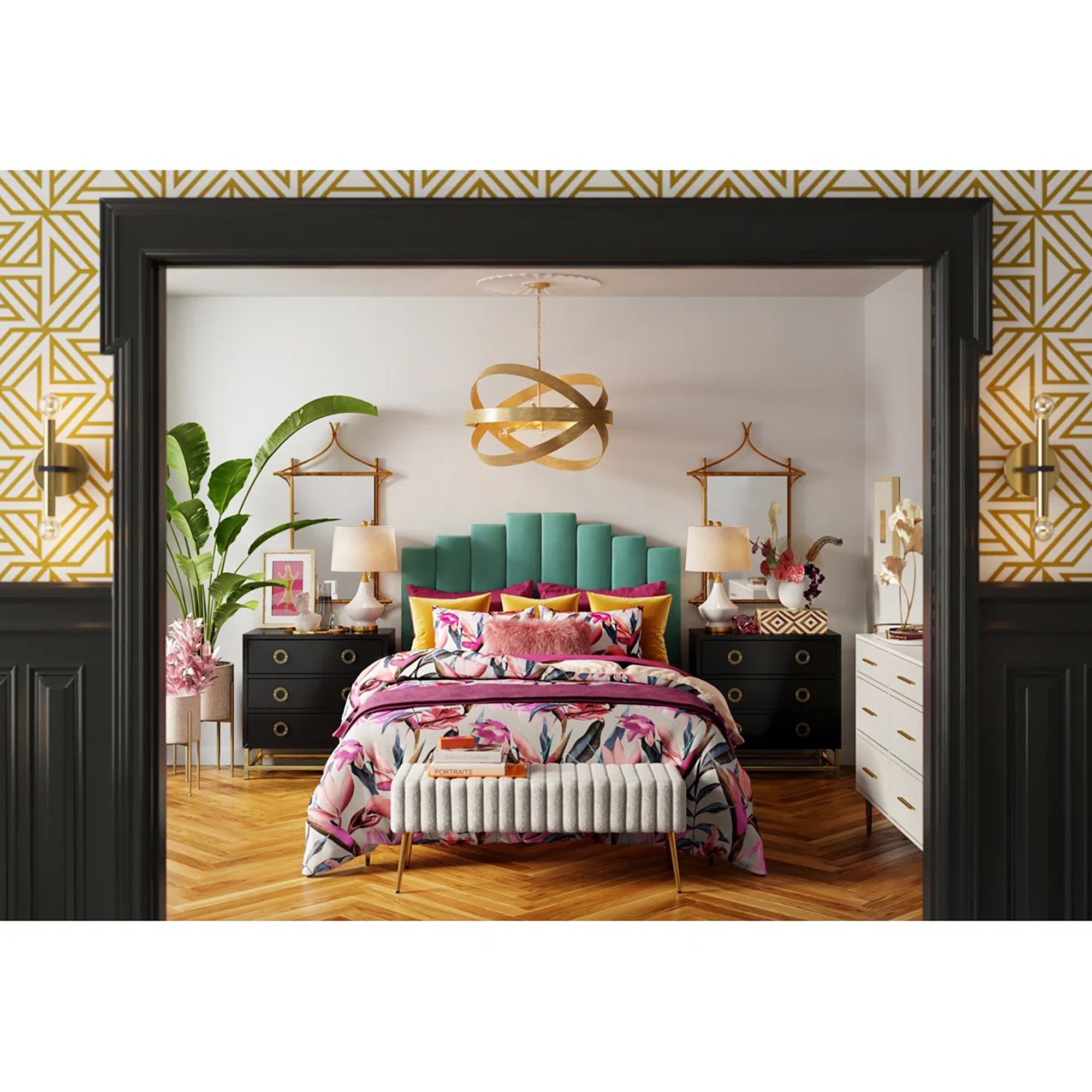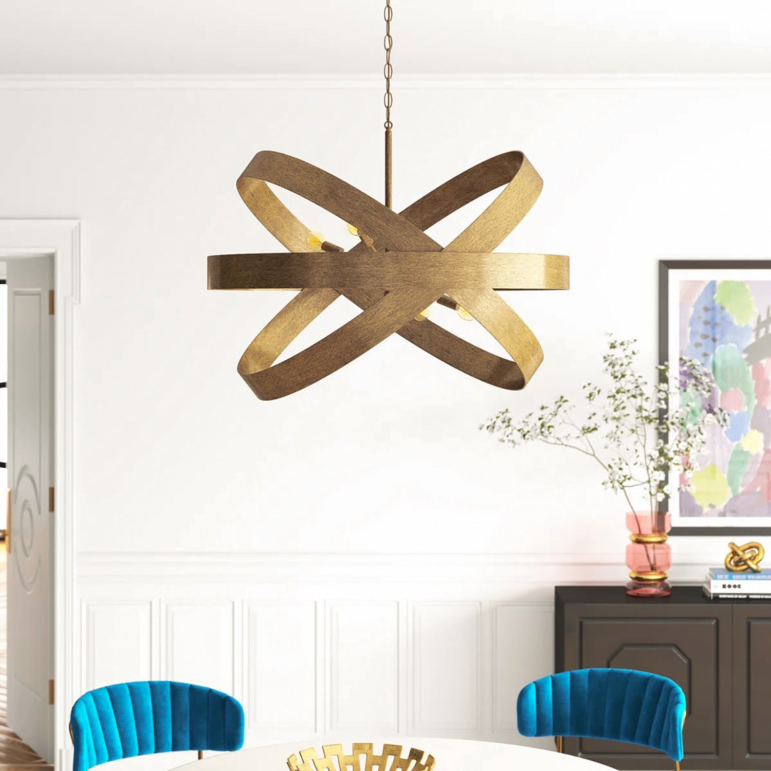 This Leyton Chandelier adds a sculptural statement over your space table with its bold silhouette. It's made from brass. This chandelier showcases a sputnik-shaped shade that measures. It presents a mysterious glossy effect with a classic satellite design. Perfect for use over kitchen counters, dining areas, entryways and living rooms.