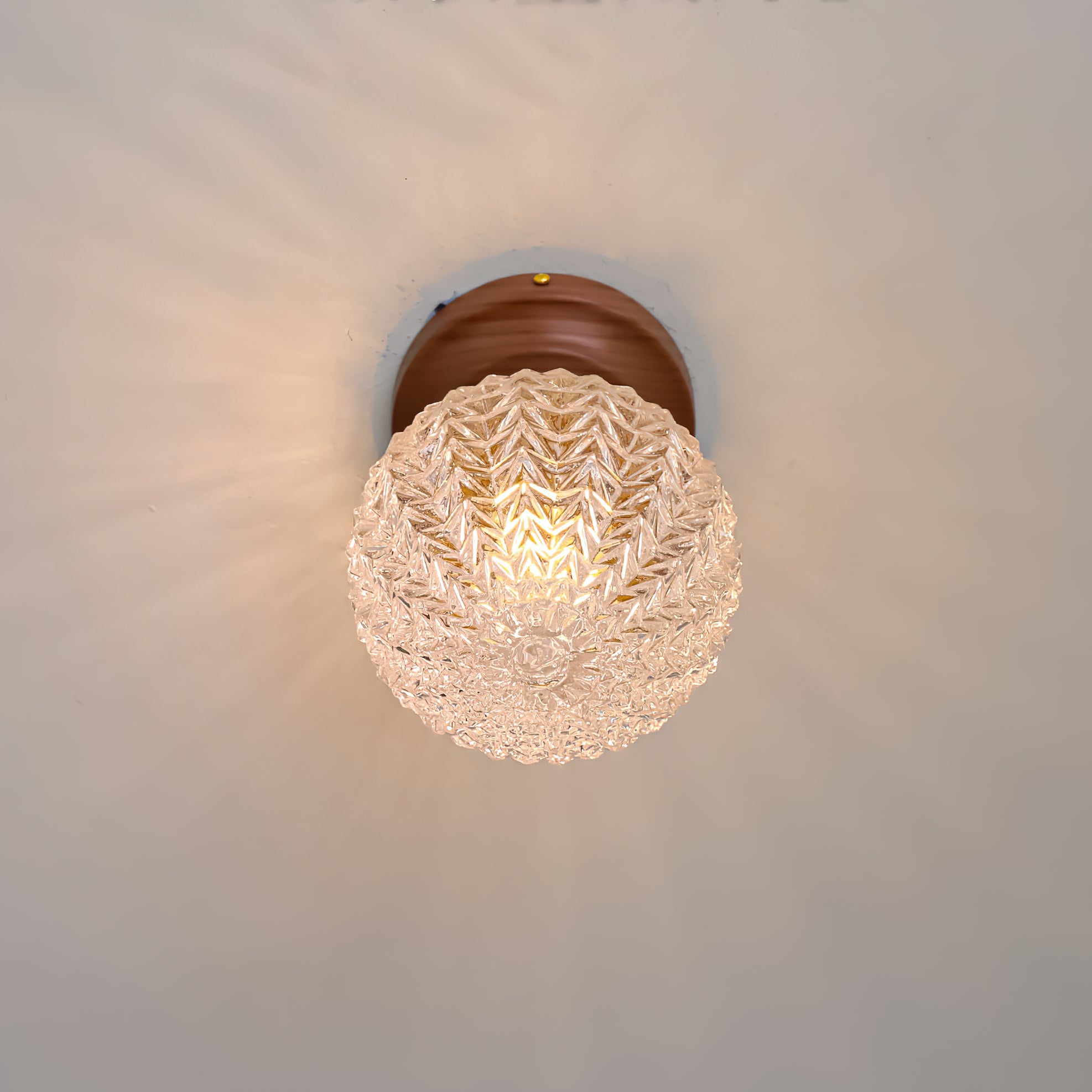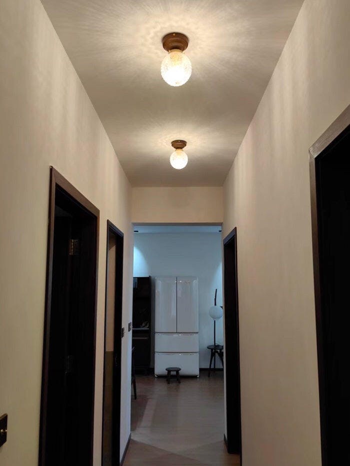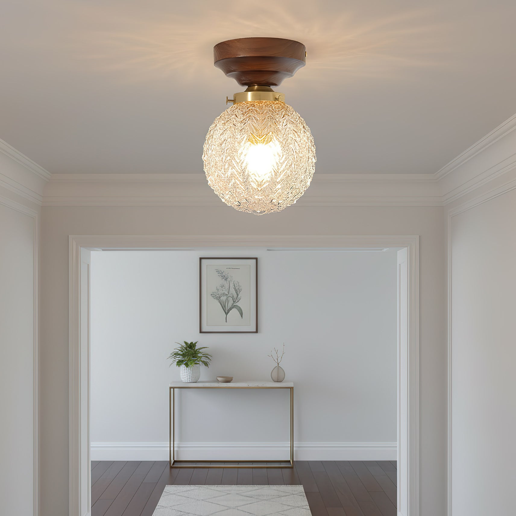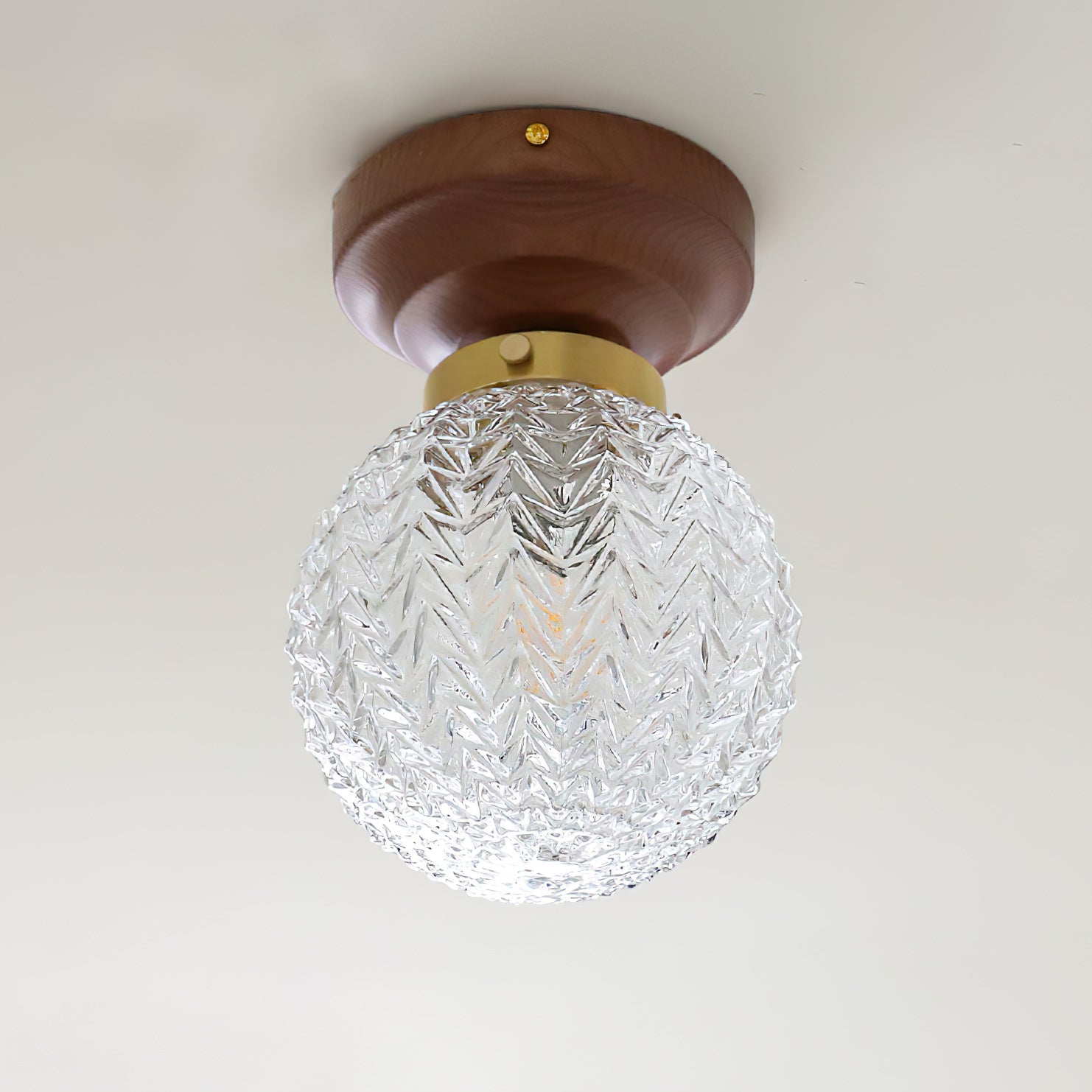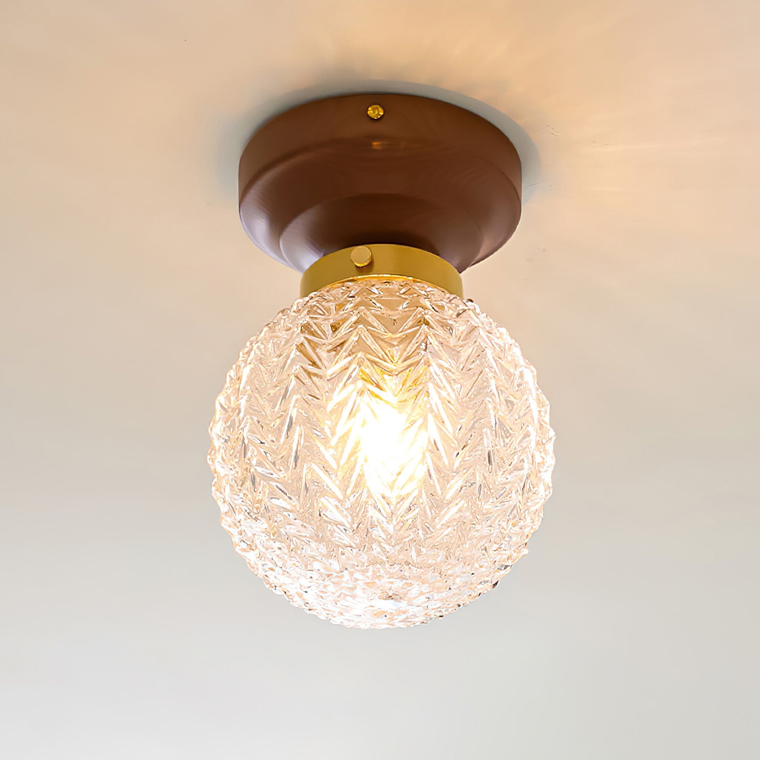 The Lumidora Ceiling Lamp brings contemporary charm to small spaces. With a textured glass globe, warm wooden base, this ceiling light adds a soft, radiant glow to hallways, bathrooms, or any cozy corner needing stylish illumination.
