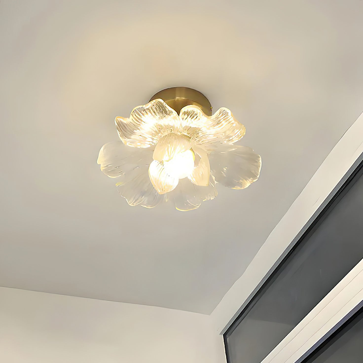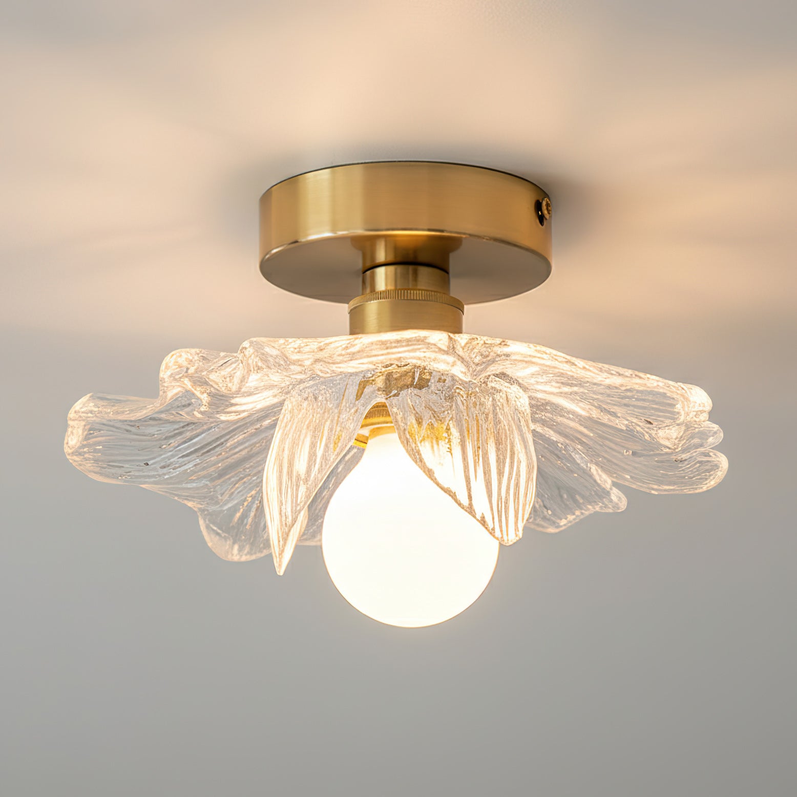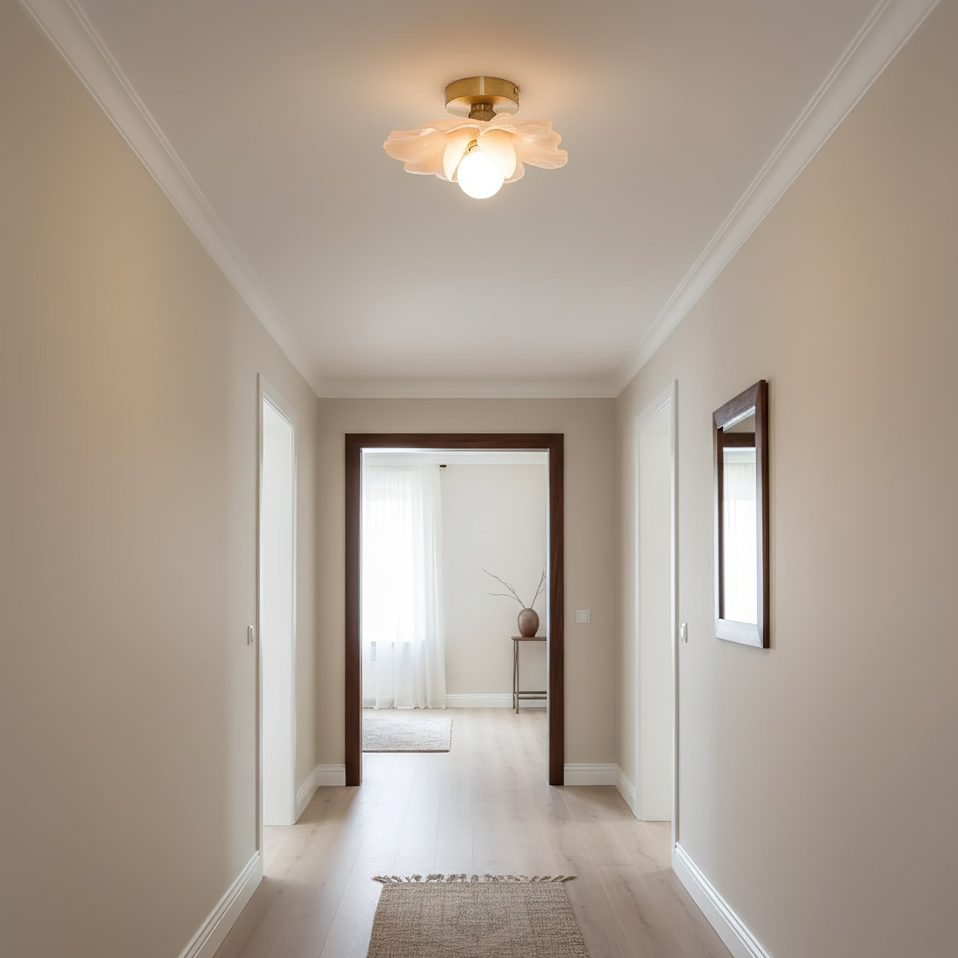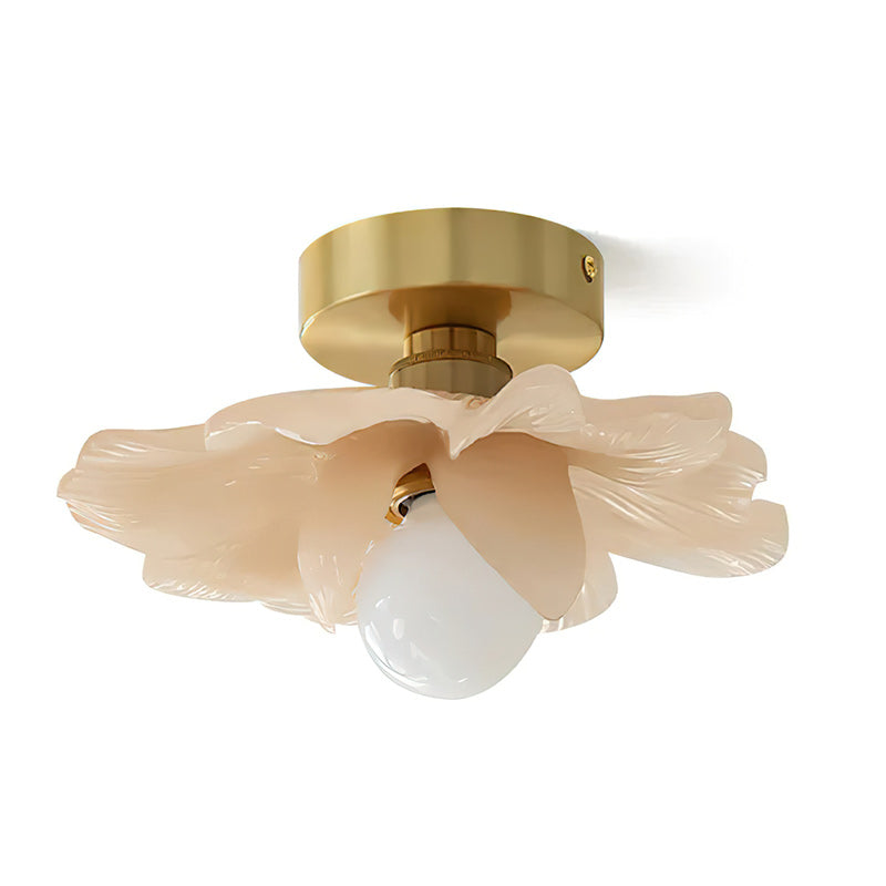 The Modern Blossom ceiling lamp features a textured, petal-inspired resin shade paired with a refined brass base, delivering a soft, romantic illumination that evokes a blooming flower. Its elegant design balances light and shadow beautifully, making it an ideal addition to bedrooms, hallways, or powder rooms, enhancing any area with subtle sophistication and a natural, graceful ambiance.