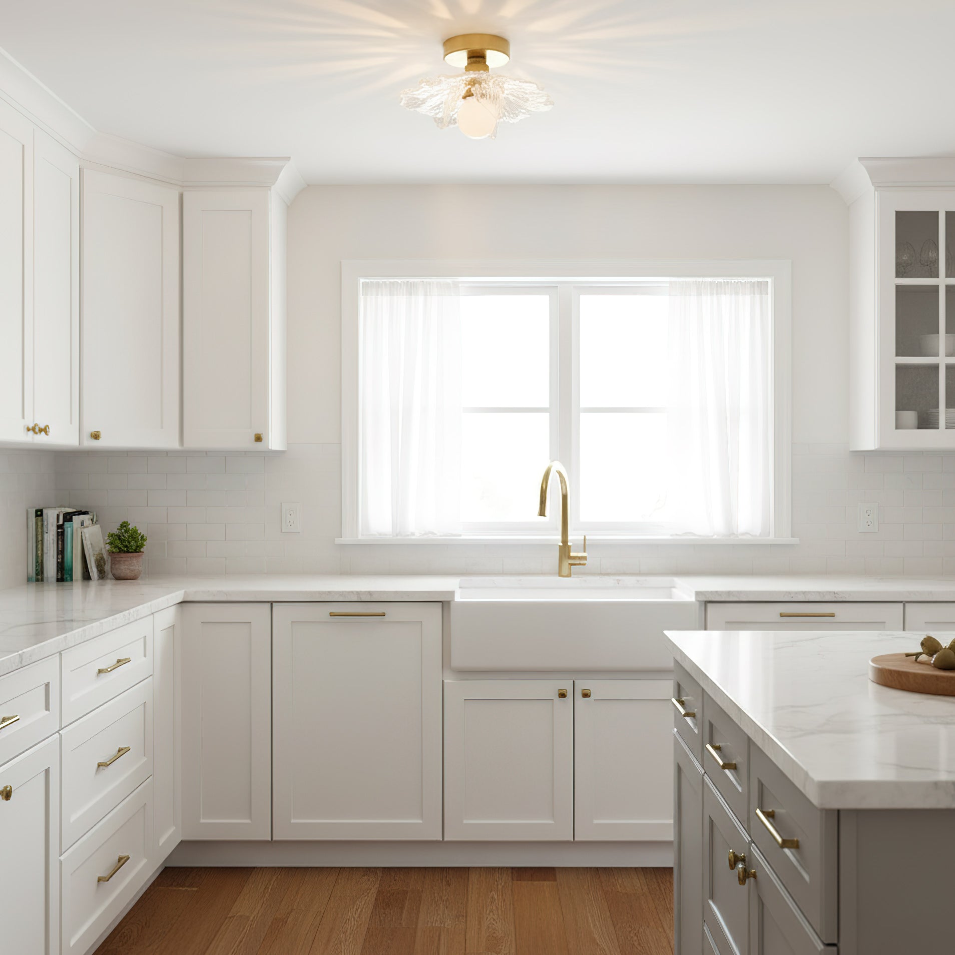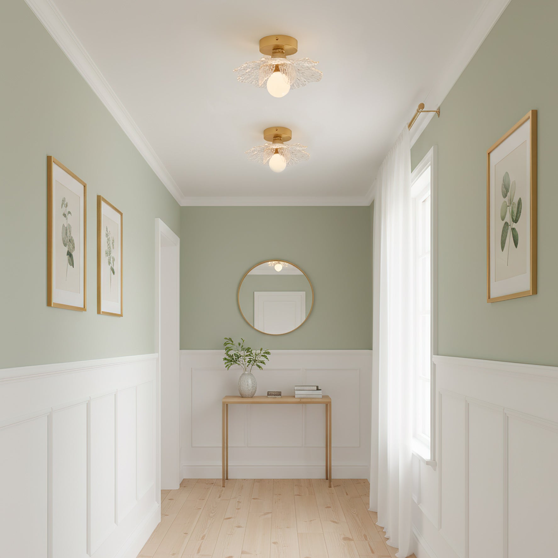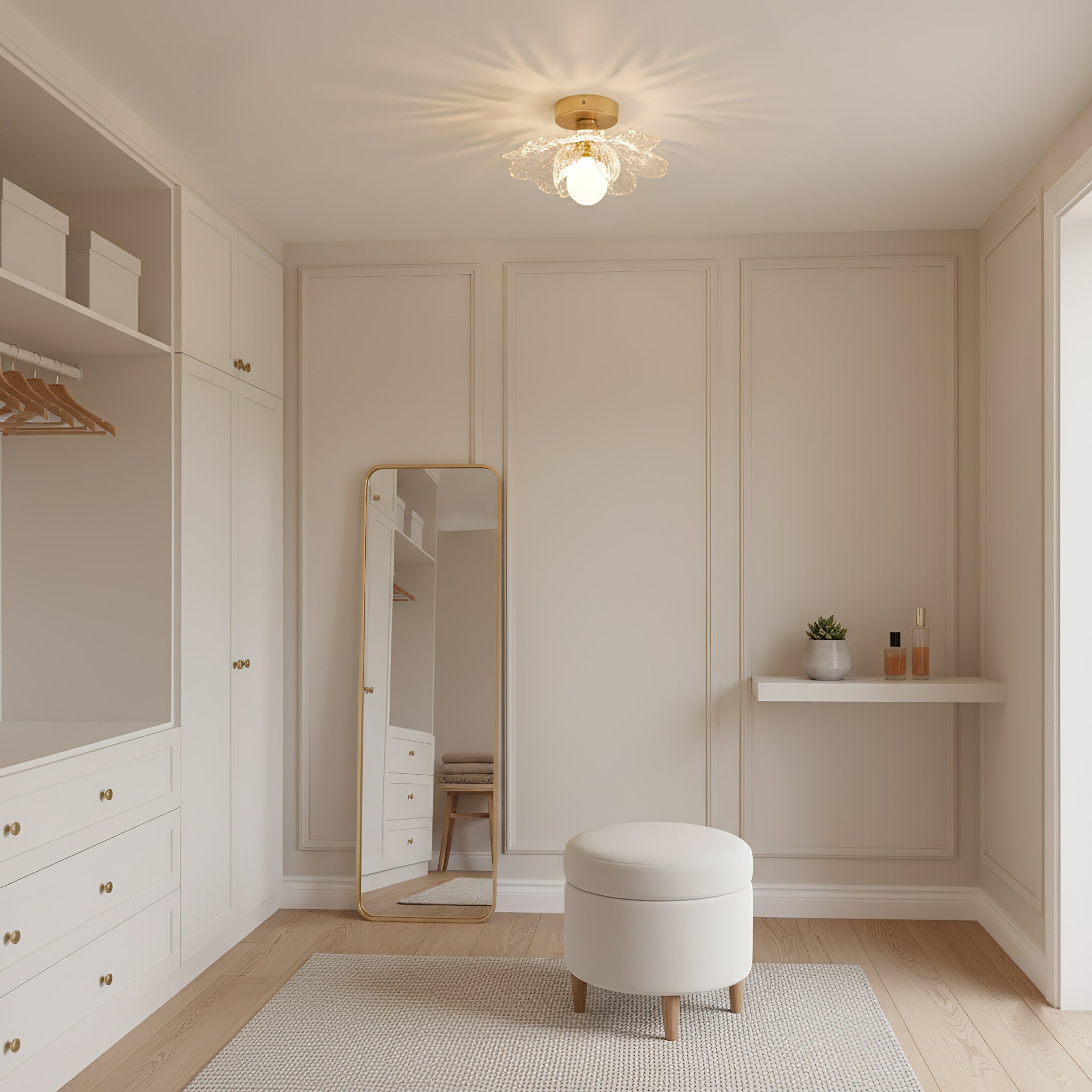 The Modern Blossom ceiling lamp features a textured, petal-inspired resin shade paired with a refined brass base, delivering a soft, romantic illumination that evokes a blooming flower. Its elegant design balances light and shadow beautifully, making it an ideal addition to bedrooms, hallways, or powder rooms, enhancing any area with subtle sophistication and a natural, graceful ambiance.