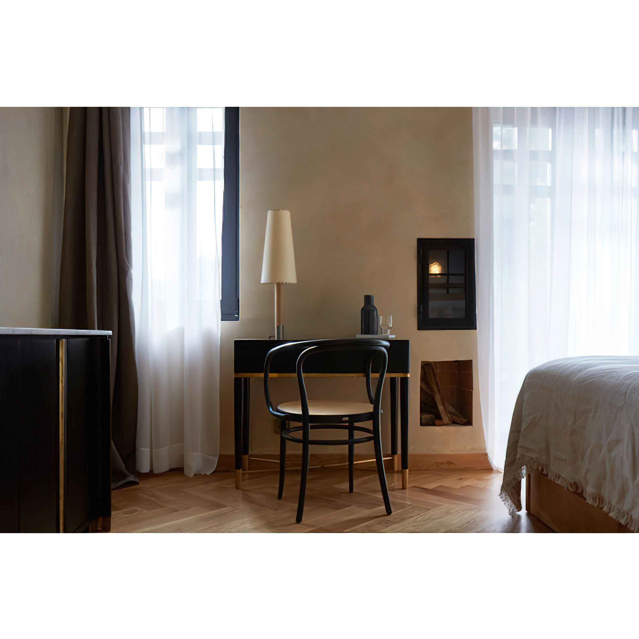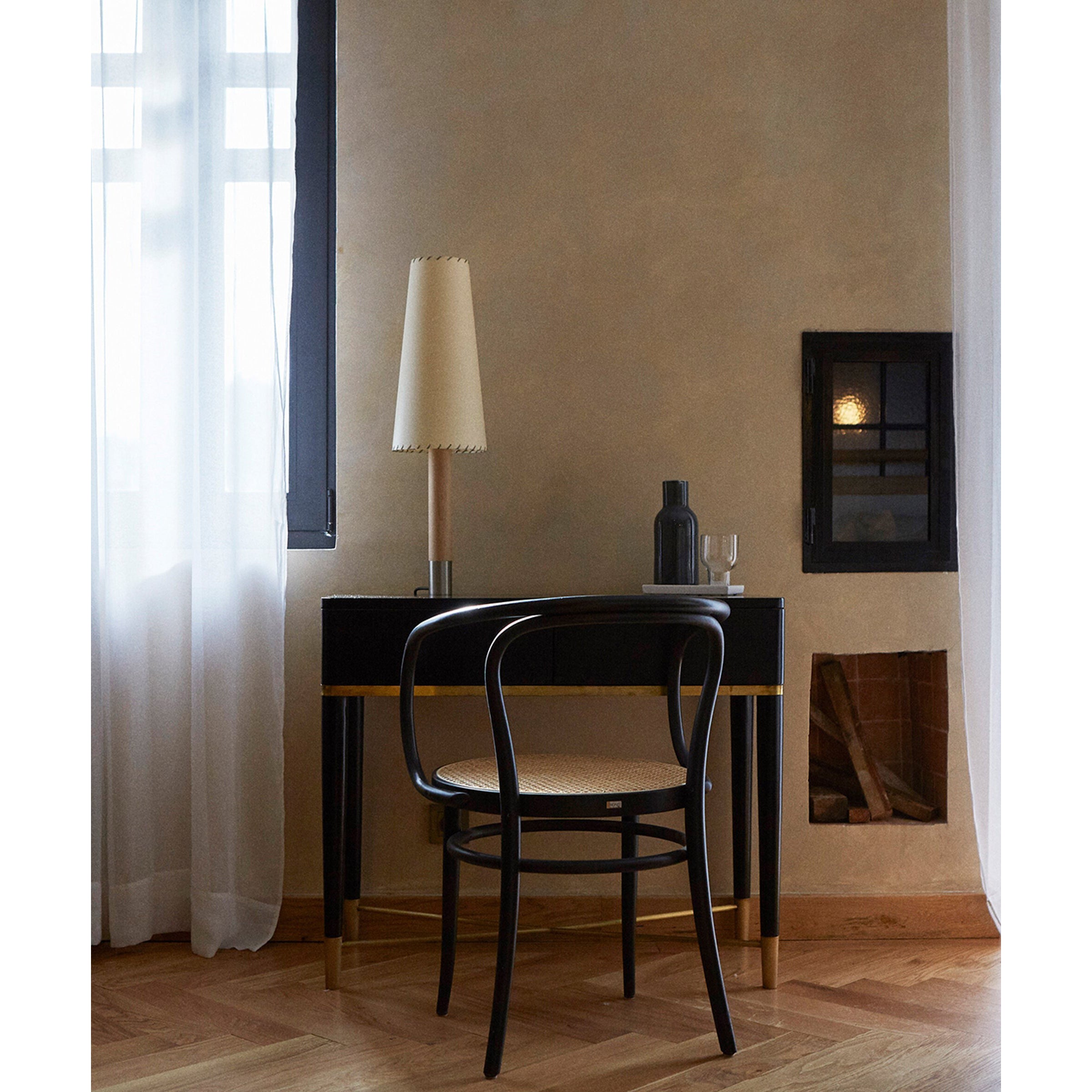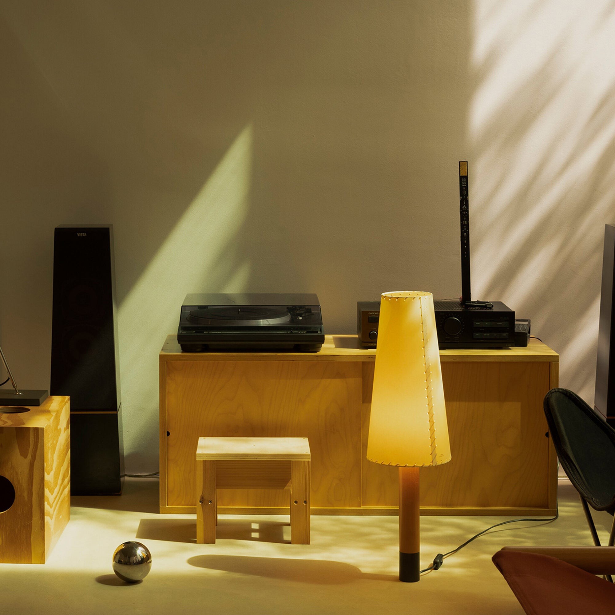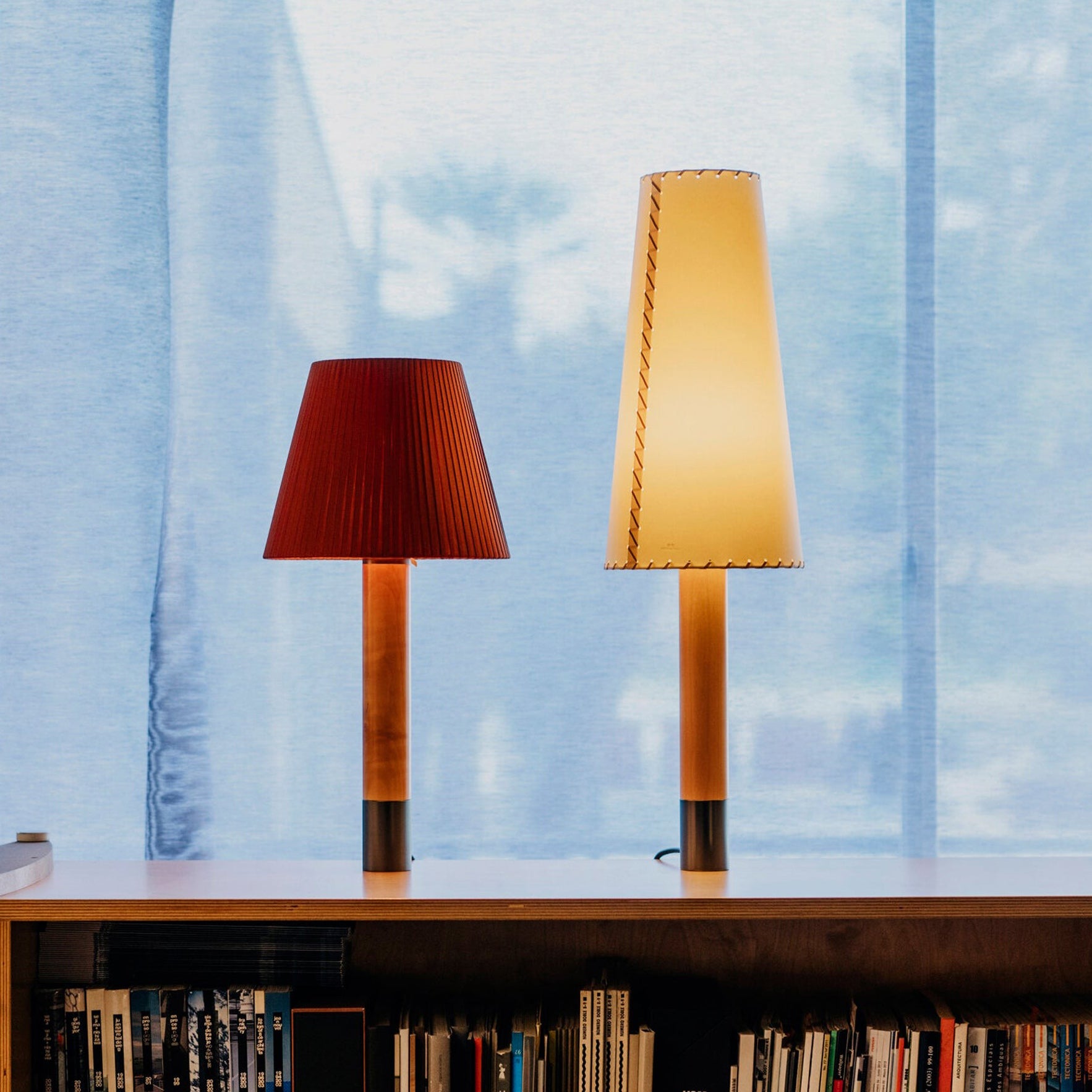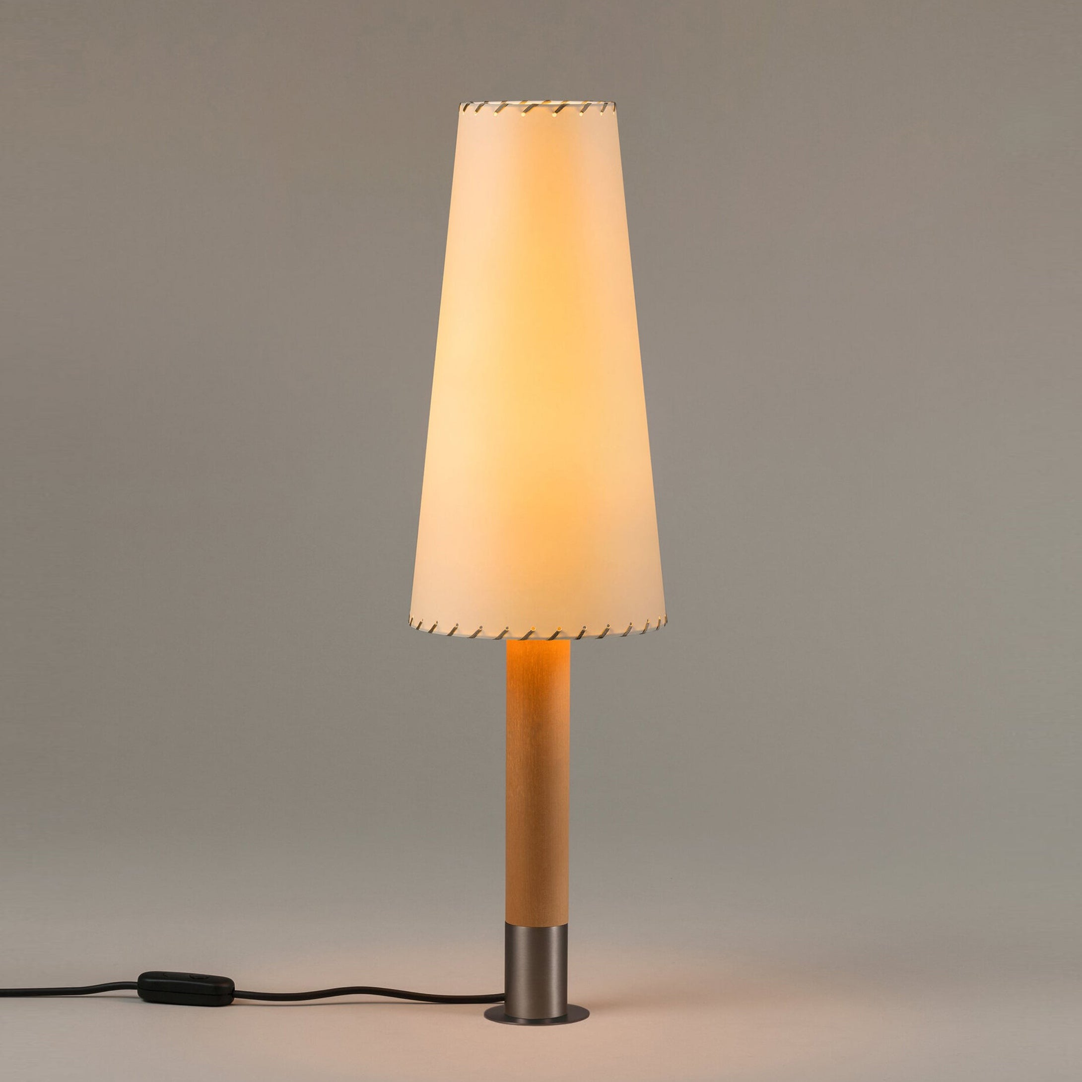 A wooden column, the Basica Table Lamp held up by a heavy metal base with the same diameter, supports shade in fabric. While a base of the same diameter balances well, you can also opt for a wider disc base. The Basica table lamp heralds a resurgence of natural materials such as wood.