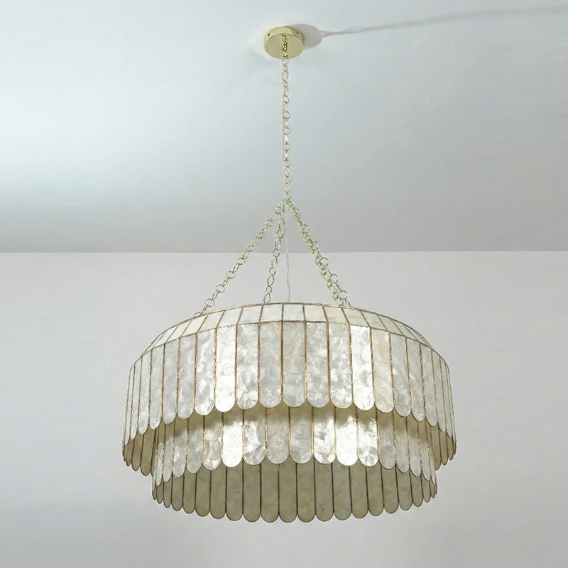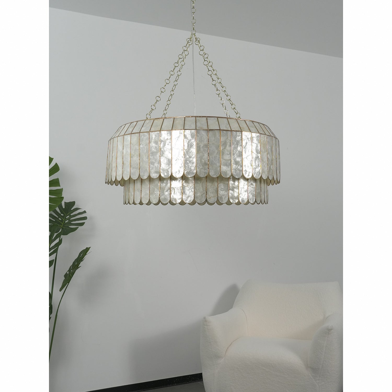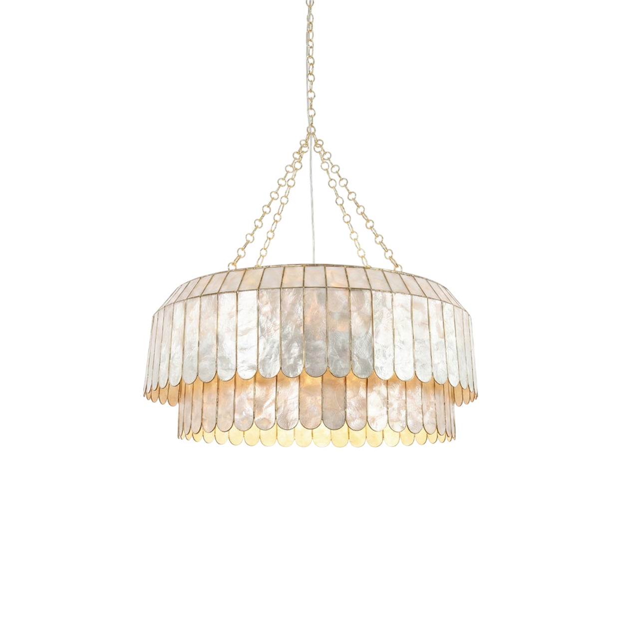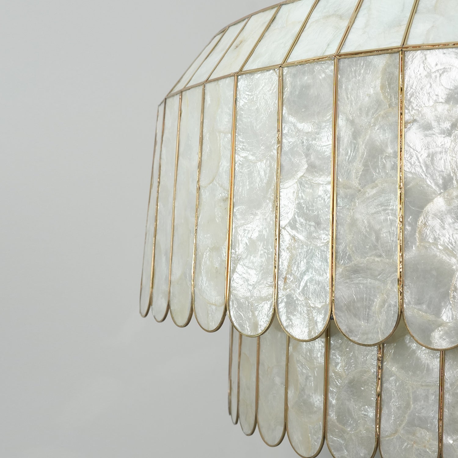 This handcrafted Madelyn Capiz Shell Chandelier is made from high-quality shells and brass, welded together with exquisite craftsmanship, radiating a subtle yet luxurious glow that illuminates any interior space. The delicate light-transmitting properties of the natural shells create a warm ambiance, enhancing the beauty of any room with timeless elegance and serene sophistication.