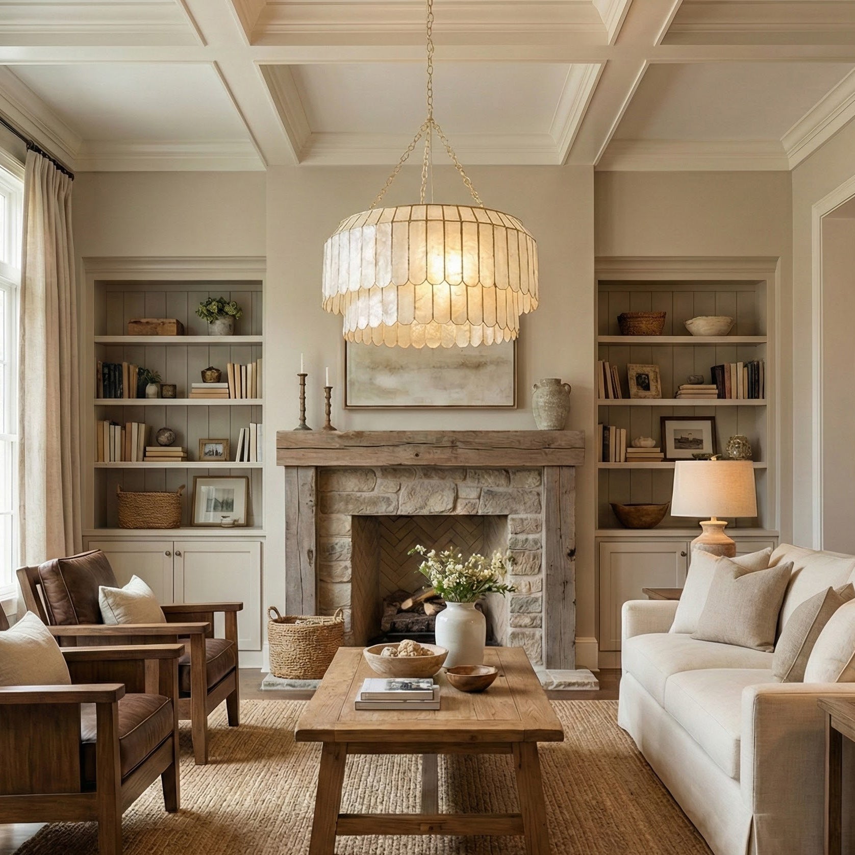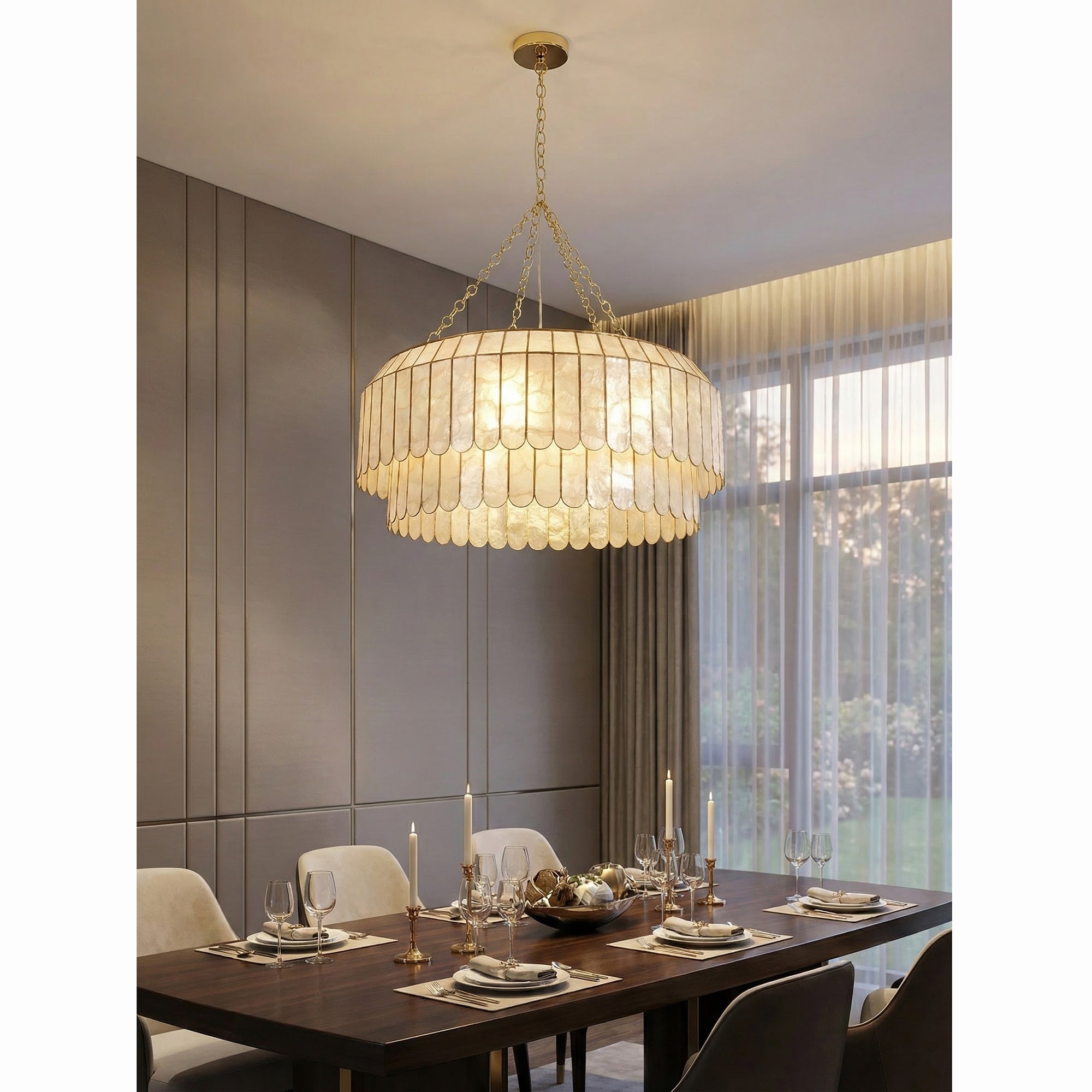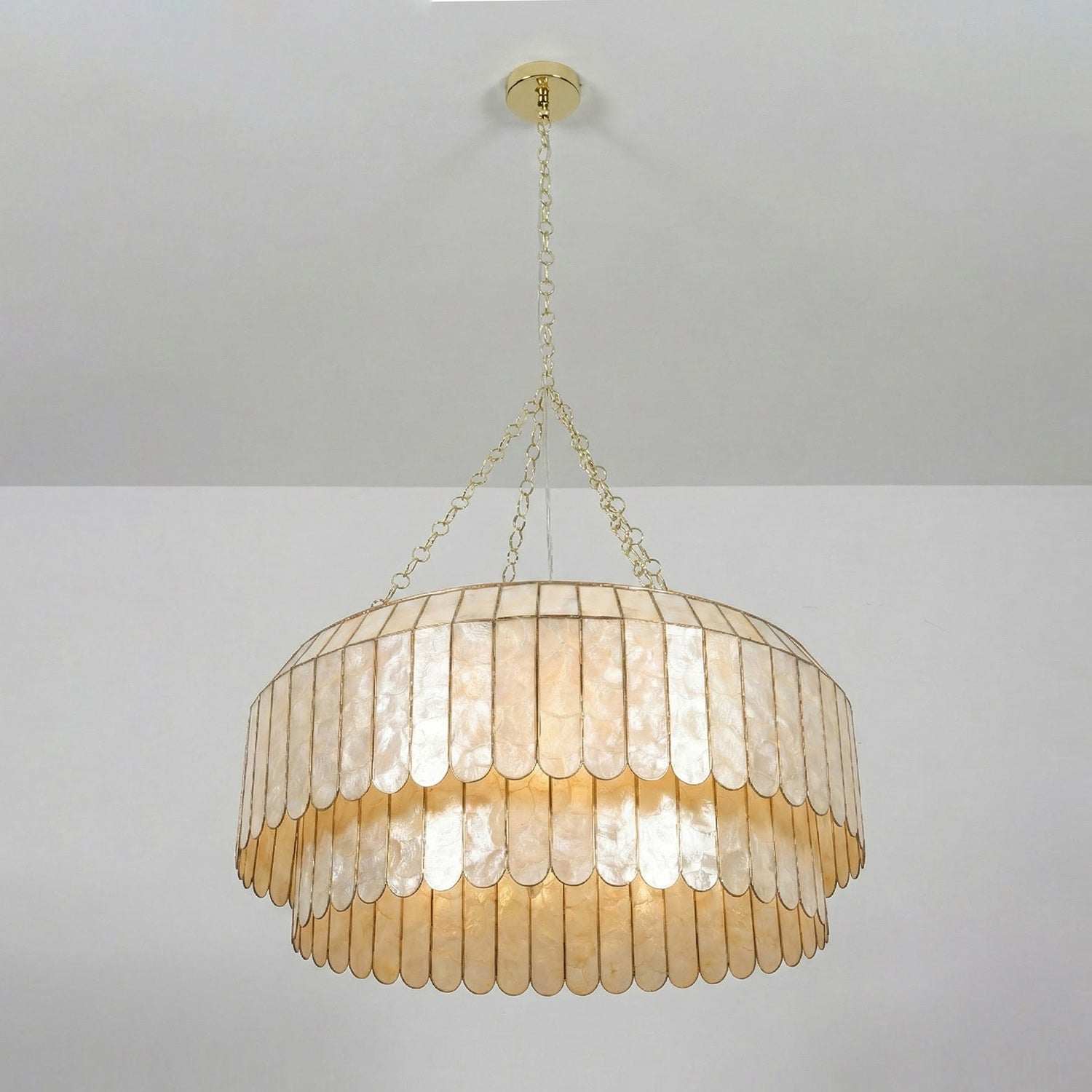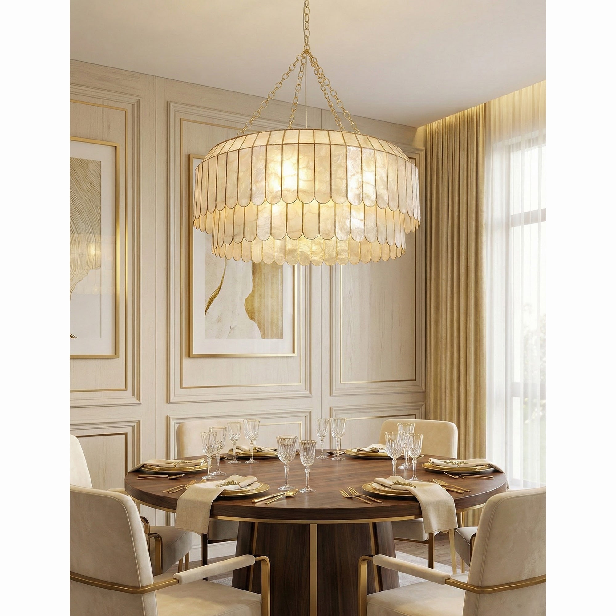 This handcrafted Madelyn Capiz Shell Chandelier is made from high-quality shells and brass, welded together with exquisite craftsmanship, radiating a subtle yet luxurious glow that illuminates any interior space. The delicate light-transmitting properties of the natural shells create a warm ambiance, enhancing the beauty of any room with timeless elegance and serene sophistication.
