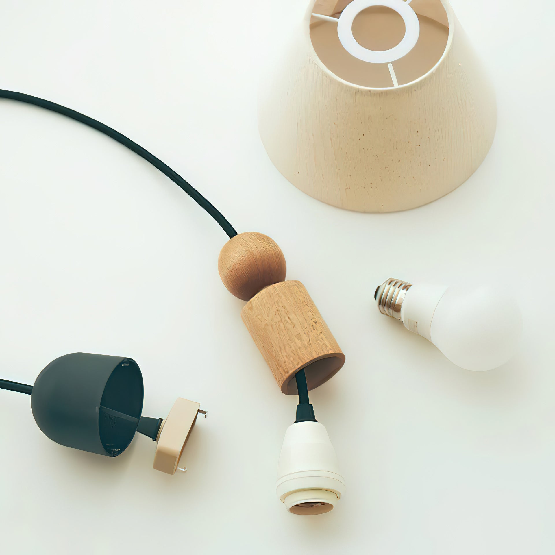 - A combination of wood and fabric lampshades creates a warm feel, while black ropes bring the space together.