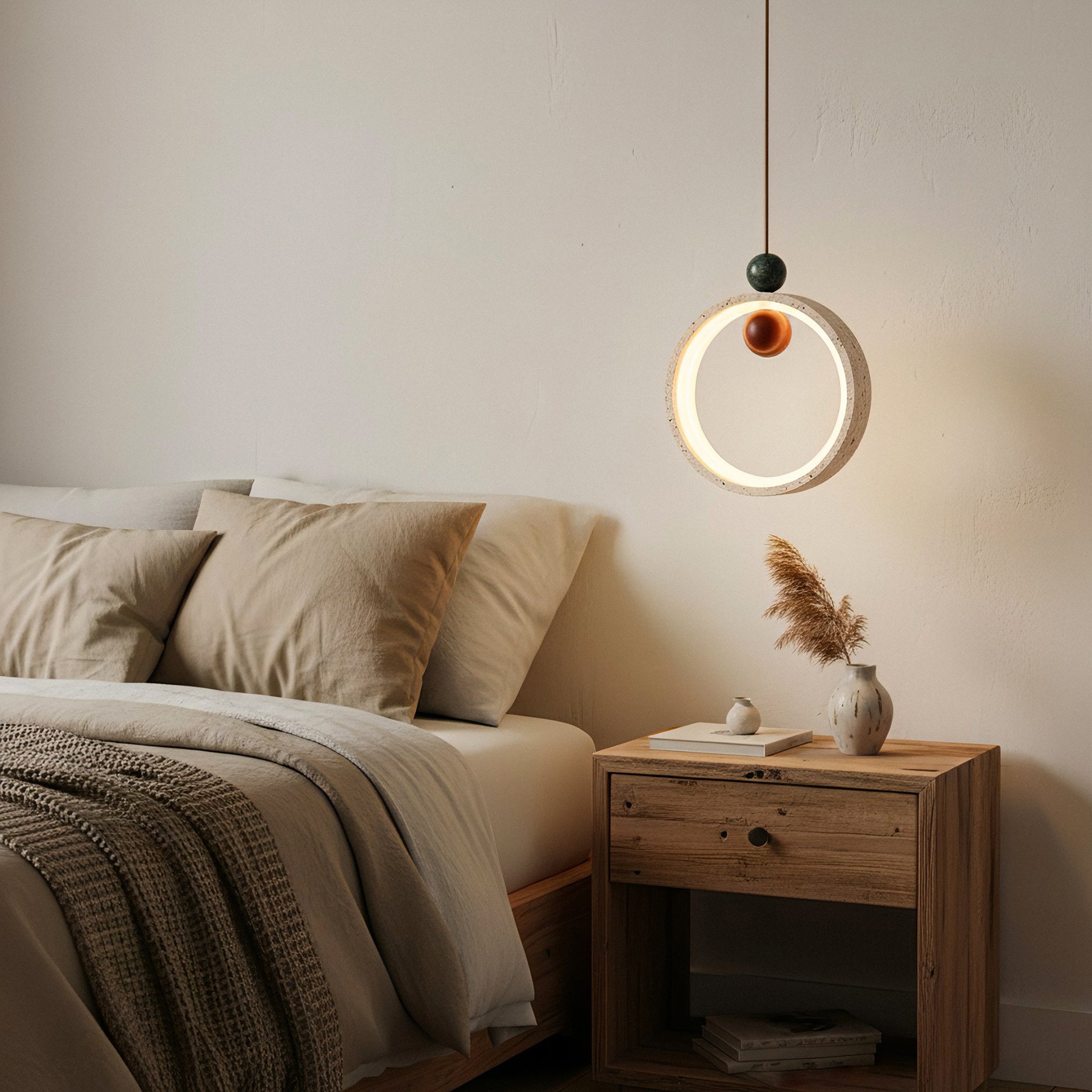 The unique Runde Travertine Pendant Lamp offers a distinctive, natural texture and subtle color variations, making each pendant light a unique work of art that enhances your home decor with its organic beauty. This versatile pendant light is ideal for a variety of settings, from a bedside reading nook to a kitchen island or a playful children's room, providing focused illumination and a stylish focal point that complements any interior design.