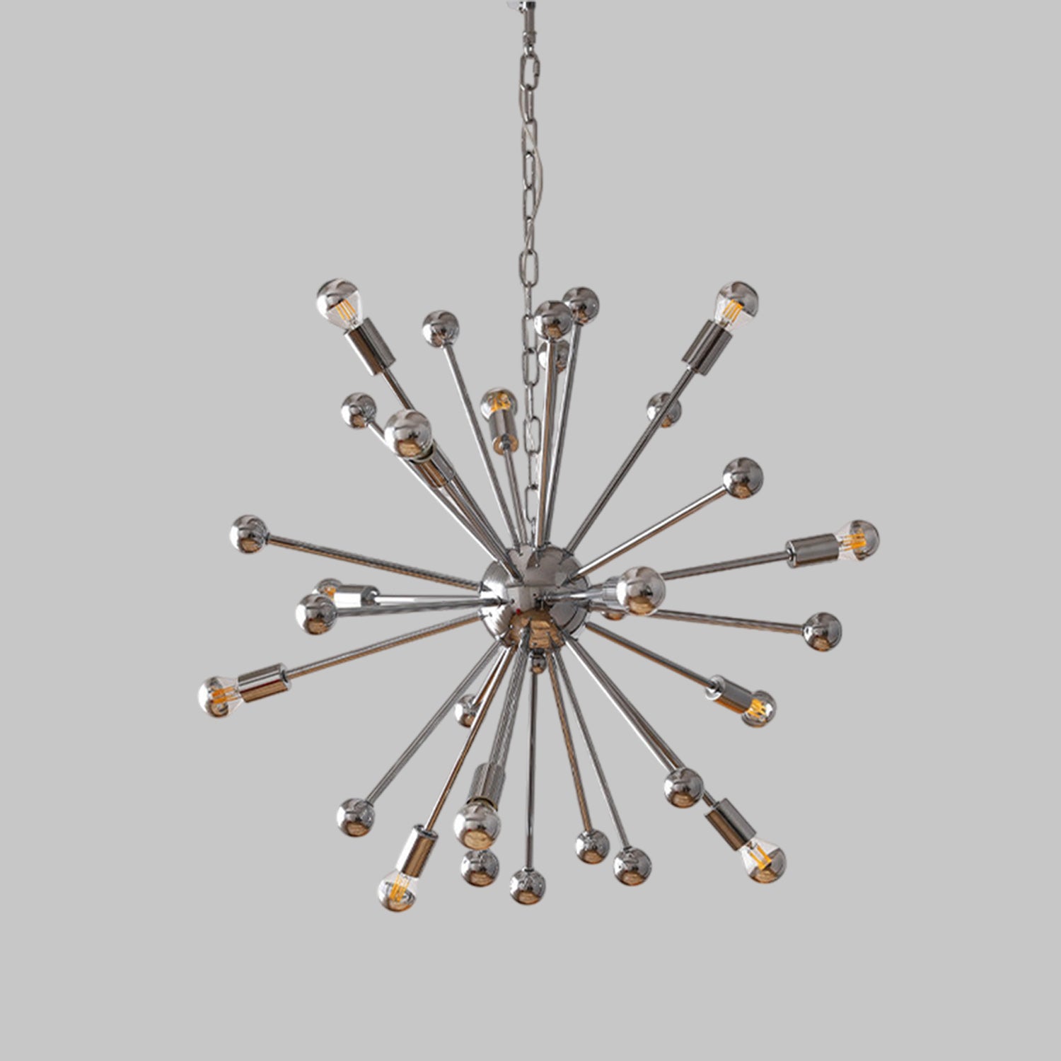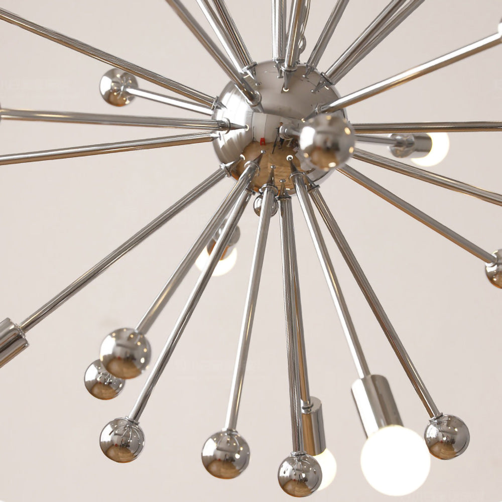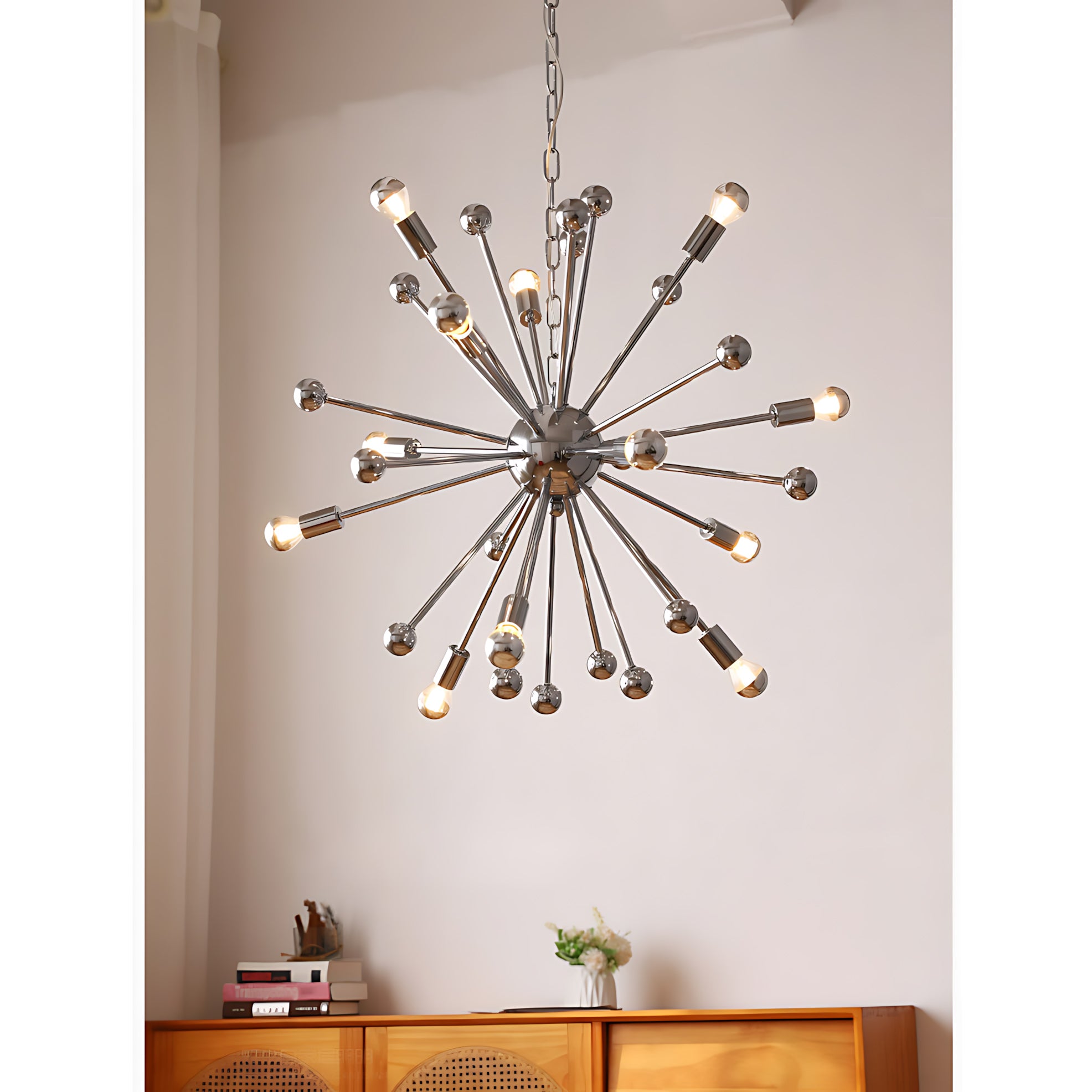 A striking fixture that merges vintage aesthetics with contemporary elegance, the Safavieh Starburst Chandelier commands attention in expansive spaces like living rooms, dining areas, and foyers. Its distinctive design features radiating chrome arms extending from a polished central sphere, each arm finished with either a luminous bulb or reflective orb for a captivating geometric effect.