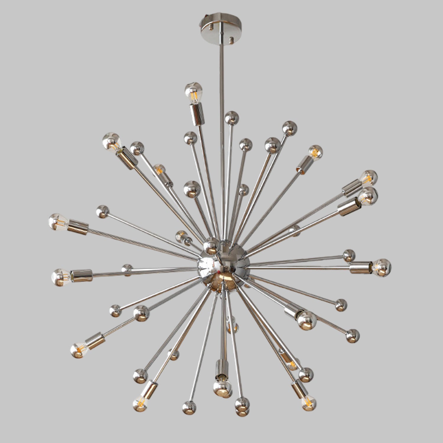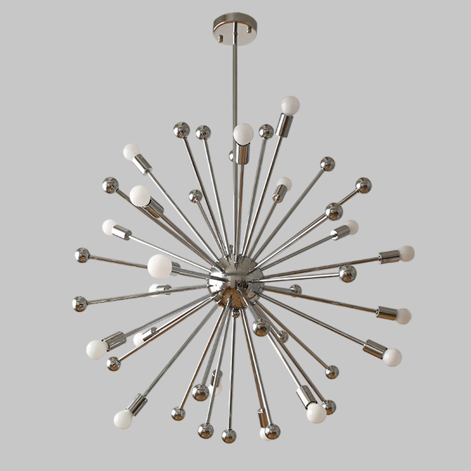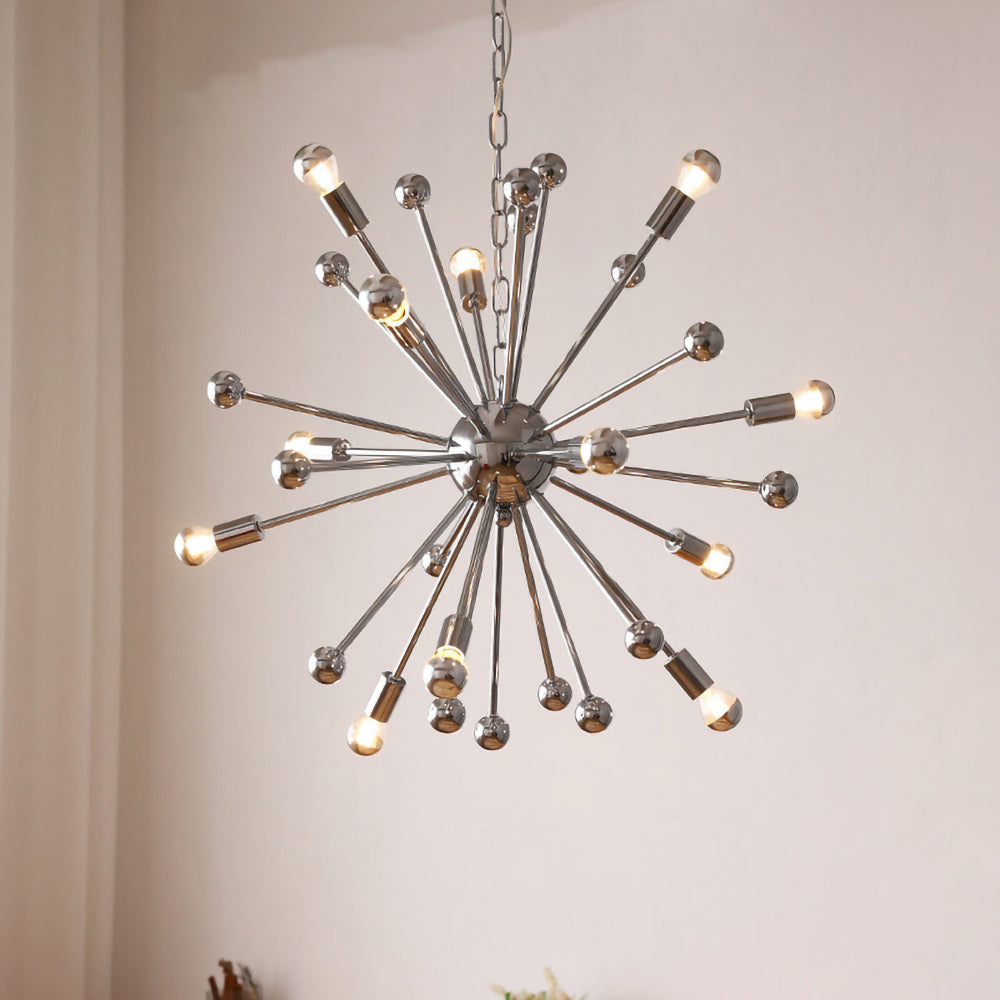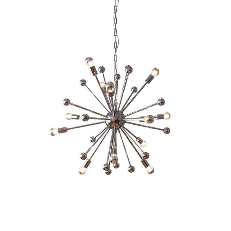 A striking fixture that merges vintage aesthetics with contemporary elegance, the Safavieh Starburst Chandelier commands attention in expansive spaces like living rooms, dining areas, and foyers. Its distinctive design features radiating chrome arms extending from a polished central sphere, each arm finished with either a luminous bulb or reflective orb for a captivating geometric effect.