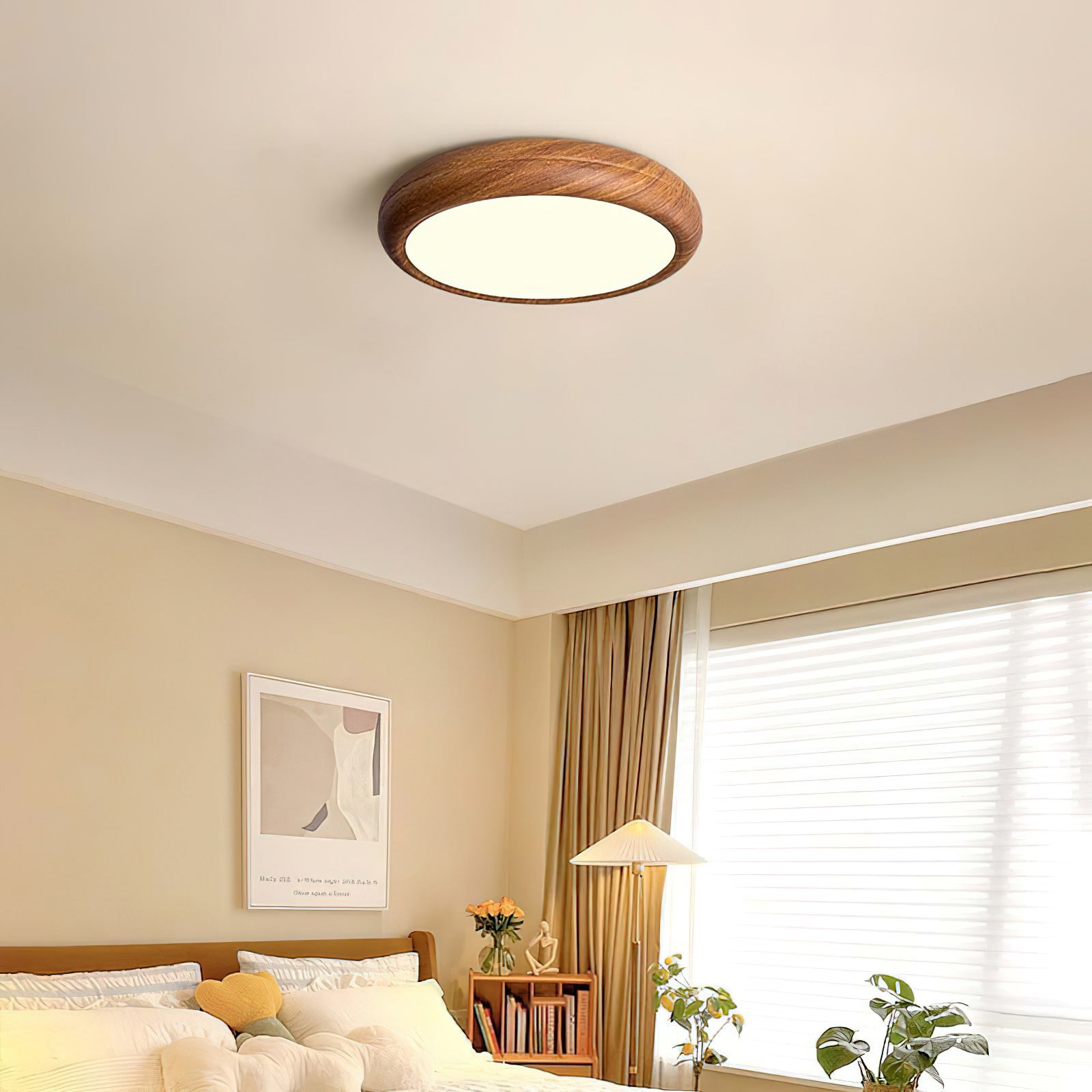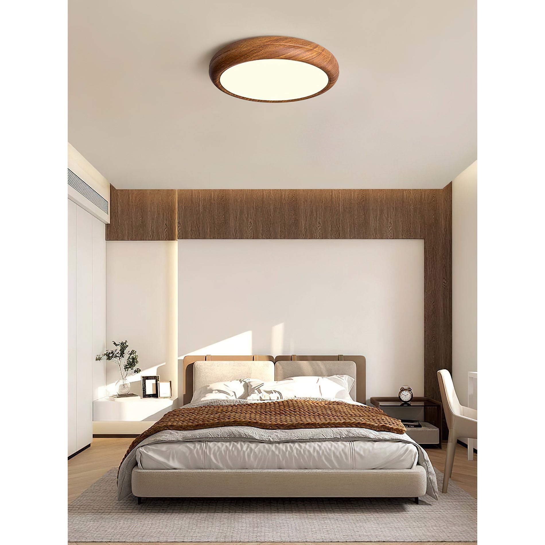 - The Minimalist wood-style flush mount ceiling light features a sleek, low-profile design with a smooth surface and a straightforward, unembellished aesthetic.