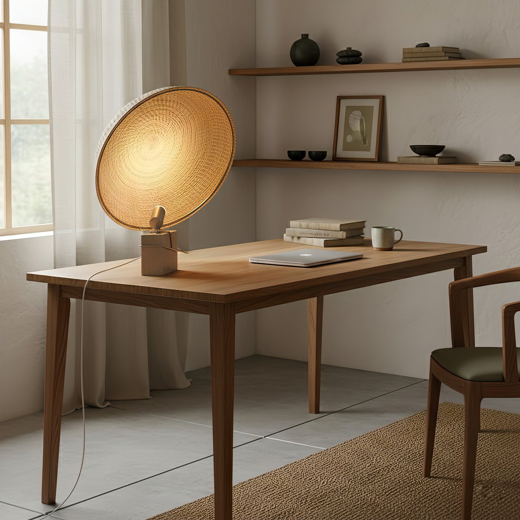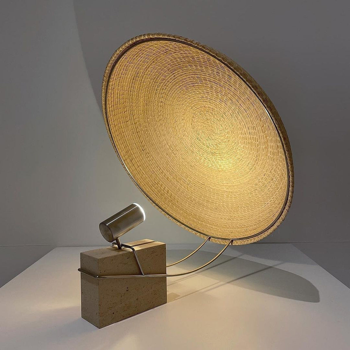 The Tempo Table Light features a warm, ambient glow that softly accentuates its surroundings. Its rattan cover is ingeniously shaped like a shield, creating a distinctive look. The interplay between the delicate metal frame and a sturdy travertine base, ensuring both stability and elegance.