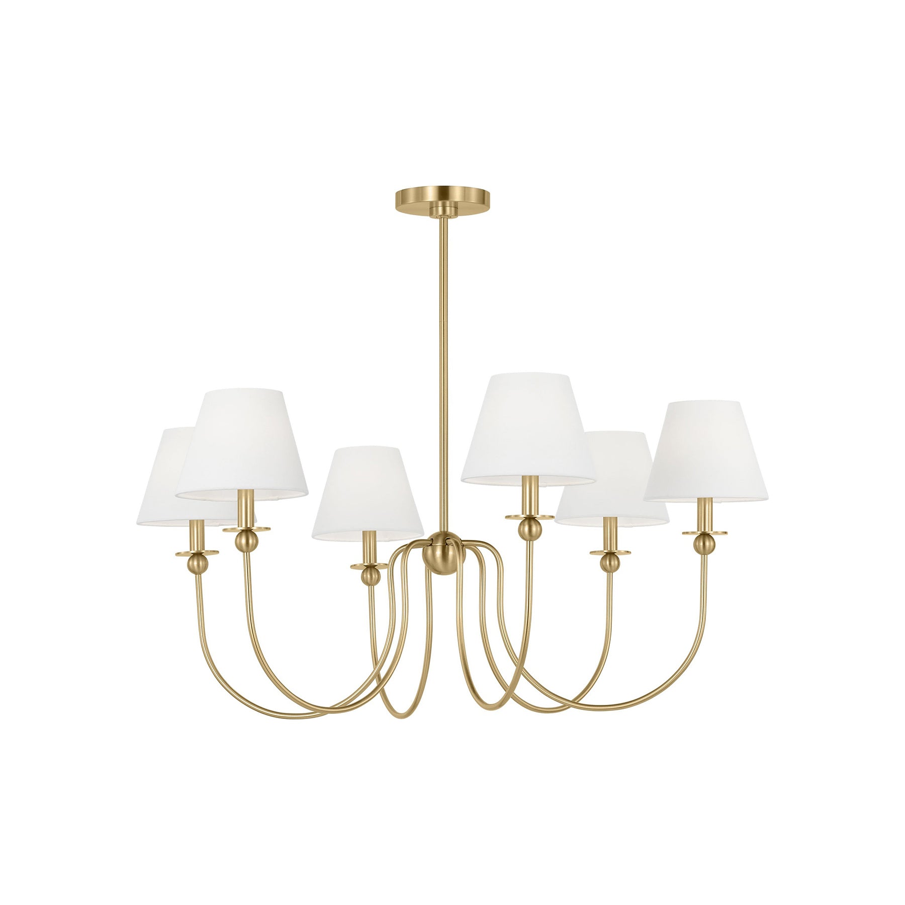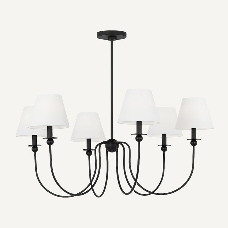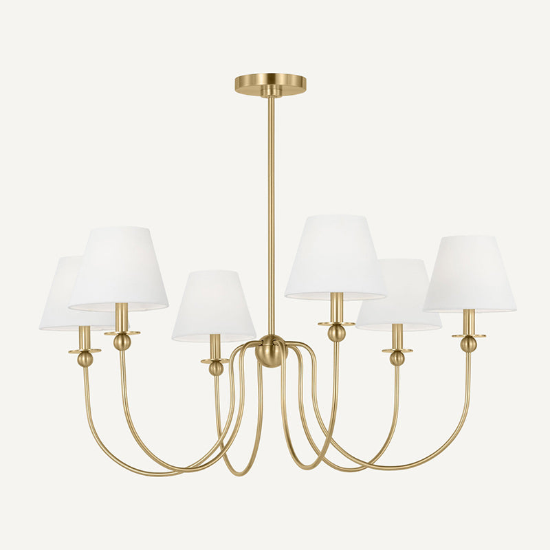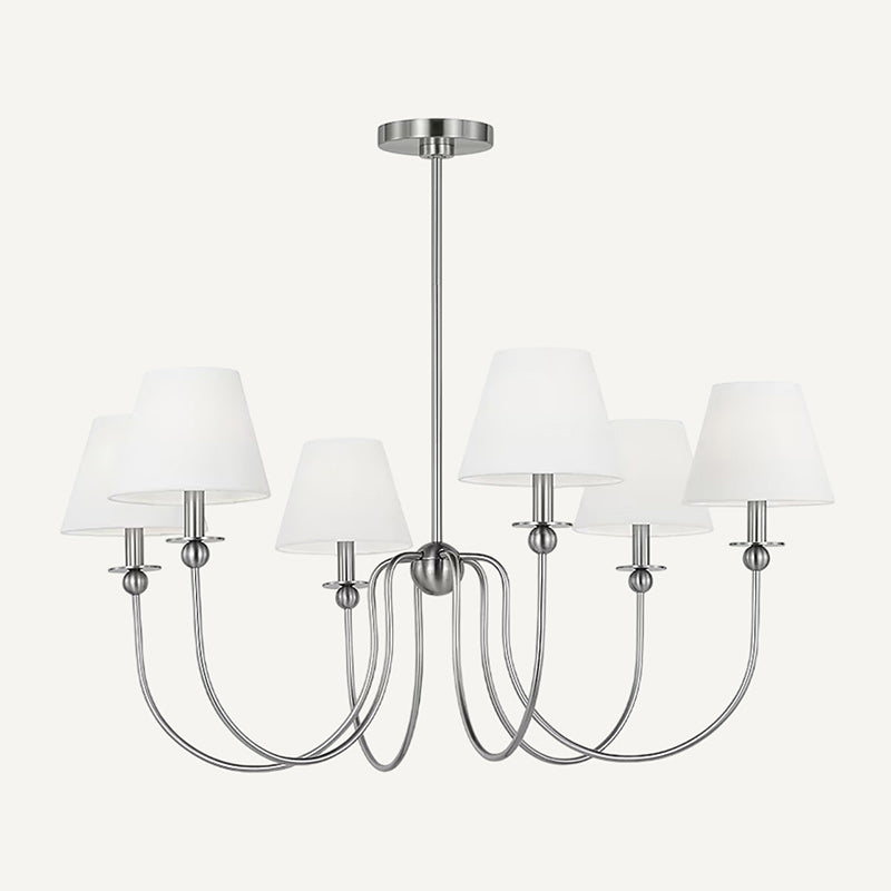 The Elsay Chandelier updates the classic chandelier with the elegantly deep curves of its J-shaped arms. Subtle spherical and cylindrical details create a new sense of traditional aesthetics, enhanced by fabric shades that lend a soft finish. This chandelier will create a sophisticated statement in dining rooms, living rooms and bedrooms alike.