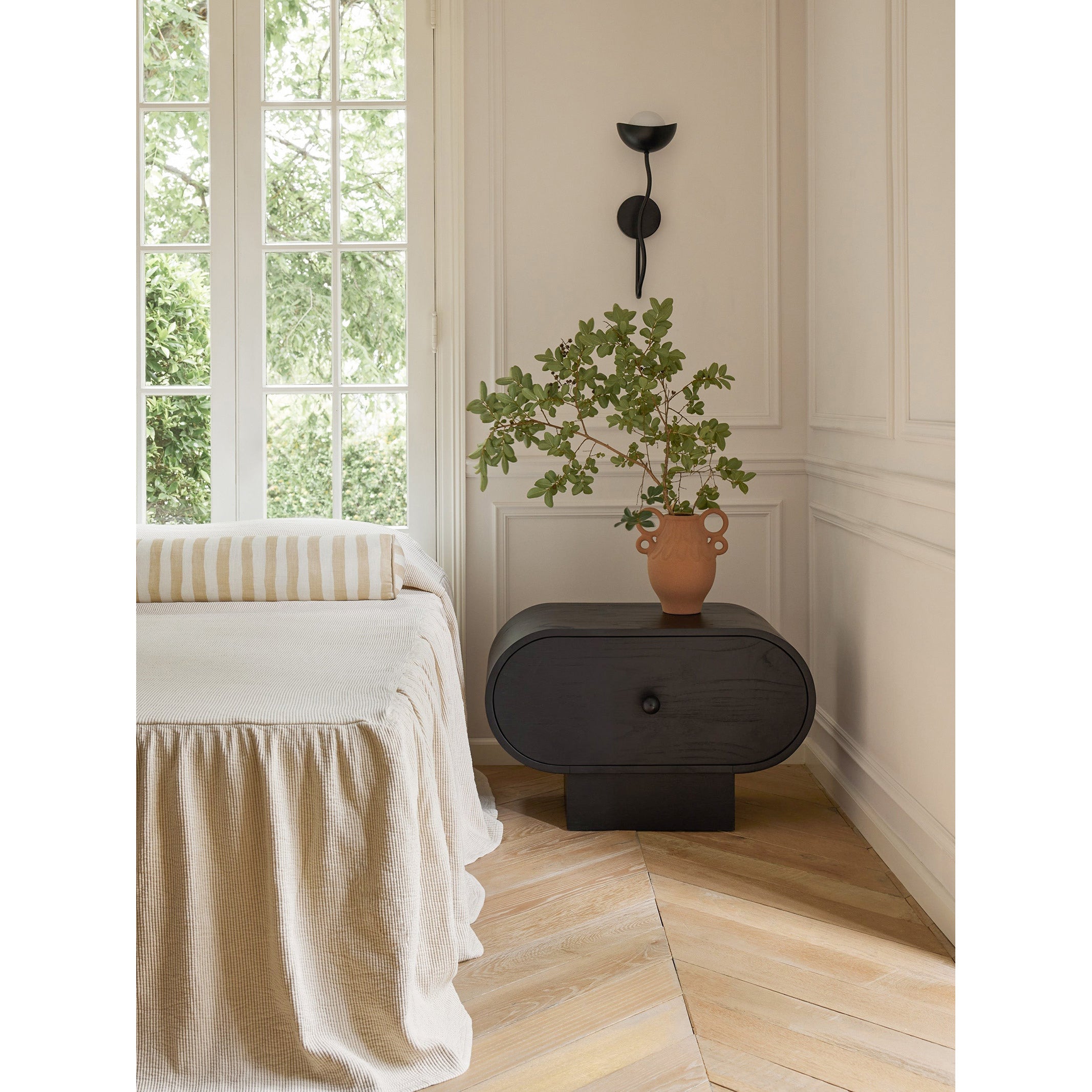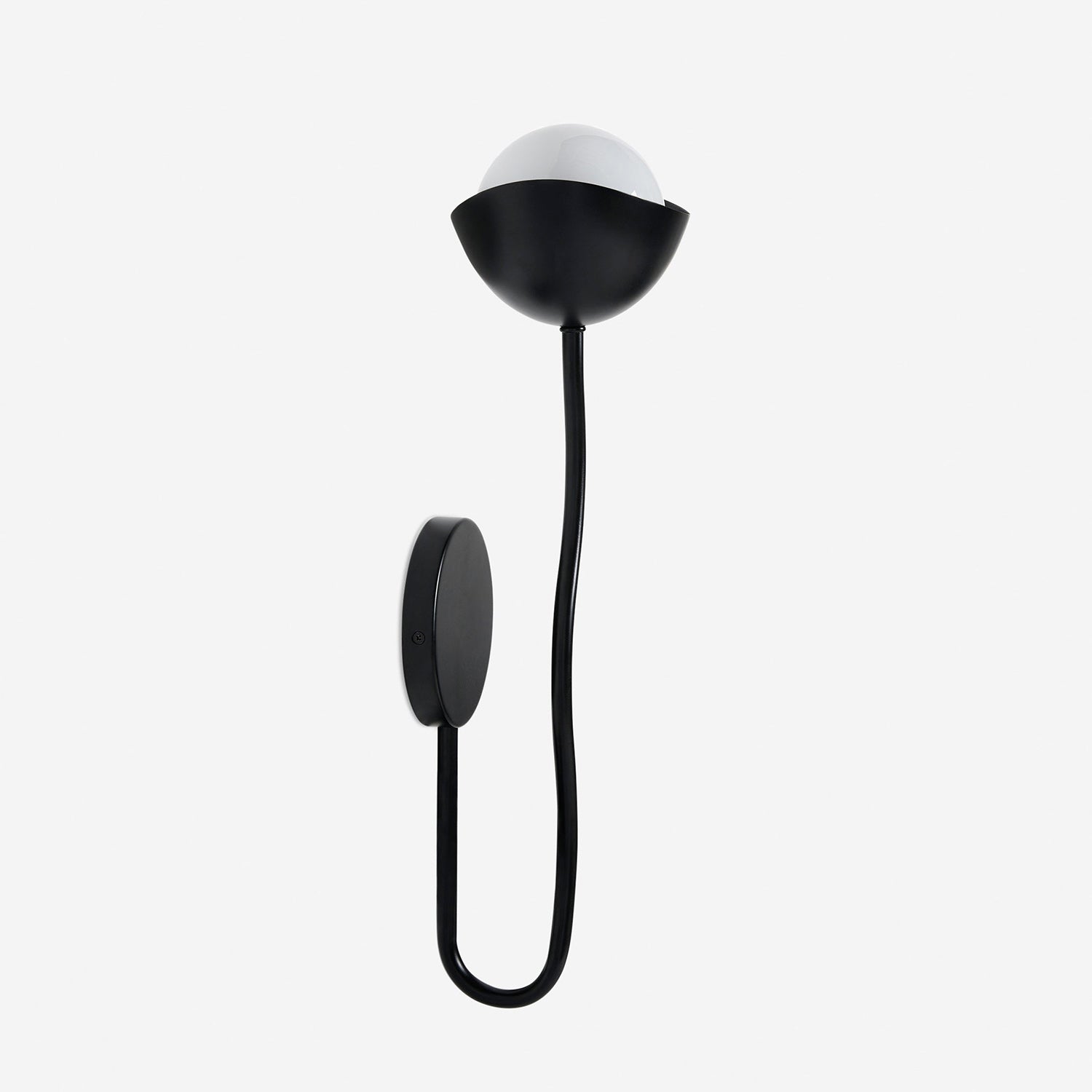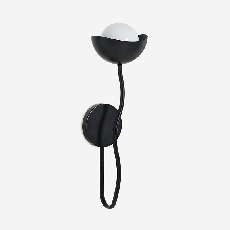 The Kukka Curve Wall Lamp blends playful charm with sophisticated design. Its undulating arm supports an opal glass orb paired with a scoop shade, creating a distinctive aesthetic ideal for contemporary interiors.