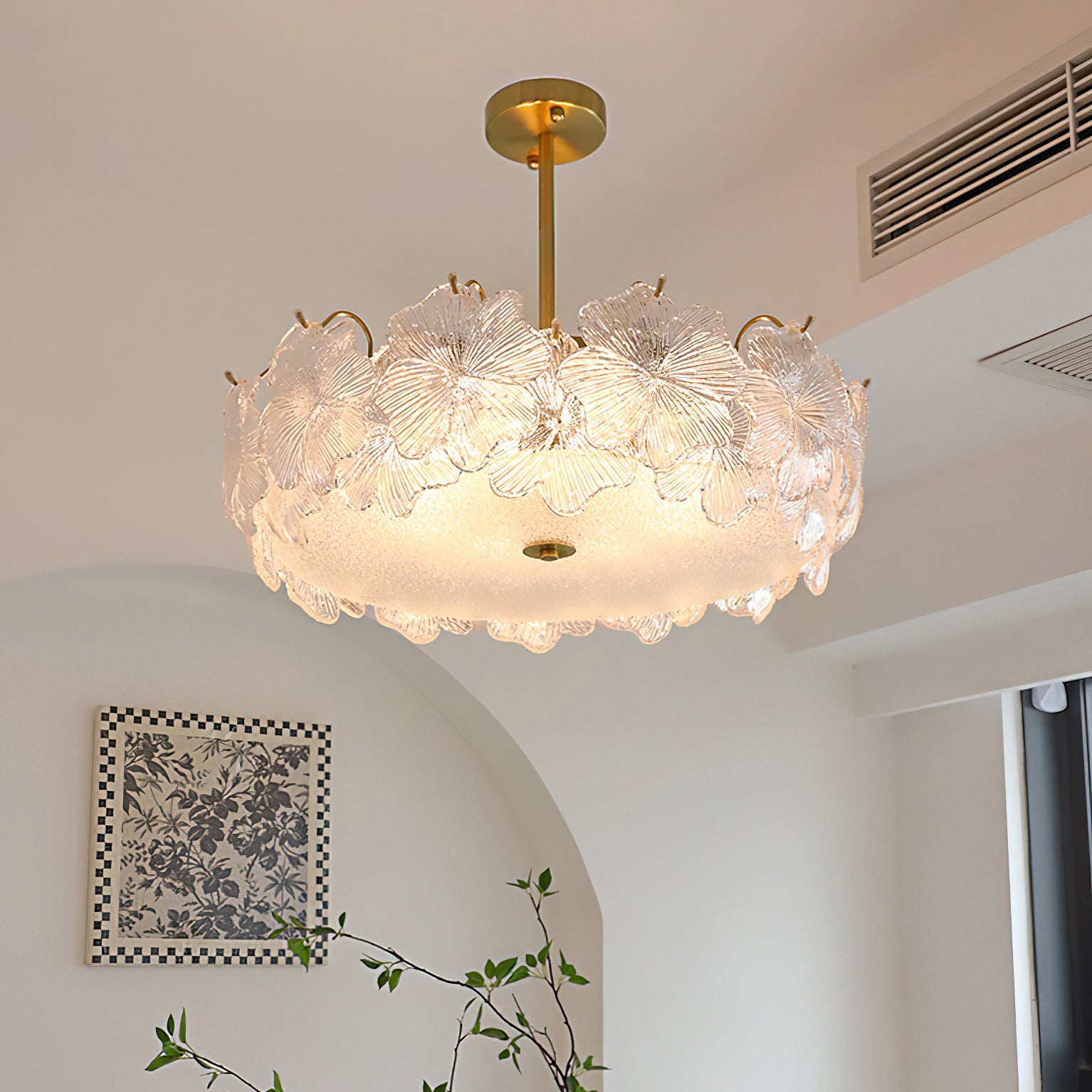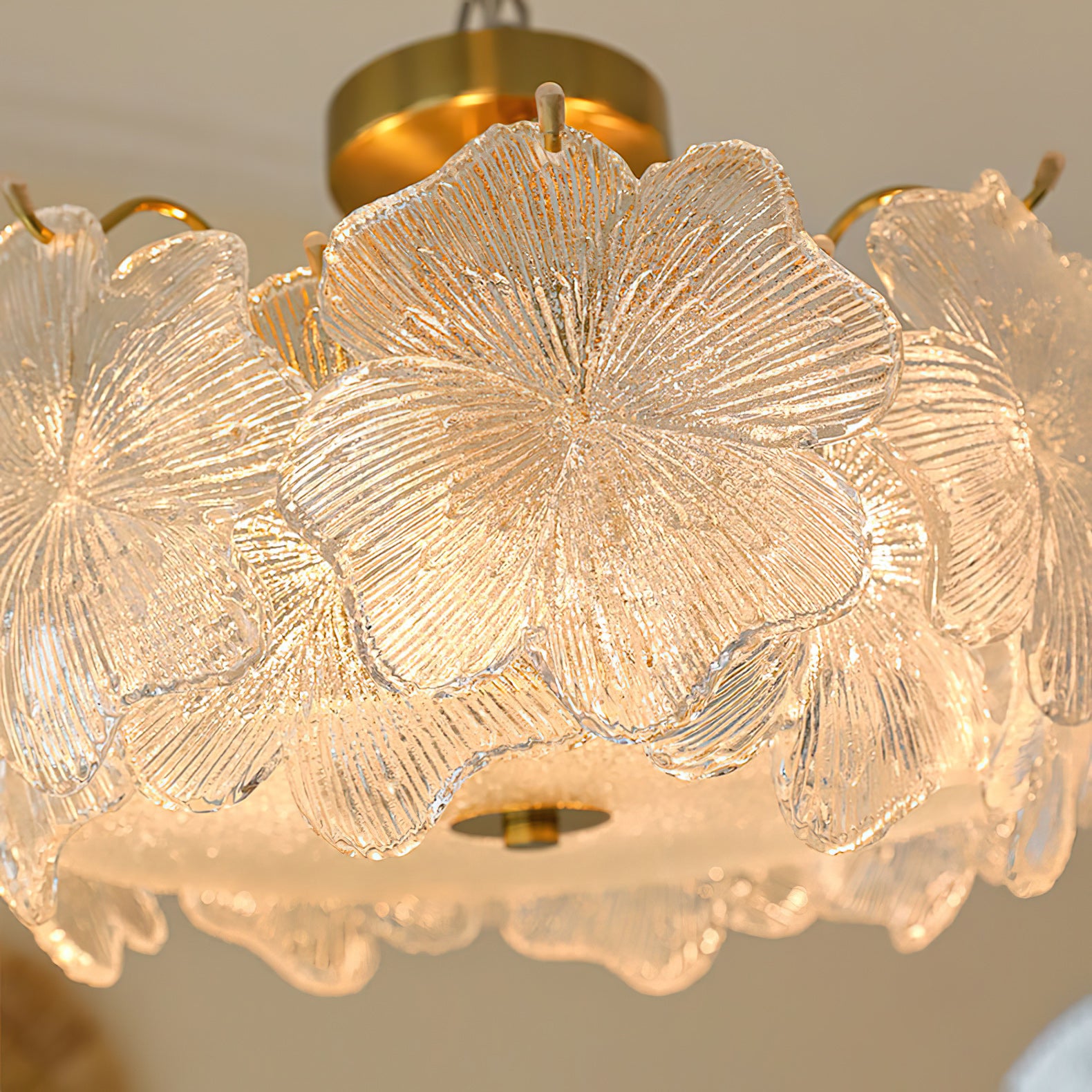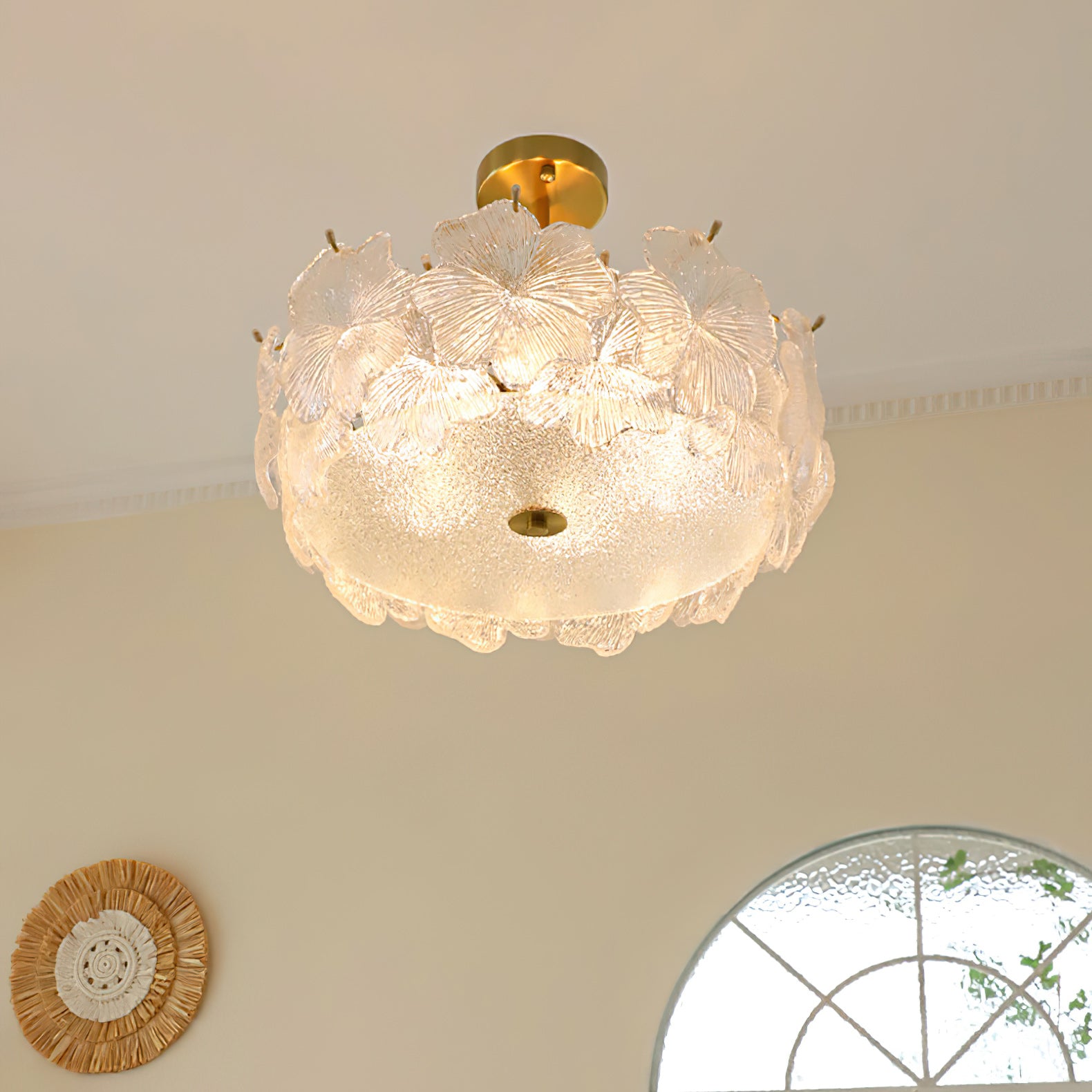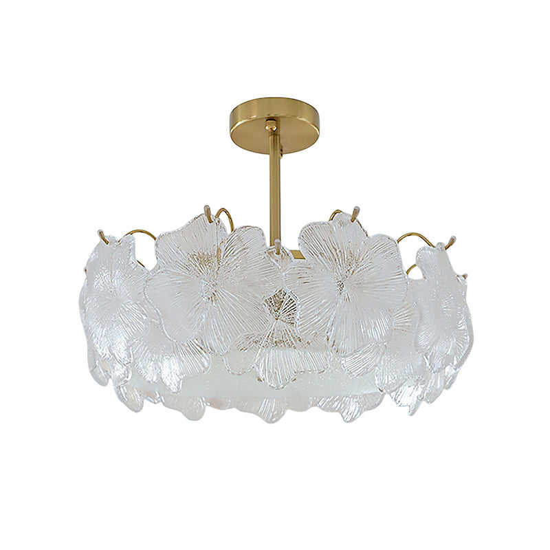 The Four-Leaf Clover Glass Ceiling Lamp features glass as its main shade. Its translucent yet non-glaring texture accurately simulates the warmth and translucence of a four-leaf clover bathed in sunlight. The golden lamp frame balances the glass shade, elevating the ambiance to a refined finish.