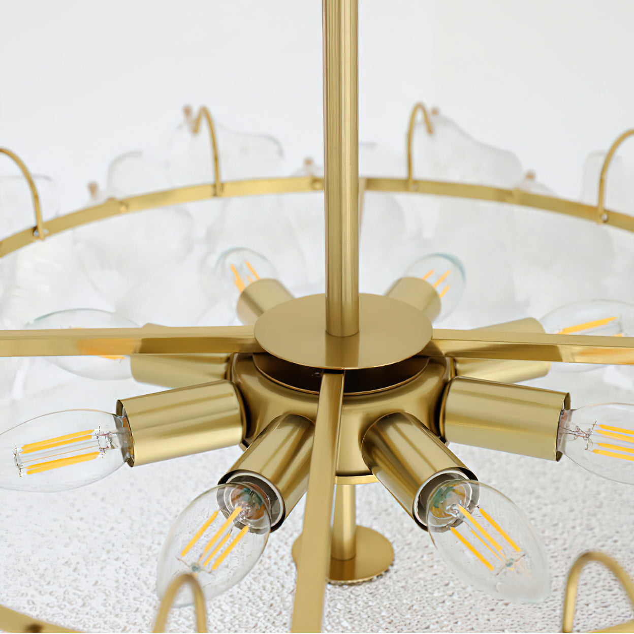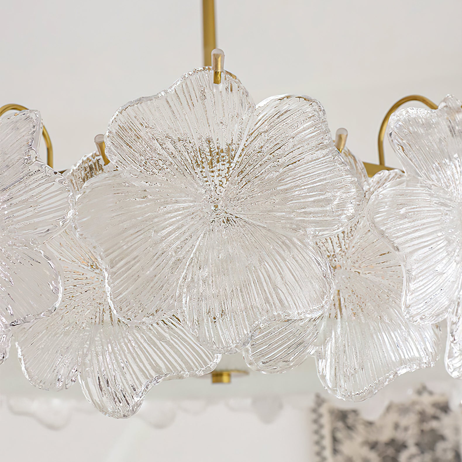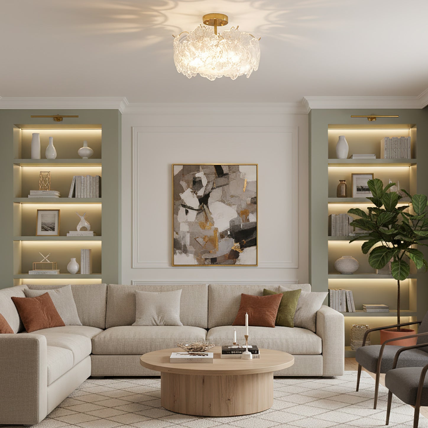 The Four-Leaf Clover Glass Ceiling Lamp features glass as its main shade. Its translucent yet non-glaring texture accurately simulates the warmth and translucence of a four-leaf clover bathed in sunlight. The golden lamp frame balances the glass shade, elevating the ambiance to a refined finish.