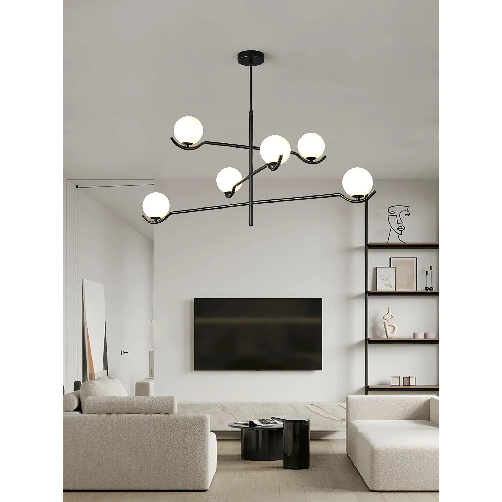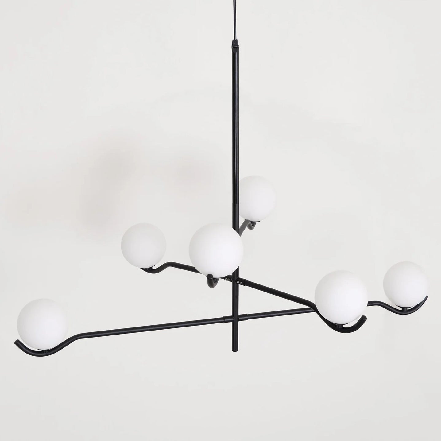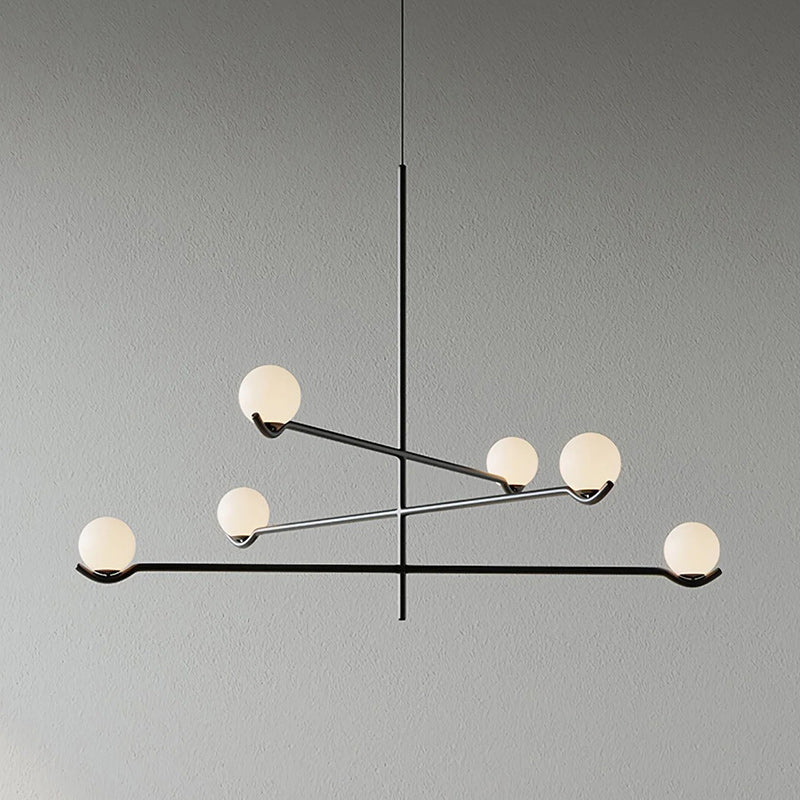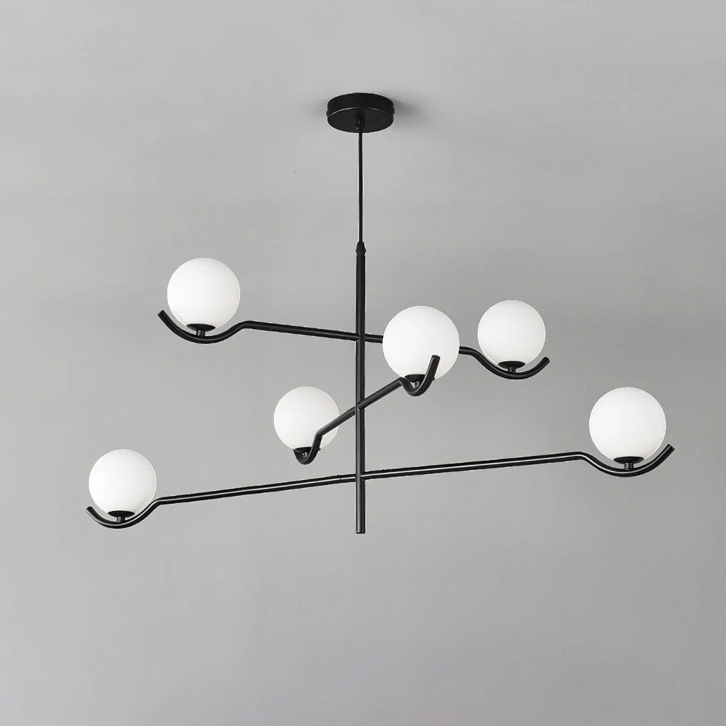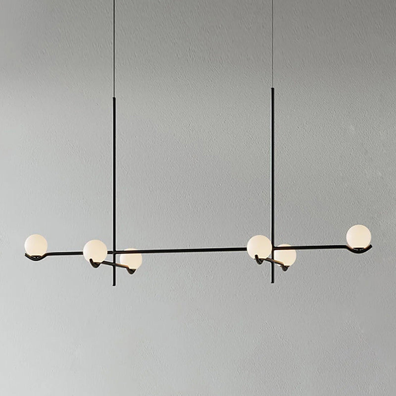 The Baer Branching Pendant Light is a masterclass in geometric balance and linear precision. Featuring a sleek, black metal frame that extends into an asymmetrical branching structure, it cradles soft-white frosted glass globes. This striking silhouette provides a sophisticated, glare-free glow, making it an ideal centerpiece for modern dining rooms, expansive living areas, or professional creative studios looking for a touch of architectural elegance.