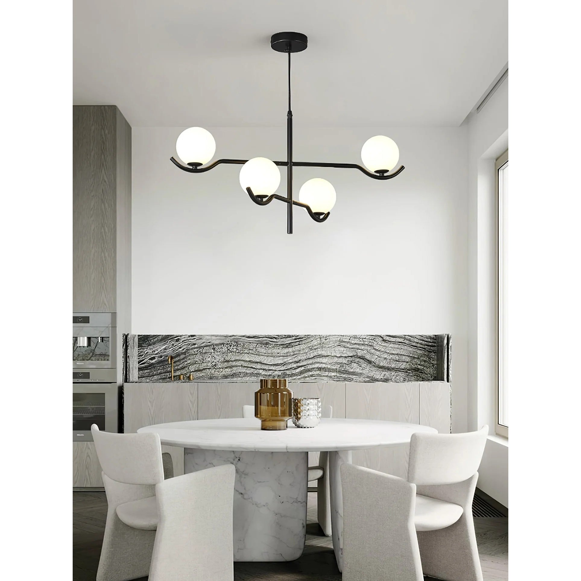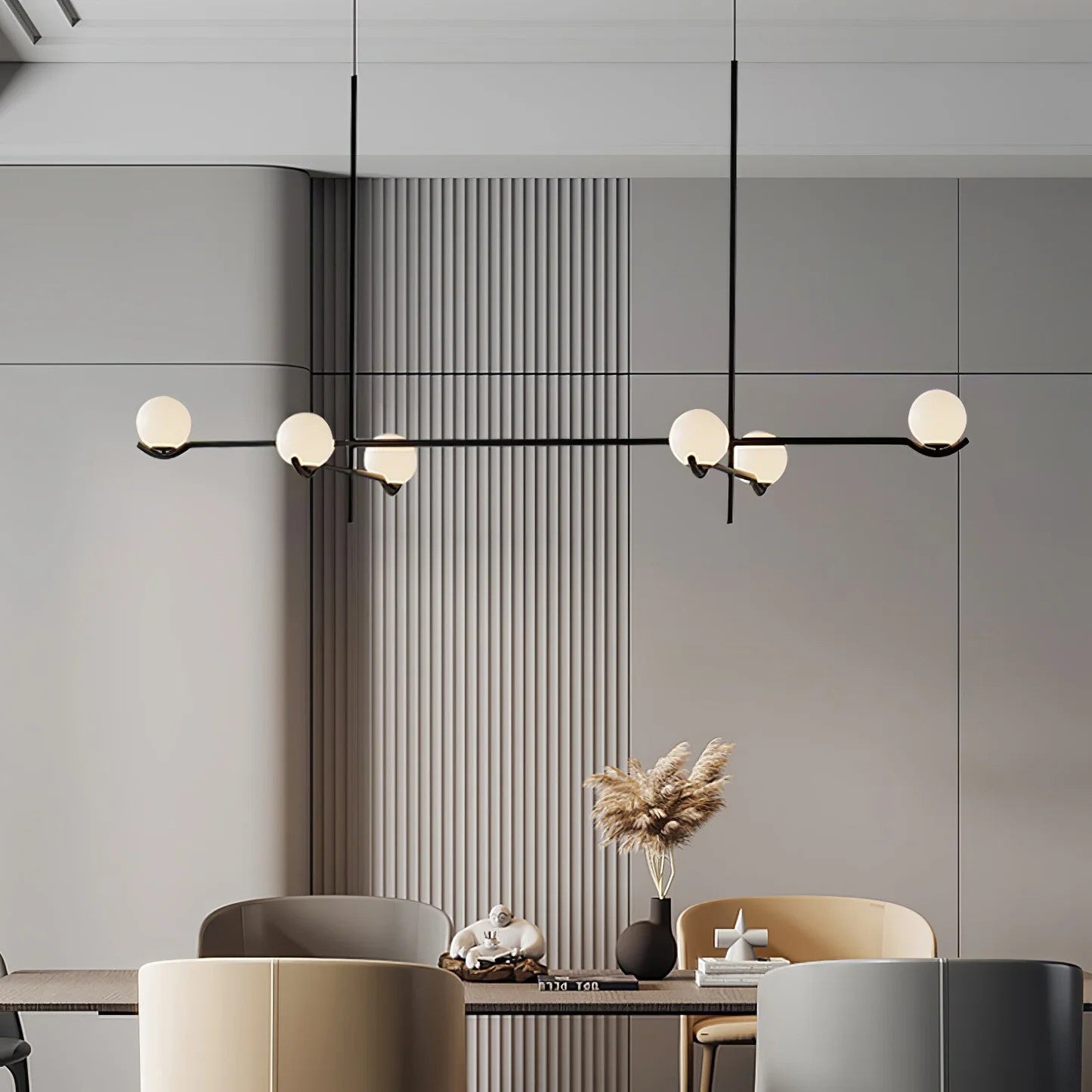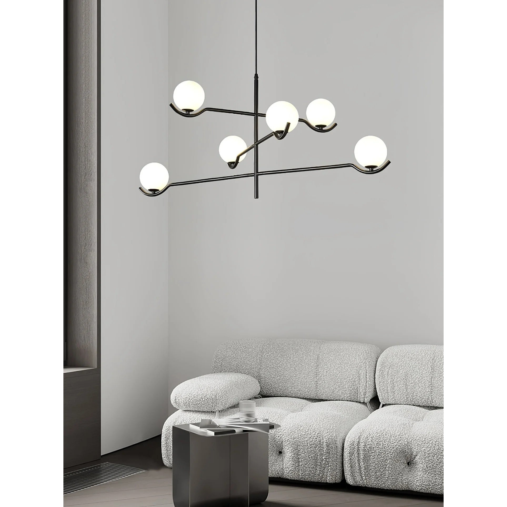 The Baer Branching Pendant Light is a masterclass in geometric balance and linear precision. Featuring a sleek, black metal frame that extends into an asymmetrical branching structure, it cradles soft-white frosted glass globes. This striking silhouette provides a sophisticated, glare-free glow, making it an ideal centerpiece for modern dining rooms, expansive living areas, or professional creative studios looking for a touch of architectural elegance.