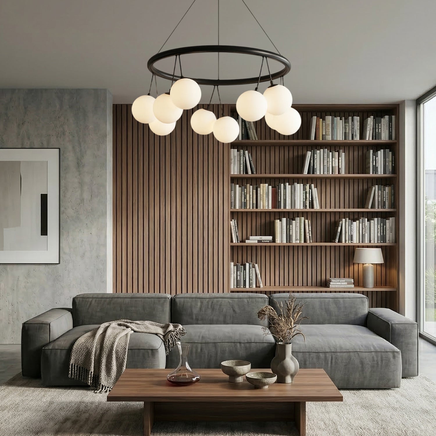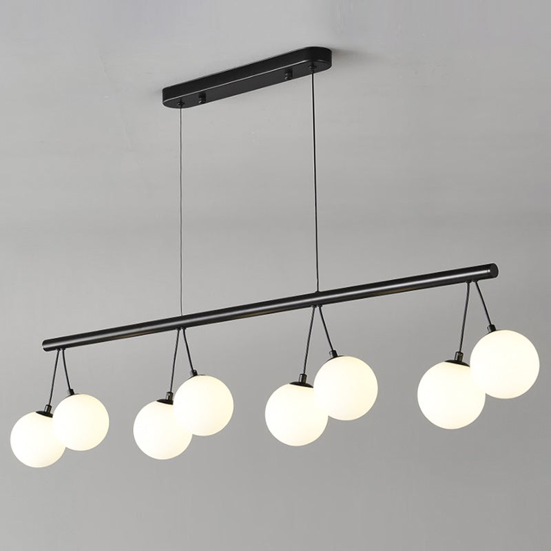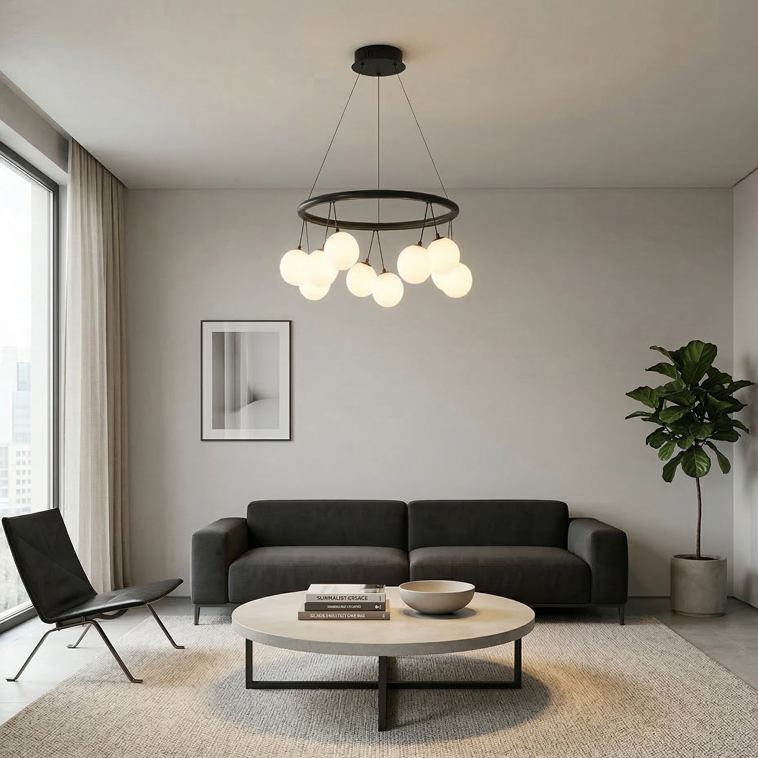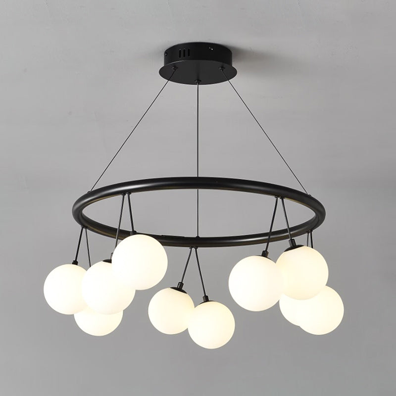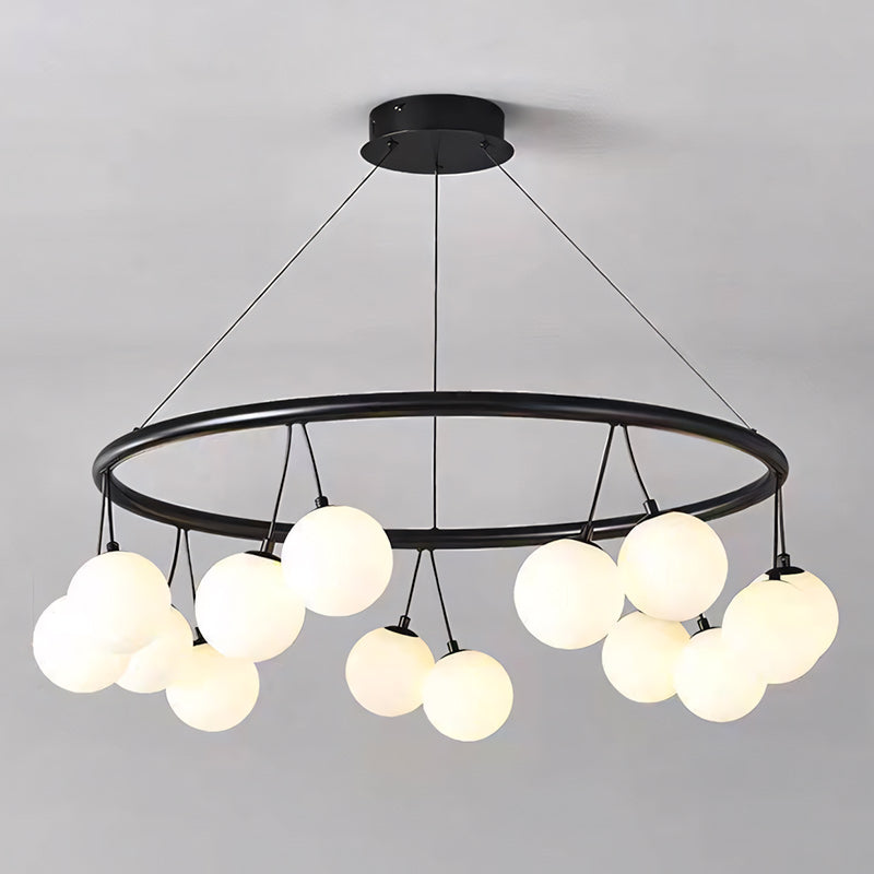 Elevate your space with this striking modern Luna Halo Chandelier. Featuring a sleek, matte black frame, it elegantly suspends a cluster of frosted white glass globe shades. This statement pendant light provides a soft, diffused, and ambient glow, making it the perfect architectural centerpiece for contemporary dining rooms, minimalist entryways, or stylish living spaces.