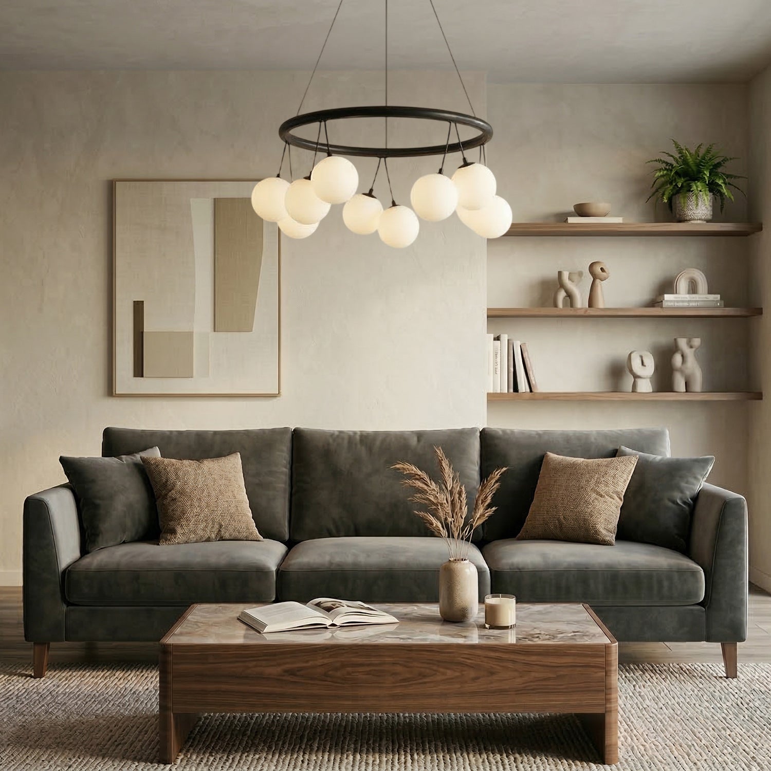 • This chandelier balances the bold, structured look of a black metal halo with the soft, ethereal float of glowing orbs.