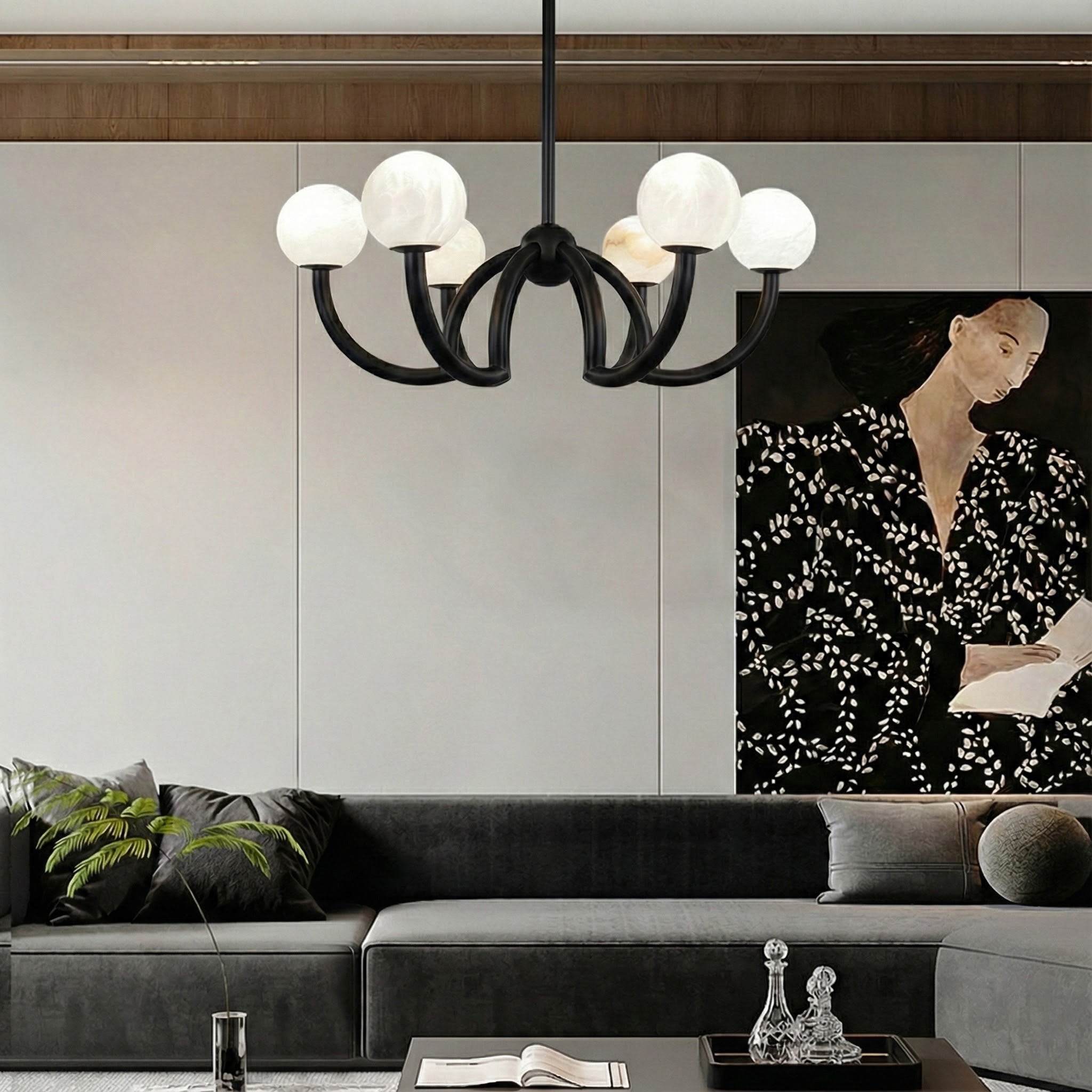 The Romaine Alabaster Chandelier is a lighting masterpiece that blends classical and modern aesthetics. It features sculpted, curved arms that form an organic shape reminiscent of a blooming flower. Each arm is tipped with a unique natural alabaster spherical lampshade. When light shines through the naturally veined alabaster, it emits a warm and soft glow. The strong black lines contrast sharply with the gentle luminescence of the alabaster, creating a luxurious yet tranquil atmosphere.